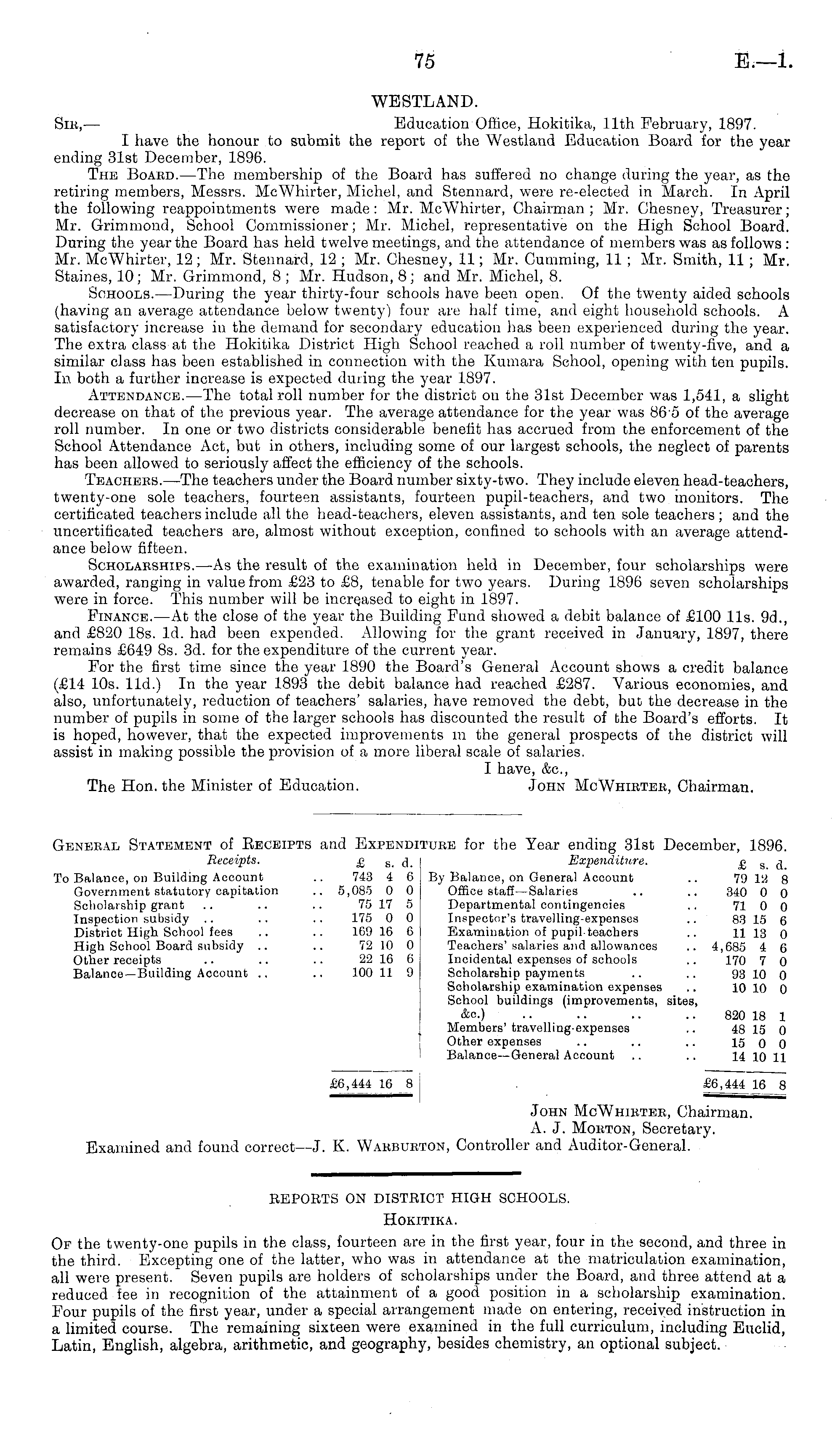 WESTLAND. Sik, — Education Office, Hokitika, 11th February, 1897. I have the honour to submit the report of the Westland Education Board for the year ending 31st December, 1896. The Board. —The membership of the Board has suffered no change during the year, as the retiring members, Messrs. McWhirter, Michel, and Stennard, were re-elected in March. In April the following reappointments were made : Mr. McWhirter, Chairman ; Mr. Chesney, Treasurer; Mr. Grimmond, School Commissioner; Mr. Michel, representative on the High School Board. During the year the Board has held twelve meetings, and the attendance of members was as follows : Mr. McWhirter, 12 ; Mr. Stennard, 12 ; Mr. Chesney, 11; Mr. Gumming, 11 ; Mr. Smith, 11; Mr. Staines, 10; Mr. Grimmond, 8 ; Mr. Hudson, 8; and Mr. Michel, 8. Schools.—During the year thirty-four schools have been open. Of the twenty aided schools (having an average attendance below twenty) four are half time, and eight household schools. A satisfactory increase in the demand for secondary education has been experienced during the year. The extra class at the Hokitika District High School reached a roll number of twenty-five, and a similar class has been established in connection with the Kumara School, opening with ten pupils. In both a further increase is expected during the year 1897. Attendance. —The total roll number for the district on the 31st December was 1,541, a slight decrease on that of the previous year. The average attendance for the year was 865 of the average roll number. In one or two districts considerable benefit has accrued from the enforcement of the School Attendance Act, but in others, including some of our largest schools, the neglect of parents has been allowed to seriously affect the efficiency of the schools. Teachers. —The teachers under the Board number sixty-two. They include eleven head-teachers, twenty-one sole teachers, fourteen assistants, fourteen pupil-teachers, and two monitors. The certificated teachers include all the head-teachers, eleven assistants, and ten sole teachers ; and the uncertificated teachers are, almost without exception, confined to schools with an average attendance below fifteen. Scholarships.—As the result of the examination held in December, four scholarships were awarded, ranging in value from £23 to £8, tenable for two years. During 1896 seven scholarships were in force. This number will be increased to eight in 1897. Finance.—At the close of the year the Building Fund showed a debit balance of £100 lls. 9d., and £820 18s. Id. had been expended. Allowing for the grant received in January, 1897, there remains £649 Bs. 3d. for the expenditure of the current year. For the first time since the year 1890 the Board's General Account shows a credit balance (£l4 10s. lid.) In the year 1893 the debit balance had reached £287. Various economies, and also, unfortunately, reduction of teachers' salaries, have removed the debt, but the decrease in the number of pupils in some of the larger schools has discounted the result of the Board's efforts. It is hoped, however, that the expected improvements in the general prospects of the district will assist in making possible the provision of a more liberal scale of salaries. I have, &c, The Hon. the Minister of Education. John McWhirter, Chairman.