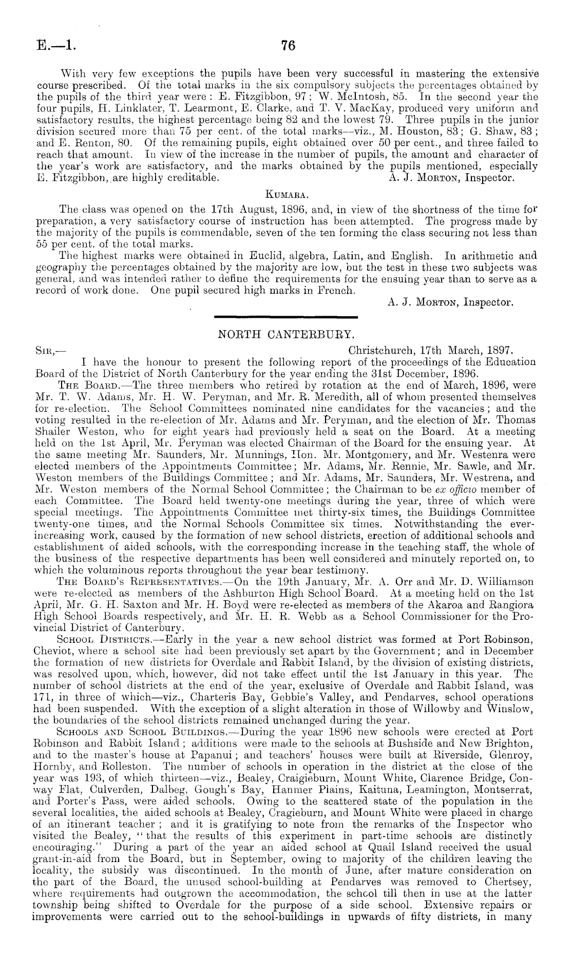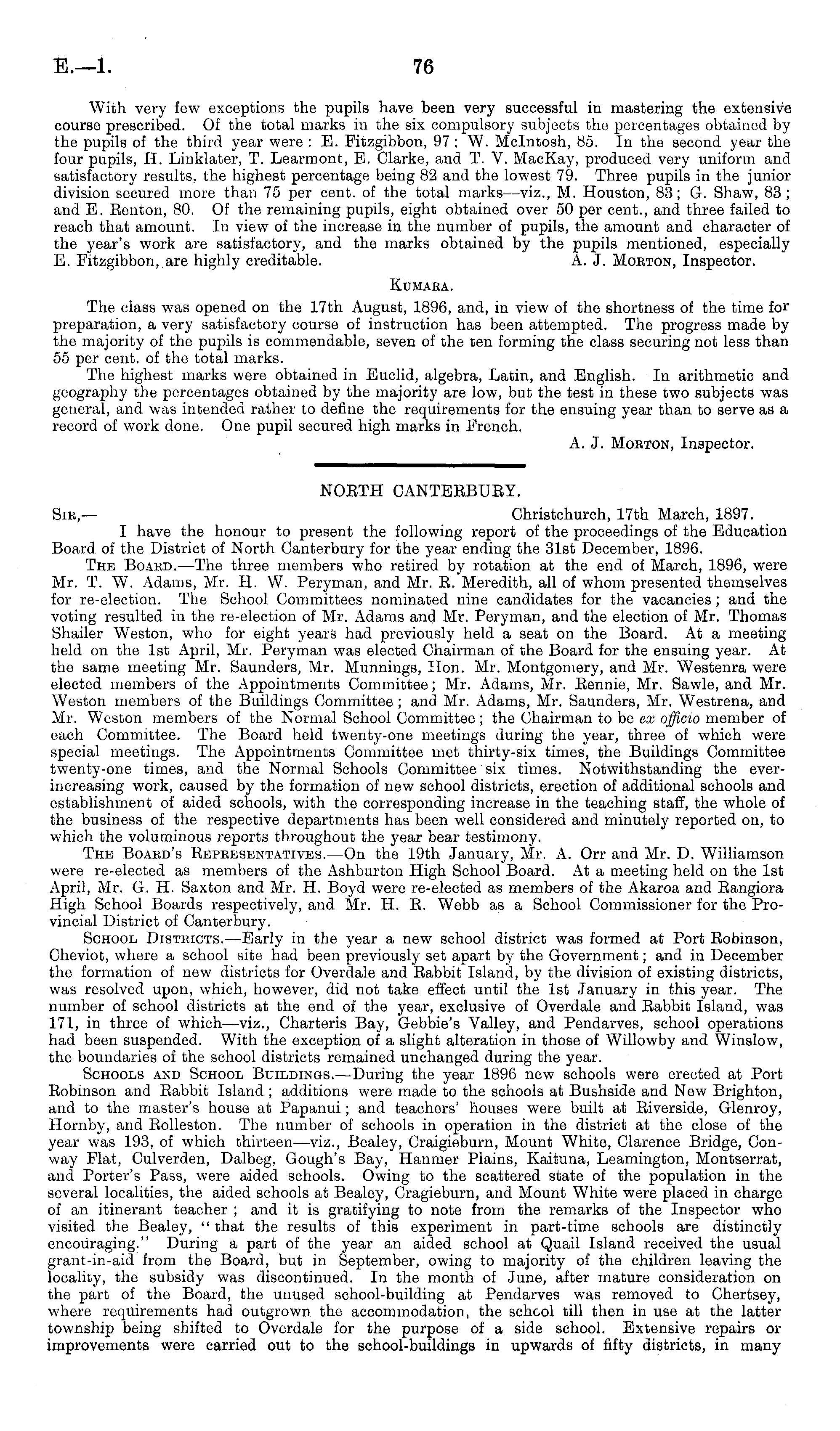 With very few exceptions the pupils have been very successful in mastering the extensive course prescribed. Of the total marks in the six compulsory subjects the percentages obtained by the pupils of the third year were :E. Fitzgibbon, 97 ;W. Mclntosh, 85. In the second year the four pupils, H. Linklater, T. Learmont, E. Clarke, and T. V. MacKay, produced very uniform and satisfactory results, the highest percentage being 82 and the lowest 79. Three pupils in the junior division secured more than 75 per cent, of the total marks —viz., M. Houston, 83; G. Shaw, 83; and E. Renton, 80. Of the remaining pupils, eight obtained over 50 per cent., and three failed to reach that amount. In view of the increase in the number of pupils, the amount and character of the year's work are satisfactory, and the marks obtained by the pupils mentioned, especially E. Fitzgibbon,.are highly creditable. A. J. Mokton, Inspector. Kumaba. The class was opened on the 17th August, 1896, and, in view of the shortness of the time for preparation, a very satisfactory course of instruction has been attempted. The progress made by the majority of the pupils is commendable, seven of the ten forming the class securing not less than 55 per cent, of the total marks. The highest marks were obtained in Euclid, algebra, Latin, and English. In arithmetic and geography the percentages obtained by the majority are low, but the test in these two subjects was general, and was intended rather to define the requirements for the ensuing year than to serve as a record of work done. One pupil secured high marks in French. A. J. Moeton, Inspector.