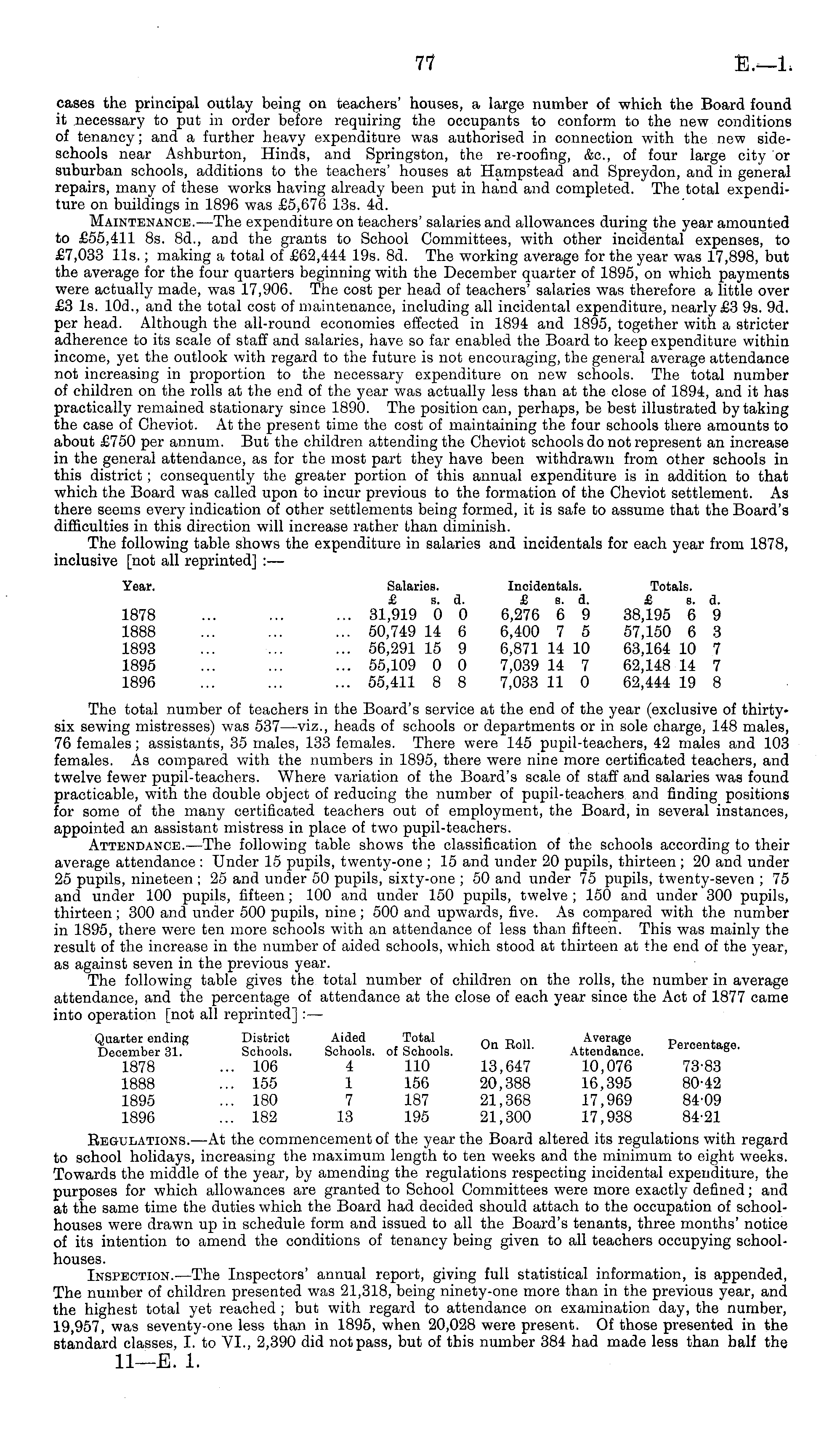 cases the principal outlay being on teachers' houses, a large number of which the Board found it necessary to put in order before requiring the occupants to conform to the new conditions of tenancy; and a further heavy expenditure was authorised in connection with the new sideschools near Ashburton, Hinds, and Springston, the re-roofing, &c, of four large city or suburban schools, additions to the teachers' houses at Hampstead and Spreydon, and in general repairs, many of these works having already been put in hand and completed. The total expenditure on buildings in 1896 was £5,676 13s. 4d. Maintenance.—The expenditure on teachers' salaries and allowances during the year amounted to £55,411 Bs. Bd., and the grants to School Committees, with other incidental expenses, to £7,033 11s.; making a total of £62,444 19s. Bd. The working average for the year was 17,898, but the average for the four quarters beginning with the December quarter of 1895, on which payments were actually made, was 17,906. The cost per head of teachers' salaries was therefore a little over £3 Is. 10d., and the total cost of maintenance, including all incidental expenditure, nearly £3 9s. 9d. per head. Although the all-round economies effected in 1894 and 1895, together with a stricter adherence to its scale of staff and salaries, have so far enabled the Board to keep expenditure within income, yet the outlook with regard to the future is not encouraging, the general average attendance not increasing in proportion to the necessary expenditure on new schools. The total number of children on the rolls at the end of the year was actually less than at the close of 1894, and it has practically remained stationary since 1890. The position can, perhaps, be best illustrated by taking the case of Cheviot. At the present time the cost of maintaining the four schools there amounts to about £750 per annum. But the children attending the Cheviot schools do not represent an increase in the general attendance, as for the most part they have been withdrawn from other schools in this district; consequently the greater portion of this annual expenditure is in addition to that which the Board was called upon to incur previous to the formation of the Cheviot settlement. As there seems every indication of other settlements being formed, it is safe to assume that the Board's difficulties in this direction will increase rather than diminish. The following table shows the expenditure in salaries and incidentals for each year from 1878, inclusive [not all reprinted] : — Year. Salaries. Incidentals. Totals. £ s. a. £ s. a. £ s. a. 1878 ... ... ... 31,919 0 0 6,276 6 9 38,195 6 9 1888 ... ... ... 50,749 14 6 6,400 7 5 57,150 6 3 1893 ... 56,291 15 9 6,871 14 10 63,164 10 7 1895 55,109 0 0 7,039 14 7 62,148 14 7 1896 ... ... ... 55,411 8 8 7,033 11 0 62,444 19 8 The total number of teachers in the Board's service at the end of the year (exclusive of thirtysix sewing mistresses) was 537 —viz., heads of schools or departments or in sole charge, 148 males, 76 females; assistants, 35 males, 133 females. There were 145 pupil-teachers, 42 males and 103 females. As compared with the numbers in 1895, there were nine more certificated teachers, and twelve fewer pupil-teachers. Where variation of the Board's scale of staff and salaries was found practicable, with the double object of reducing the number of pupil-teachers and finding positions for some of the many certificated teachers out of employment, the Board, in several instances, appointed an assistant mistress in place of two pupil-teachers. Attendance. —The following table shows the classification of the schools according to their average attendance : Under 15 pupils, twenty-one ; 15 and under 20 pupils, thirteen ; 20 and under 25 pupils, nineteen ; 25 and under 50 pupils, sixty-one ; 50 and under 75 pupils, twenty-seven ; 75 and under 100 pupils, fifteen ; 100 and under 150 pupils, twelve ; 150 and under 300 pupils, thirteen; 300 and under 500 pupils, nine; 500 and upwards, five. As compared with the number in 1895, there were ten more schools with an attendance of less than fifteen. This was mainly the result of the increase in the number of aided schools, which stood at thirteen at the end of the year, as against seven in the previous year. The following table gives the total number of children on the rolls, the number in average attendance, and the percentage of attendance at the close of each year since the Act of 1877 came into operation [not all reprinted] : — Quarter ending District Aiaea Total n m Average p . December 31. Schools. Schools, of Schools. Un uon ' Attendance. percentage. 1878 ... 106 4 110 13,647 10,076 73-83 1888 ... 155 1 156 20,388 16,395 80-42 1895 ... 180 7 187 21,368 17,969 84-09 1896 ... 182 13 195 21,300 17,938 84-21 Regulations.—At the commencement of the year the Board altered its regulations with regard to school holidays, increasing the maximum length to ten weeks and the minimum to eight weeks. Towards the middle of the year, by amending the regulations respecting incidental expenditure, the purposes for which allowances are granted to School Committees were more exactly defined; and at the same time the duties which the Board had decided should attach to the occupation of schoolhouses were drawn up in schedule form and issued to all the Board's tenants, three months' notice of its intention to amend the conditions of tenancy being given to all teachers occupying schoolhouses. Inspection.—The Inspectors' annual report, giving full statistical information, is appended, The number of children presented was 21,318, being ninety-one more than in the previous year, and the highest total yet reached ; but with regard to attendance on examination day, the number, 19,957, was seventy-one less than in 1895, when 20,028 were present. Of those presented in the standard classes, I. to VI., 2,390 did not pass, but of this number 384 had made less than h