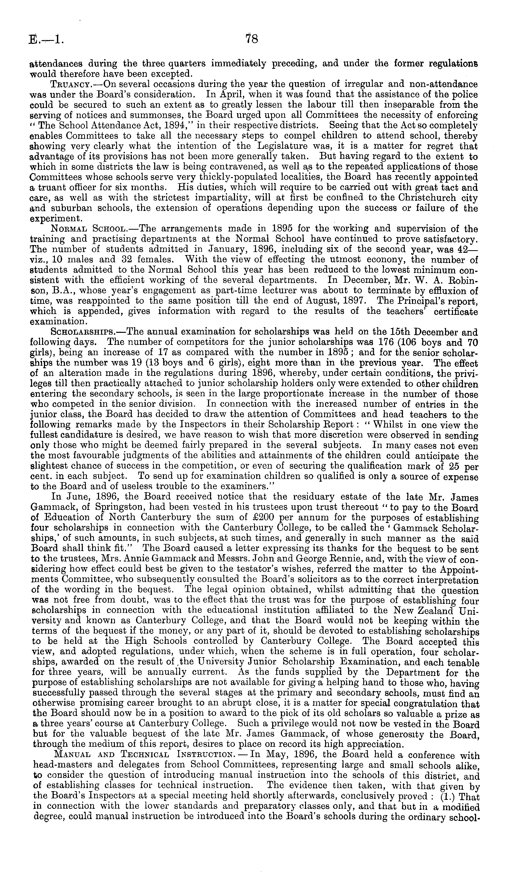 attendances during the three quarters immediately preceding, and under the former regulations would therefore have been excepted. Tbuancy.—On several occasions during the year the question of irregular and non-attendance was under the Board's consideration. In April, when it was found that the assistance of the police could be secured to such an extent as to greatly lessen the labour till then inseparable from the serving of notices and summonses, the Board urged upon all Committees the necessity of enforcing " The School Attendance Act, 1894," in their respective districts. Seeing that the Act so completely enables Committees to take all the necessary steps to compel children to attend school, thereby showing very clearly what the intention of the Legislature was, it is a matter for regret that advantage of its provisions has not been more generally taken. But having regard to the extent to which in some districts the law is being contravened, as well as to the repeated applications of those Committees whose schools serve very thickly-populated localities, the Board has recently appointed a truant officer for six months. His duties, which will require to be carried out with great tact and care, as well as with the strictest impartiality, will at first be confined to the Christchurch city and suburban schools, the extension of operations depending upon the success or failure of the experiment. Noemal School.—The arrangements made in 1895 for the working and supervision of the training and practising departments at the Normal School have continued to prove satisfactory. The number of students admitted in January, 1896, including six of the second year, was 42— viz., 10 males and 32 females. With the view of effecting the utmost econony, the number of students admitted to the Normal School this year has been reduced to the lowest minimum consistent with the efficient working of the several departments. In December, Mr. W. A. Robinson, 8.A., whose year's engagement as part-time lecturer was about to terminate by effluxion of time, was reappointed to the same position till the end of August, 1897. The Principal's report, which is appended, gives information with regard to the results of the teachers' certificate examination. Scholaeships.—The annual examination for scholarships was held on the 15th December and following days. The number of competitors for the junior scholarships was 176 (106 boys and 70 girls), being an increase of 17 as compared with the number in 1895; and for the senior scholarships the number was 19 (13 boys and 6 girls), eight more than in the previous year. The effect of an alteration made in the regulations during 1896, whereby, under certain conditions, the privileges till then practically attached to junior scholarship holders only were extended to other children entering the secondary schools, is seen in the large proportionate increase in the number of those who competed in the senior division. In connection with the increased number of entries in the junior class, the Board has decided to draw the attention of Committees and head teachers to the following remarks made by the Inspectors in their Scholarship Eeport : " Whilst in one view the fullest candidature is desired, we have reason to wish that more discretion were observed in sending only those who might be deemed fairly prepared in the several subjects. In many cases not even the most favourable judgments of the abilities and attainments of the children could anticipate the slightest chance of success in the competition, or even of securing the qualification mark of 25 per cent, in each subject. To send up for examination children so qualified is only a source of expense to the Board and of useless trouble to the examiners." In June, 1896, the Board received notice that the residuary estate of the late Mr. James Gammack, of Springston, had been vested in his trustees upon trust thereout "to pay to the Board of Education of North Canterbury the sum of £200 per annum for the purposes of establishing four scholarships in connection with the Canterbury College, to be called the ' Gammack Scholarships,' of such amounts, in such subjects, at such times, and generally in such manner as the said Board shall think fit." The Board caused a letter expressing its thanks for the bequest to be sent to the trustees, Mrs. Annie Gammack and Messrs. John and George Eennie, and, with the view of considering how effect could best be given to the testator's wishes, referred the matter to the Appointments Committee, who subsequently consulted the Board's solicitors as to the correct interpretation of the wording in the bequest. The legal opinion obtained, whilst admitting that the question was not free from doubt, was to the effect that the trust was for the purpose of establishing four scholarships in connection with the educational institution affiliated to the New Zealand University and known as Canterbury College, and that the Board would not be keeping within the terms of the bequest if the money, or any part of it, should be devoted to establishing scholarships to be held at the High Schools controlled by Canterbury College. The Board accepted this view, and adopted regulations, under which, when the scheme is in full operation, four scholarships, awarded on the result of .the University Junior Scholarship Examination, and each tenable for three years, will be annually current. As the funds supplied by the Department for the purpose of establishing scholarships are not available for giving a helping hand to those who, having successfully passed through the several stages at the primary and secondary schools, must find an otherwise promising career brought to an abrupt close, it is a matter for special congratulation that the Board should now be in a position to award to the pick of its old scholars so valuable a prize as a three years' course at Canterbury College. Such a privilege would not now be vested in the 