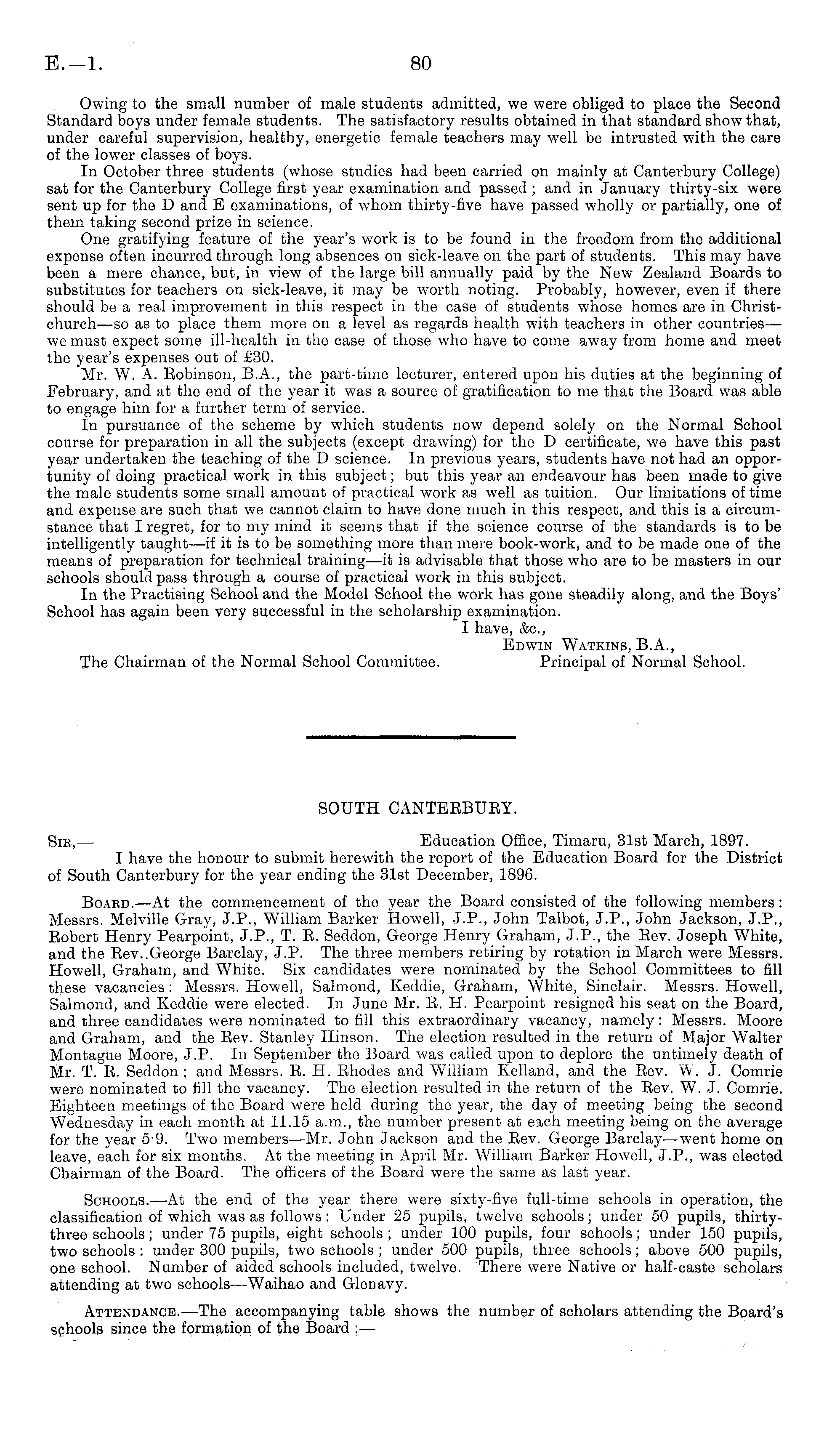 SOUTH CANTEEBUEY. Sib,— Education Office, Timaru, 31st March, 1897. I have the honour to submit herewith the report of the Education Board for the District of South Canterbury for the year ending the 31st December, 1896. Boaed. —At the commencement of the year the Board consisted of the following members: Messrs. Melville Gray, J.P., William Barker Howell, J.P., John Talbot, J. P., John Jackson, J.P., Eobert Henry Pearpoint, J. P., T. E. Seddon, George Henry Graham, J. P., the Eev. Joseph White, and the Eev..George Barclay, J. P. The three members retiring by rotation in March were Messrs. Howell, Graham, and White. Six candidates were nominated by the School Committees to fill these vacancies : Messrs. Howell, Salmond, Keddie, Graham, White, Sinclair. Messrs. Howell, Salmond, and Keddie were elected. In June Mr. E. H. Pearpoint resigned his seat on the Board, and three candidates were nominated to fill this extraordinary vacancy, namely : Messrs. Moore and Graham, and the Eev. Stanley Hinson. The election resulted in the return of Major Walter Montague Moore, J. P. In September the Board was called upon to deplore the untimely death of Mr. T. E. Seddon ; and Messrs. E. H. Ehodes and William Kelland, and the Eev. W. J. Comrie were nominated to fill the vacancy. The election resulted in the return of the Eev. W. J. Comrie. Eighteen meetings of the Board were held during the year, the day of meeting being the second Wednesday in each month at 11.15 a.m., the number present at each meeting being on the average for the year 59. Two members—Mr. John Jackson and the Eev. George Barclay-—went home on leave, each for six months. At the meeting in April Mr. William Barker Howell, J. P., was elected Chairman of the Board. The officers of the Board were the same as last year. Schools. —At the end of the year there were sixty-five full-time schools in operation, the classification of which was as follows : Under 25 pupils, twelve schools; under 50 pupils, thirtythree schools; under 75 pupils, eight schools ; under 100 pupils, four schools; under 150 pupils, two schools : under 300 pupils, two schools ; under 500 pupils, three schools; above 500 pupils, one school. Number of aided schools included, twelve. There were Native or half-caste scholars attending at two schools —Waihao and Glenavy. Attendance. —The accompanying table shows the number of scholars attending the Board's schools since the formation of the Board :—