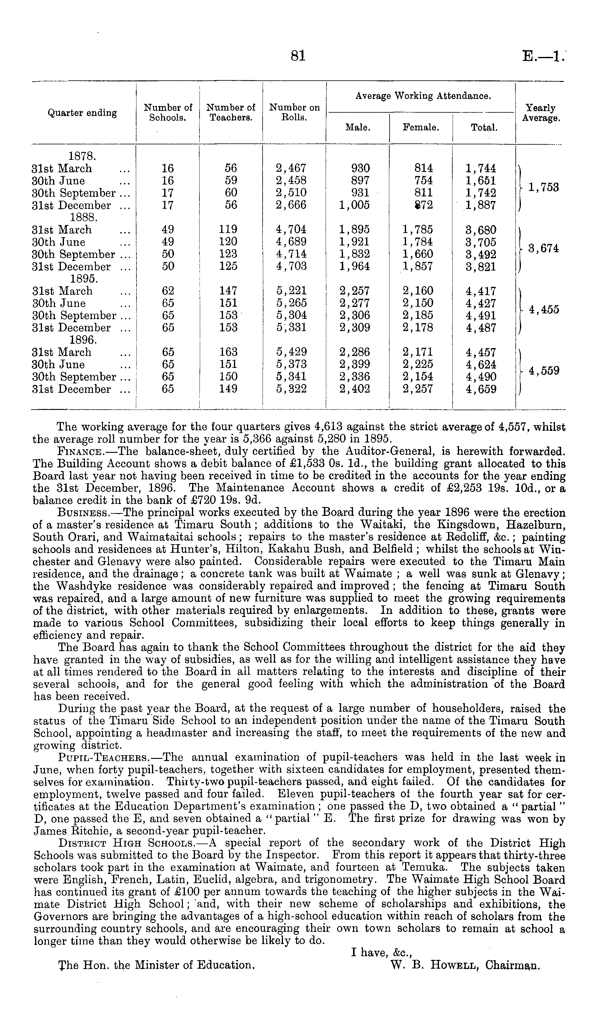 Average Working Attendance. Quarter ending Number of Schools. Number of Teachers. Number on Rolls. Yearly Average Male. Female. Total. 1878. 31st March 30th June 30th September ... 31st December ... 1888. 31st March 30th June 30th September ... 31st December ... 1895. 31st March 30th June 30th September ... 31st December ... 1896. 31st March 30th June 30th September ... 31st December ... 16 16 17 17 49 l<) 60 50 56 59 60 56 119 120 123 125 2,467 2,458 2,510 2,666 4,704 4,689 4,714 4,703 930 897 931 1,005 1,895 1,921 1,832 1,964 814 754 811 872 1,785 1,784 1,660 1,857 1,744 1,651 1,742 1,887 3,680 3,705 3,492 3,821 1,753 3,674 62 68 6B 147 151 153 153 5,221 5,265 5,304 5,331 2,257 2,277 2,306 2,309 2,160 2,150 2,185 2,178 4,417 4,427 4,491 4,487 4,455 65 65 66 163 151 150 149 5,429 5,373 5,341 5,322 2,286 2,399 2,336 2,402 2,171 2,225 2,154 2,257 4,457 4,624 4,490 4,659 4,559