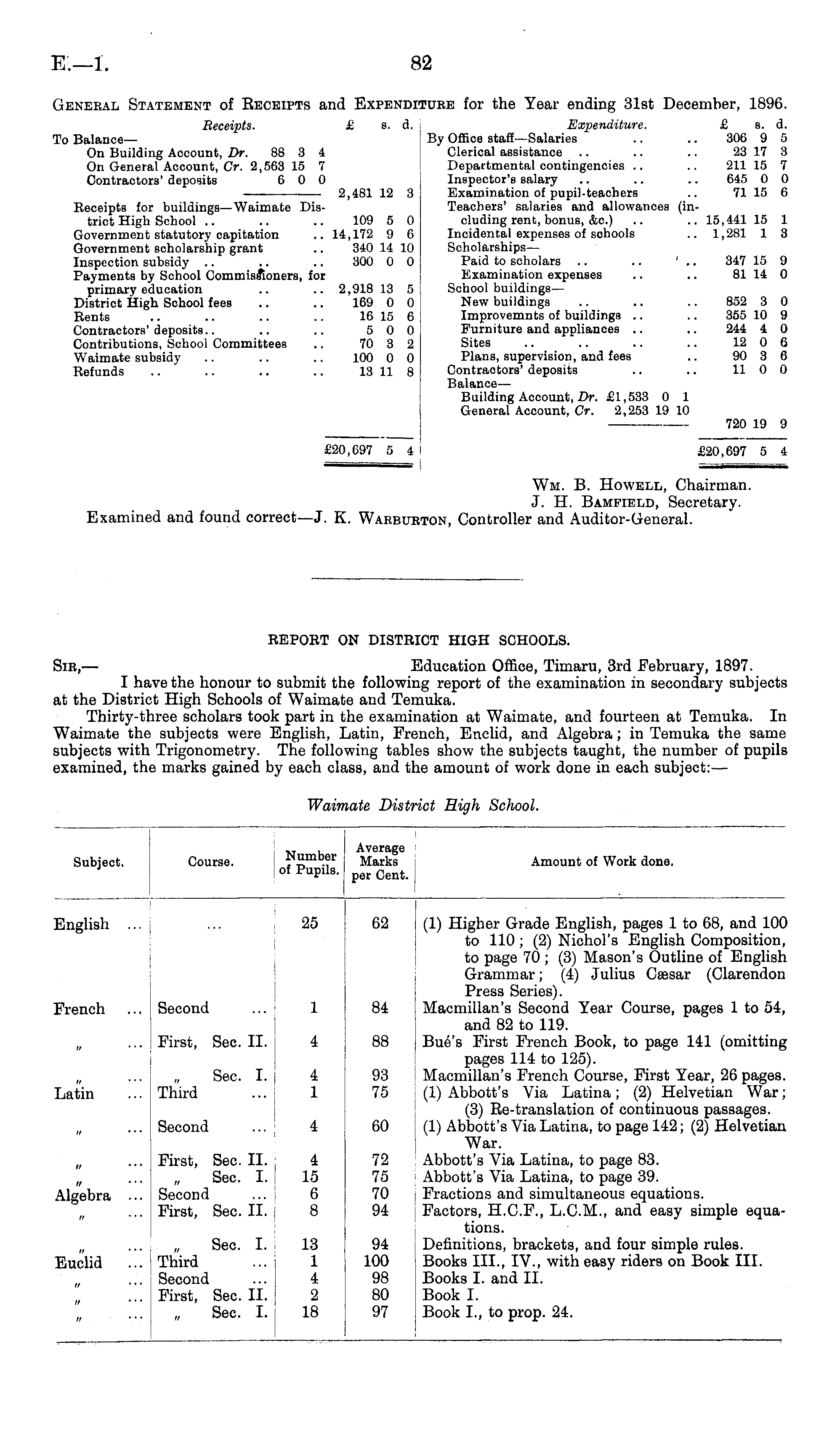 REPORT ON DISTRICT HIGH SCHOOLS. Sib,— Education Office, Timaru, 3rd February, 1897. I have the honour to submit the following report of the examination in secondary subjects at the District High Schools of Waimate and Temuka. Thirty-three scholars took part in the examination at Waimate, and fourteen at Temuka. In Waimate the subjects were English, Latin, French, Enclid, and Algebra; in Temuka the same subjects with Trigonometry. The following tables show the subjects taught, the number of pupils examined, the marks gained by each class, and the amount of work done in each subject:—