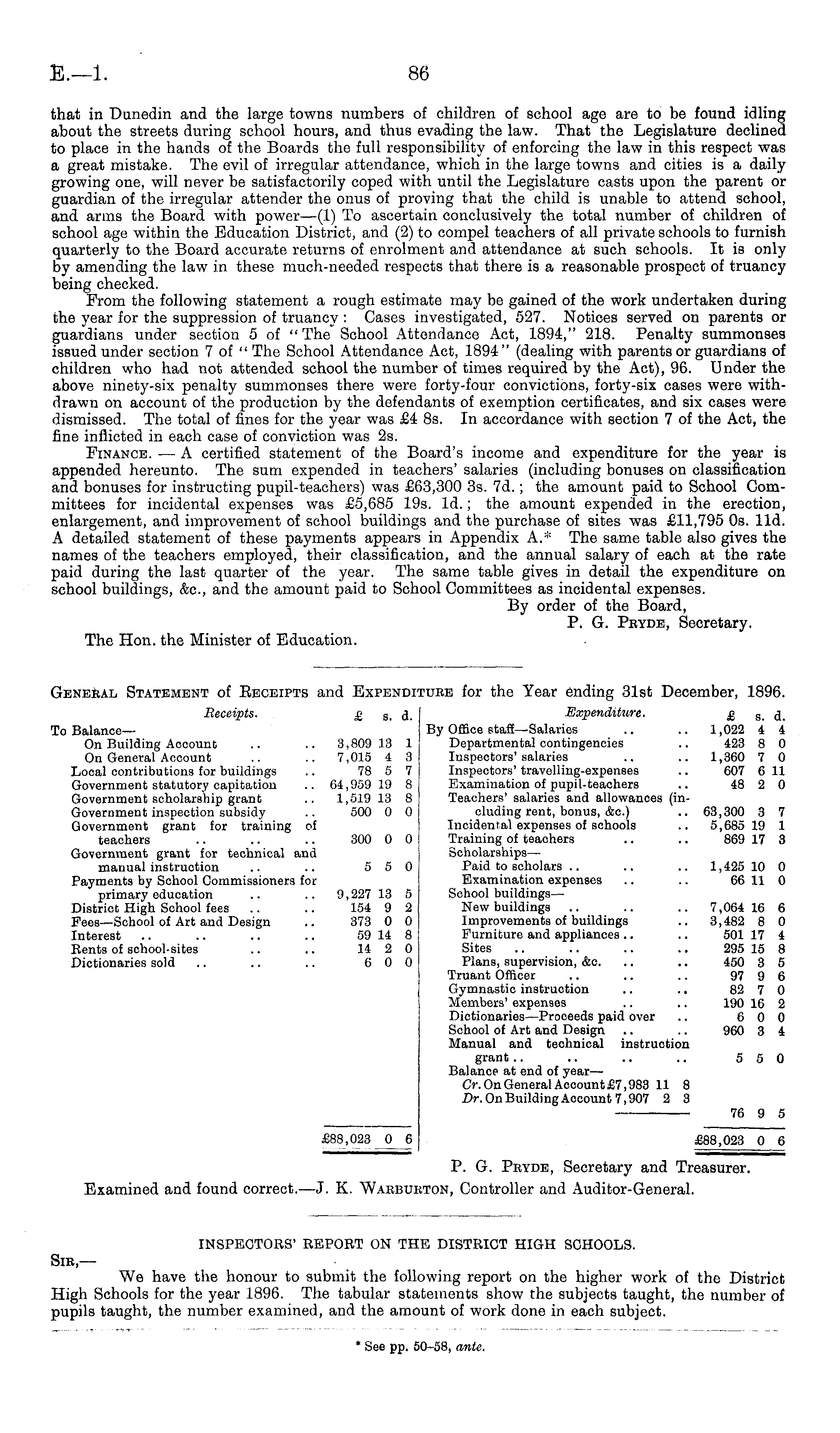 General Statement of Eeceipts and Expenditure for the Year ending 31st December, 1896. Receipts. £ s. A. Expenditure. £ s# ,j_ To Balance— By Office staff—Salaries .. .. 1,022 4 4 On Building Account .. .. 3,809 13 1 Departmental contingencies .. 423 8 0 On General Account .. .. 7,015 4 3 Inspectors'salaries .. .. 1,360 7 0 Local contributions for buildings .. 78 5 7 Inspectors' travelling-expenses .. 607 611 Government statutory capitation .. 64,959 19 8 Examination of pupil-teachers .. 48 2 0 Government scholarship grant .. 1,519 13 8 Teachers' salaries and allowances (inGovernment inspection subsidy .. 500 0 0 eluding rent, bonus, &c.) .. 63,300 3 7 Government grant for training of Incidental expenses of schools .. 5,685 19 1 teachers .. .. .. 300 0 0 Training of teachers .. .. 869 17 3 Government grant for technical and Scholarships— manual instruction .. .. 5 5 0 Paid to scholars .. .. .. 1,425 10 0 Payments by School Commissioners for Examination expenses .. .. 66 11 0 primary education .. .. 9,227 13 5 School buildingsDistrict High School fees .. .. 154 9 2 New buildings .. .. .. 7,064 16 6 Pees —School of Art and Design .. 373 0 0 Improvements of buildings .. 3,482 8 0 Interest .. .. .. .. 59 14 8 Furniture and appliances .. .. 501 17 4 Rents of school-sites .. .. 14 2 0 Sites .. .. .. .. 295 15 8 Dictionaries sold .. .. .. 6 0 0 Plans, supervision, &c. .. .. 450 3 5 Truant Officer .. .. .. 97 9 6 Gymnastic instruction .. .. 82 7 0 Members' expenses .. .. 190 16 2 Dictionaries—Proceeds paid over .. 6 0 0 School of Art and Design .. .. 960 3 4 Manual and technical instruction grant.. .. .. .. 5 5 0 Balance at end of year— Cr. On General Account £7,983 11 8 Dr. On Building Account 7,907 2 3 76 9 5 £88,023 0_ 6 £88,023 0 6 P. G. Peyde, Secretary and Treasurer. Examined and found correct.— J. K. Wakburton, Controller and Auditor-General.
