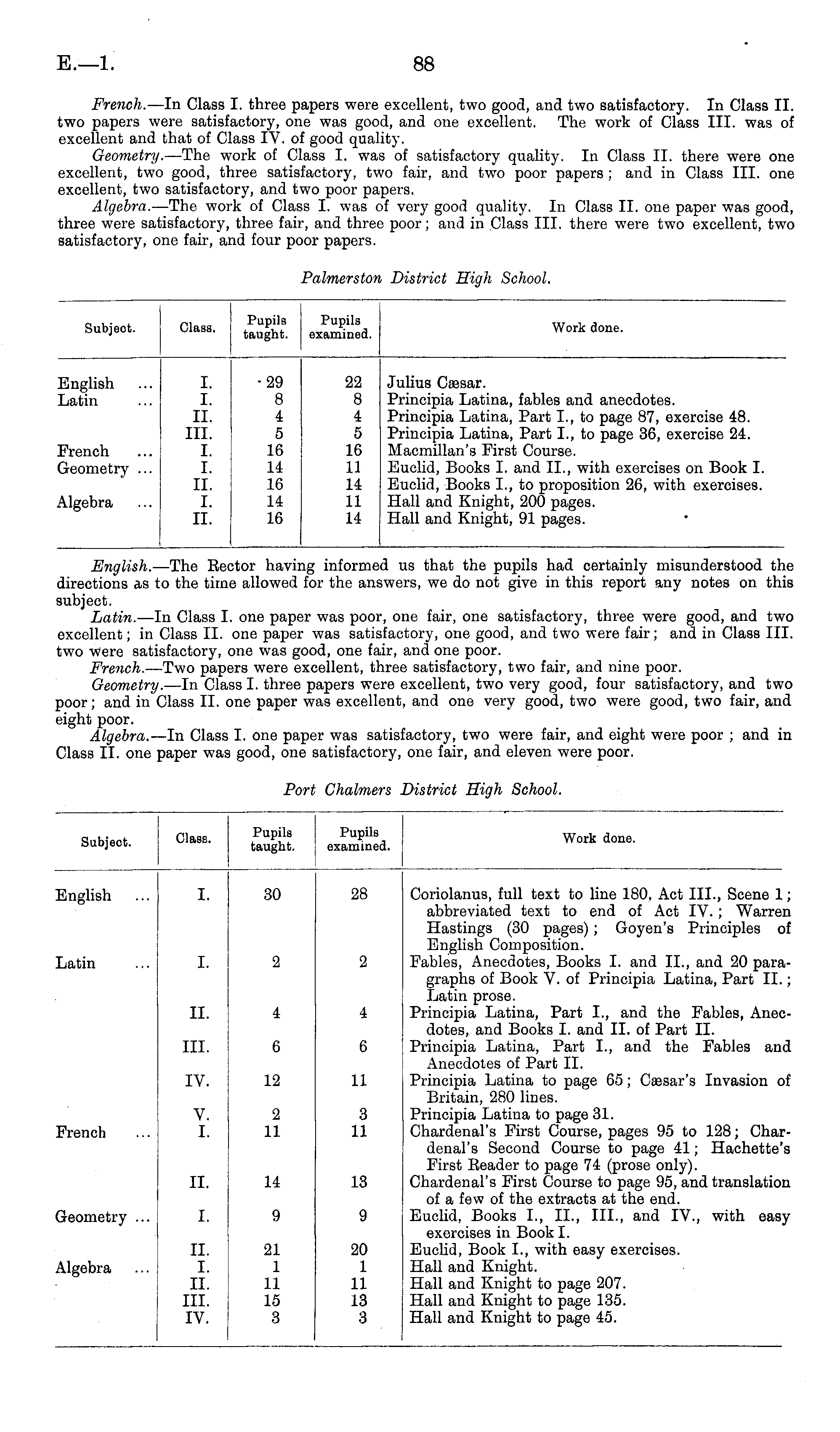 Subject. Class. Pupils taught. Pupils examined. Work done. English Latin I. I. II. III. I. I. II. I. II. •29 8 4 5 16 14 16 14 16 22 8 4 5 16 11 11 II 11 Julius Cassar. Principia Latina, fables and anecdotes. Principia Latina, Part L, to page 87, exercise 48. Principia Latina, Part I., to page 36, exercise 24. Macmillan's First Course. Euclid, Books I. and II., with exercises on Book I. Euclid, Books I., to proposition 26, with exercises. Hall and Knight, 200 pages. Hall and Knight, 91 pages. French Geometry ... Algebra