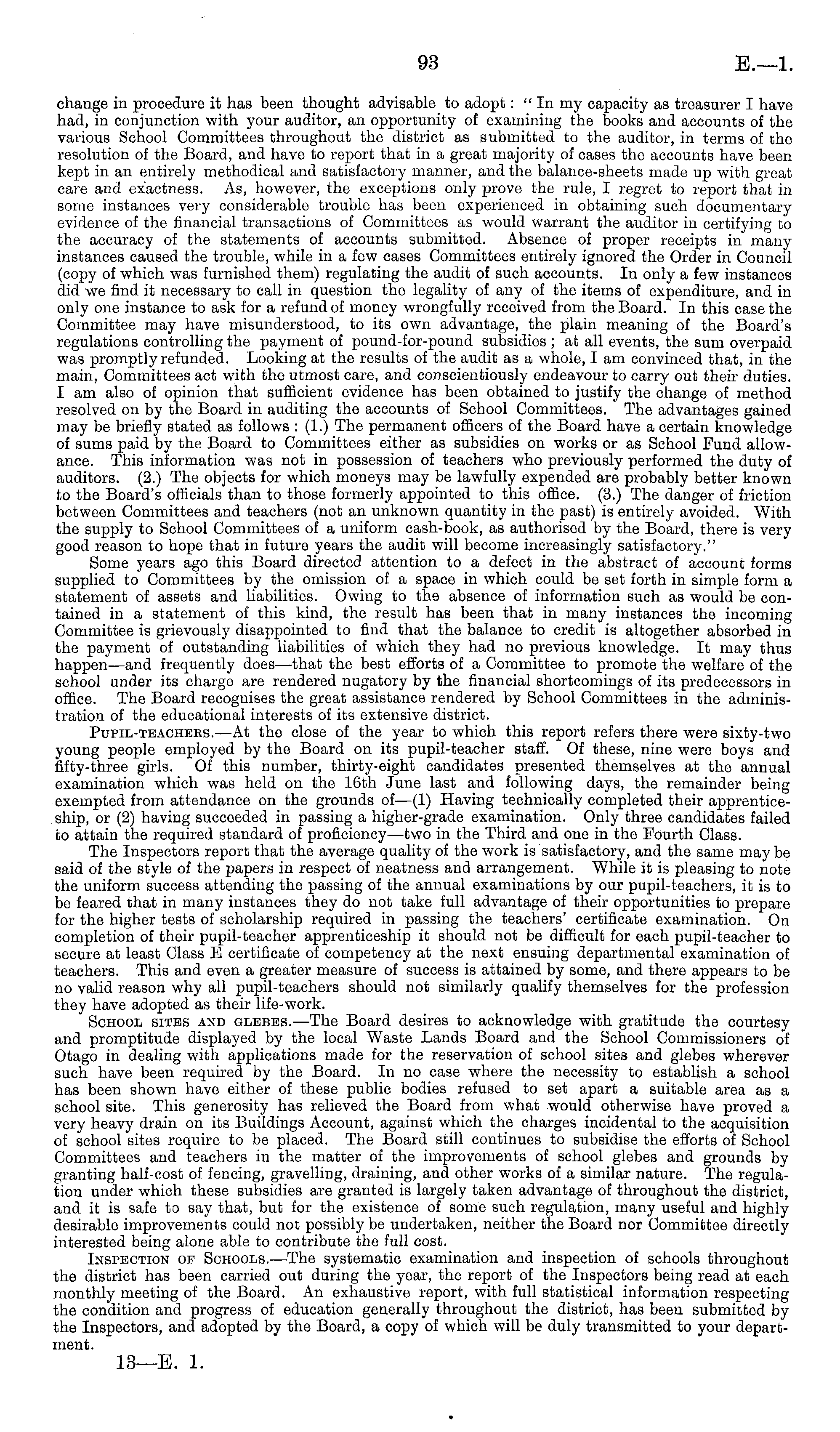 change in procedure it has been thought advisable to adopt: "In my capacity as treasurer I have had, in conjunction with your auditor, an opportunity of examining the books and accounts of the various School Committees throughout the district as submitted to the auditor, in terms of the resolution of the Board, and have to report that in a great majority of cases the accounts have been kept in an entirely methodical and satisfactory manner, and the balance-sheets made up with great care and exactness. As, however, the exceptions only prove the rule, I regret to report that in some instances very considerable trouble has been experienced in obtaining such documentary evidence of the financial transactions of Committees as would warrant the auditor in certifying to the accuracy of the statements of accounts submitted. Absence of proper receipts in many instances caused the trouble, while in a few cases Committees entirely ignored the Order in Council (copy of which was furnished them) regulating the audit of such accounts. In only a few instances did we find it necessary to call in question the legality of any of the items of expenditure, and in only one instance to ask for a refund of money wrongfully received from the Board. In this case the Committee may have misunderstood, to its own advantage, the plain meaning of the Board's regulations controlling the payment of pound-for-pound subsidies ; at all events, the sum overpaid was promptly refunded. Looking at the results of the audit as a whole, lam convinced that, in the main, Committees act with the utmost care, and conscientiously endeavour to carry out their duties. I am also of opinion that sufficient evidence has been obtained to justify the change of method resolved on by the Board in auditing the accounts of School Committees. The advantages gained may be briefly stated as follows : (1.) The permanent officers of the Board have a certain knowledge of sums paid by the Board to Committees either as subsidies on works or as School Fund allowance. This information was not in possession of teachers who previously performed the duty of auditors. (2.) The objects for which moneys may be lawfully expended are probably better known to the Board's officials than to those formerly appointed to this office. (3.) The danger of friction between Committees and teachers (not an unknown quantity in the past) is entirely avoided. With the supply to School Committees of a uniform cash-book, as authorised by the Board, there is very good reason to hope that in future years the audit will become increasingly satisfactory." Some years ago this Board directed attention to a defect in the abstract of account forms supplied to Committees by the omission of a space in which could be set forth in simple form a statement of assets and liabilities. Owing to the absence of information such as would be contained in a statement of this kind, the result has been that in many instances the incoming Committee is grievously disappointed to find that the balance to credit is altogether absorbed in the payment of outstanding liabilities of which they had no previous knowledge. It may thus happen—and frequently does —that the best efforts of a Committee to promote the welfare of the school under its charge are rendered nugatory by the financial shortcomings of its predecessors in office. The Board recognises the great assistance rendered by School Committees in the administration of the educational interests of its extensive district. Pupil-teachebs.—At the close of the year to which this report refers there were sixty-two young people employed by the Board on its pupil-teacher staff. Of these, nine were boys and fifty-three girls. Of this number, thirty-eight candidates presented themselves at the annual examination which was held on the 16th June last and following days, the remainder being exempted from attendance on the grounds of—(1) Having technically completed their apprenticeship, or (2) having succeeded in passing a higher-grade examination. Only three candidates failed fco attain the required standard of proficiency—two in the Third and one in the Fourth Class. The Inspectors report that the average quality of the work is satisfactory, and the same may be said of the style of the papers in respect of neatness and arrangement. While it is pleasing to note the uniform success attending the passing of the annual examinations by our pupil-teachers, it is to be feared that in many instances they do not take full advantage of their opportunities to prepare for the higher tests of scholarship required in passing the teachers' certificate examination. On completion of their pupil-teacher apprenticeship it should not be difficult for each pupil-teacher to secure at least Class E certificate of competency at the next ensuing departmental examination of teachers. This and even a greater measure of success is attained by some, and there appears to be no valid reason why all pupil-teachers should not similarly qualify themselves for the profession they have adopted as their life-work. School sites and glebes.—The Board desires to acknowledge with gratitude the courtesy and promptitude displayed by the local Waste Lands Board and the School Commissioners of Otago in dealing with applications made for the reservation of school sites and glebes wherever such have been required by the Board. In no ease where the necessity to establish a school has been shown have either of these public bodies refused to set apart a suitable area as a school site. This generosity has relieved the Board from what would otherwise have proved a very heavy drain on its Buildings Account, against which the charges incidental to the acquisition of school sites require to be placed. The Board still continues to subsidise the efforts of School Committees and teachers in the matter of the improvements of school glebes and grounds by granting half-cost of fencing, gravelling, draining, and 
