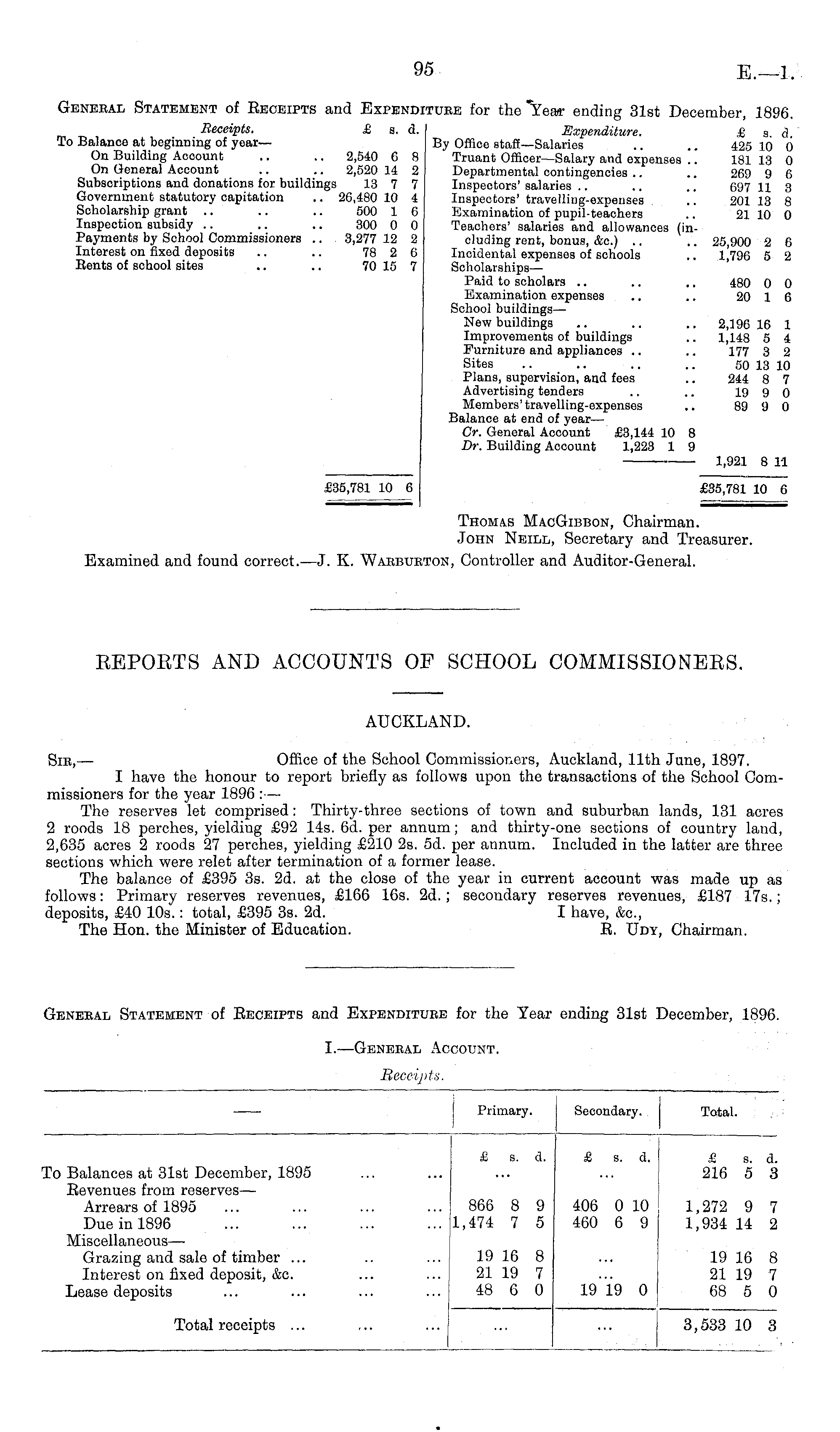 General Statement of Receipts and Expenditure for the "Year ending 31st December, 1896. Receipts. £ a. d. Expenditure. £ s d To Balanoo at beginning of year— By Office staff—Salaries .. .. 425 10 0 On Building Account .. .. 2,540 C 8 Truant Officer—Salary and expenses 181 13 0 On General Account .. .. 2,520 14 2 Departmental contingencies .. .. 209 9 G Subscriptions and donations for buildings 13 7 7 Inspectors' salaries .. .. .. 697 11 3 Government statutory capitation .. 20,480 10 4 Inspectors' travelling-expenses 201 13 8 Scholarship grant .. .. .. 500 1 G Examination of pupil-teachers . 21 10 0 Inspection subsidy .. .. .. 300 0 0 Teachers' salaries and allowances (inPayments by School Commissioners .. 3,277 12 2 eluding rent, bonus, &c.) .. .. 25 900 2 0 Interest on fixed deposits .. .. 78 2 0 Incidental expenses of schools .. I.VjG 5 2 Eents of school sites .. .. 70 15 7 ScholarshipsPaid to scholars .. .. .. 480 0 0 Examination expenses .. .. 20 1 6 School buildings— New buildings .. .. .. 2,196 16 1 Improvements of buildings .. 1,148 5 4 Furniture and appliances .. .. 177 3 2 Sites .. .. .. .. 50 13 10 Plans, supervision, and fees .. 244 8 7 Advertising tenders .. .. 19 9 0 Members' travelling-expenses .. 89 9 0 Balance at end of year— Cr. General Account £3,144 10 8 Dr. Building Account 1,223 1 9 1,921 8 11 £35,781 10 6 £35,781 10 G Thomas Mac Gibbon, Chairman. John Neill, Secretary and Treasurer. Examined and found correct.— J. K. Warburton, Controller and Auditor-General.