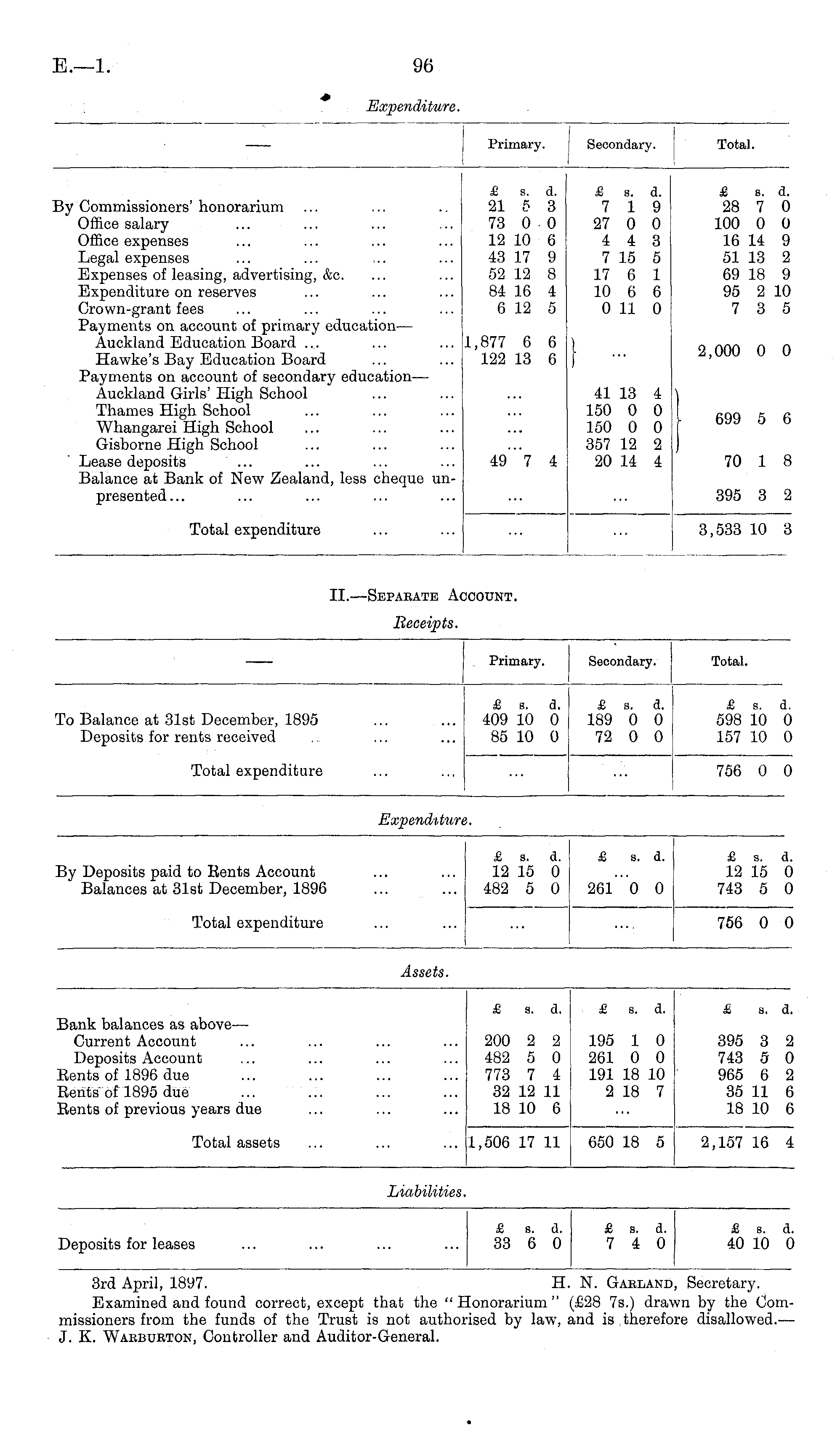 Primary. I I Secondary. Total. iy Commissioners'honorarium Office salary Office expenses Legal expenses Expenses of leasing, advertising, &c. Expenditure on reserves Crown-grant fees Payments on account of primary education — Auckland Education Board ... Hawke's Bay Education Board Payments on account of secondary education — Auckland Girls' High School Thames High School Whangarei High School Gisborne High School Lease deposits Balance at Bank of New Zealand, less cheque unpresented... £ s. d. 21 5 3 73 0 0 12 10 6 43 17 9 52 12 8 84 16 4 6 12 5 £ s. 7 1 27 0 4 4 7 15 17 6 10 6 0 11 a. 9 0 3 5 1 6 0 £ s. a. 28 7 0 100 0 0 16 14 9 51 13 2 69 18 9 95 2 10 7 3 5 1,877 6 6 122 13 6 I 2,000 0 0 41 13 150 0 150 0 357 12 20 14 4 0 0 2 4 1 699 5 6 49 7 4 70 1 8 395 3 2 Total expenditure 3,533 10 3