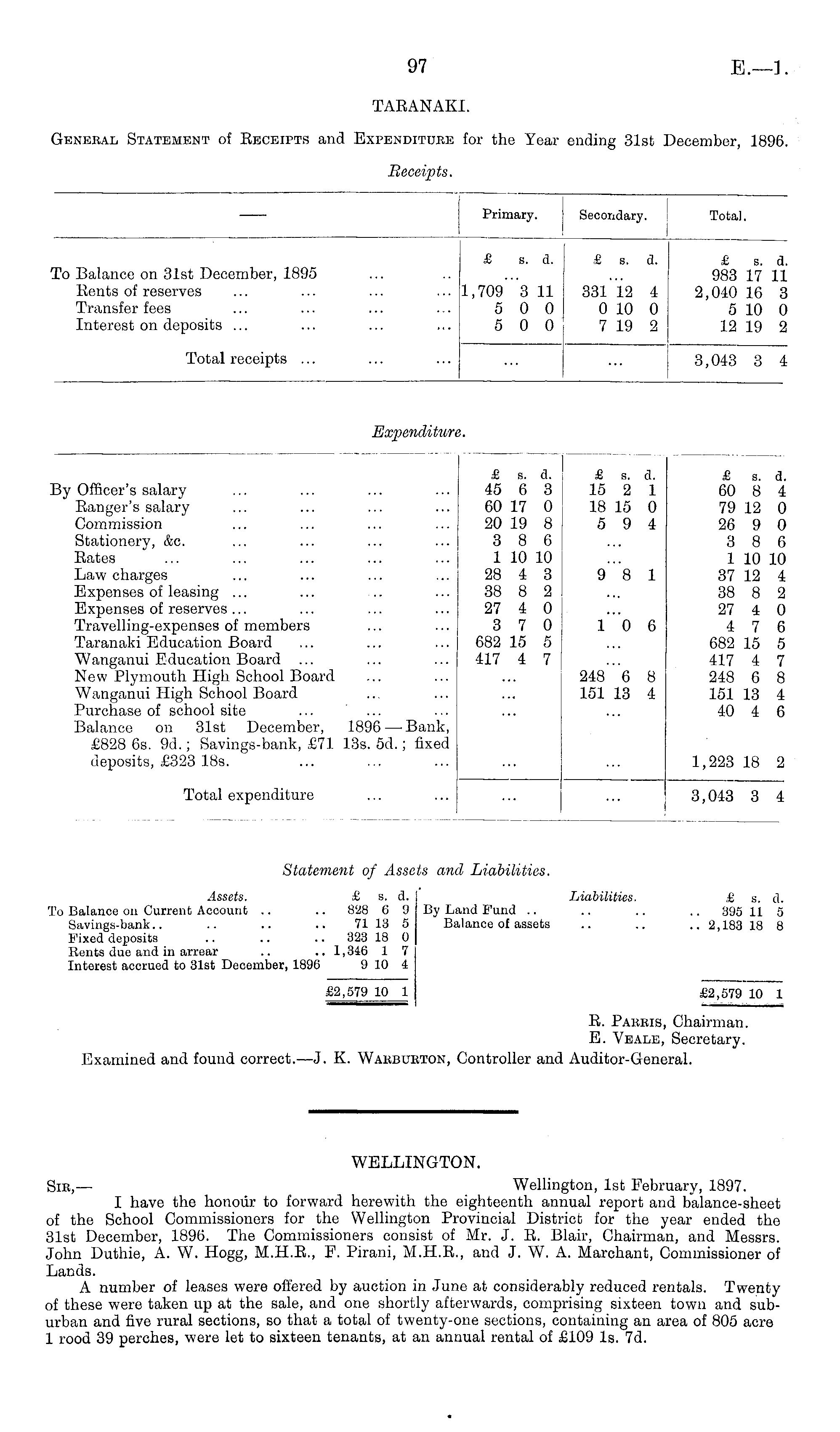 WELLINGTON. Sic,— Wellington, Ist February, 1897. I have the honour to forward herewith the eighteenth annual report and balance-sheet of the School Commissioners for the Wellington Provincial District for the year ended the 31st December, 1896. The Commissioners consist of Mr. J. E. Blair, Chairman, and Messrs. John Duthie, A. W. Hogg, M.H.E., F. Pirani, M.H.E., and J. W. A. Marchant, Commissioner of Lands. A number of leases were offered by auction in June at considerably reduced rentals. Twenty of these were taken up at the sale, and one shortly afterwards, comprising sixteen town and suburban and five rural sections, so that a total of twenty-one sections, containing an area of 805 acre 1 rood 39 perches, were let to sixteen tenants, at an annual rental of £109 Is. 7d.