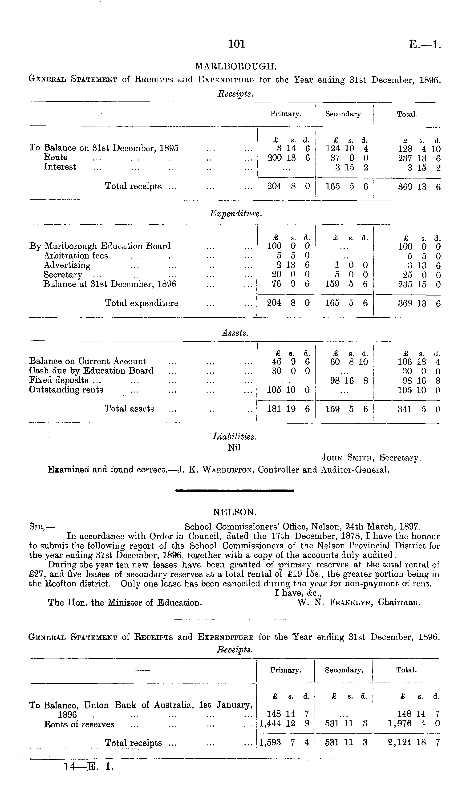 NELSON. Sir, — School Commissioners' Office, Nelson, 24th March, 1897. In accordance with Order in Council, dated the 17th December, 1878, I have the honour to submit the following report of the School Commissioners of the Nelson Provincial District for the year ending 31st December, 1896, together with a copy of the accounts duly audited : — During the year ten new leases have been granted of primary reserves at the total rental of £27, and five leases of secondary reserves at a total rental of £19 155., the greater portion being in the Reefton district. Only one lease has been cancelled during the year for non-payment of rent. I have, &c, The Hon. the Minister of Education. W. N. Feanklyn, Chairman.