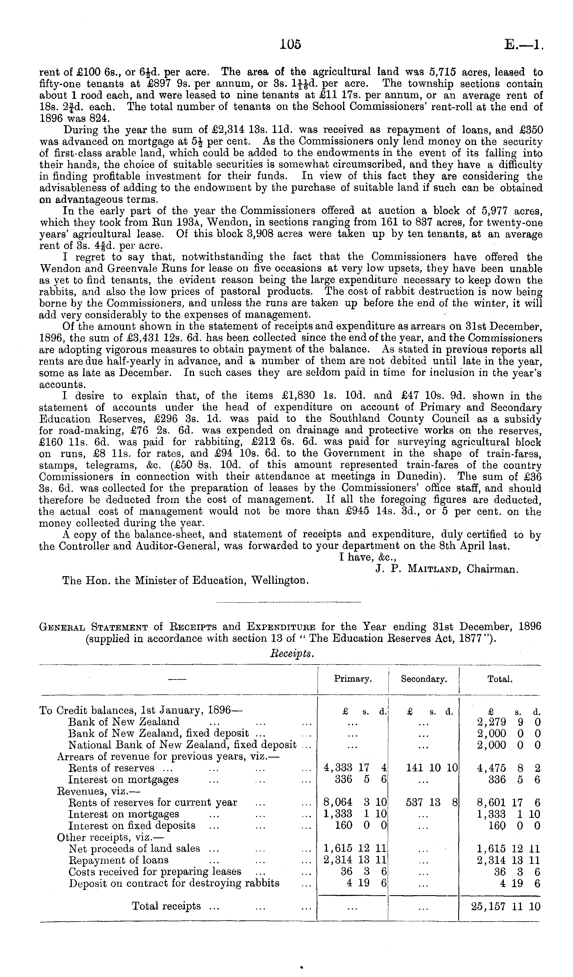 General Statement of Receipts and Expenditure for the Year ending 31st December, 1896 (supplied in accordance with section 13 of "The Education Reserves Act, 1877"). Receipts.
