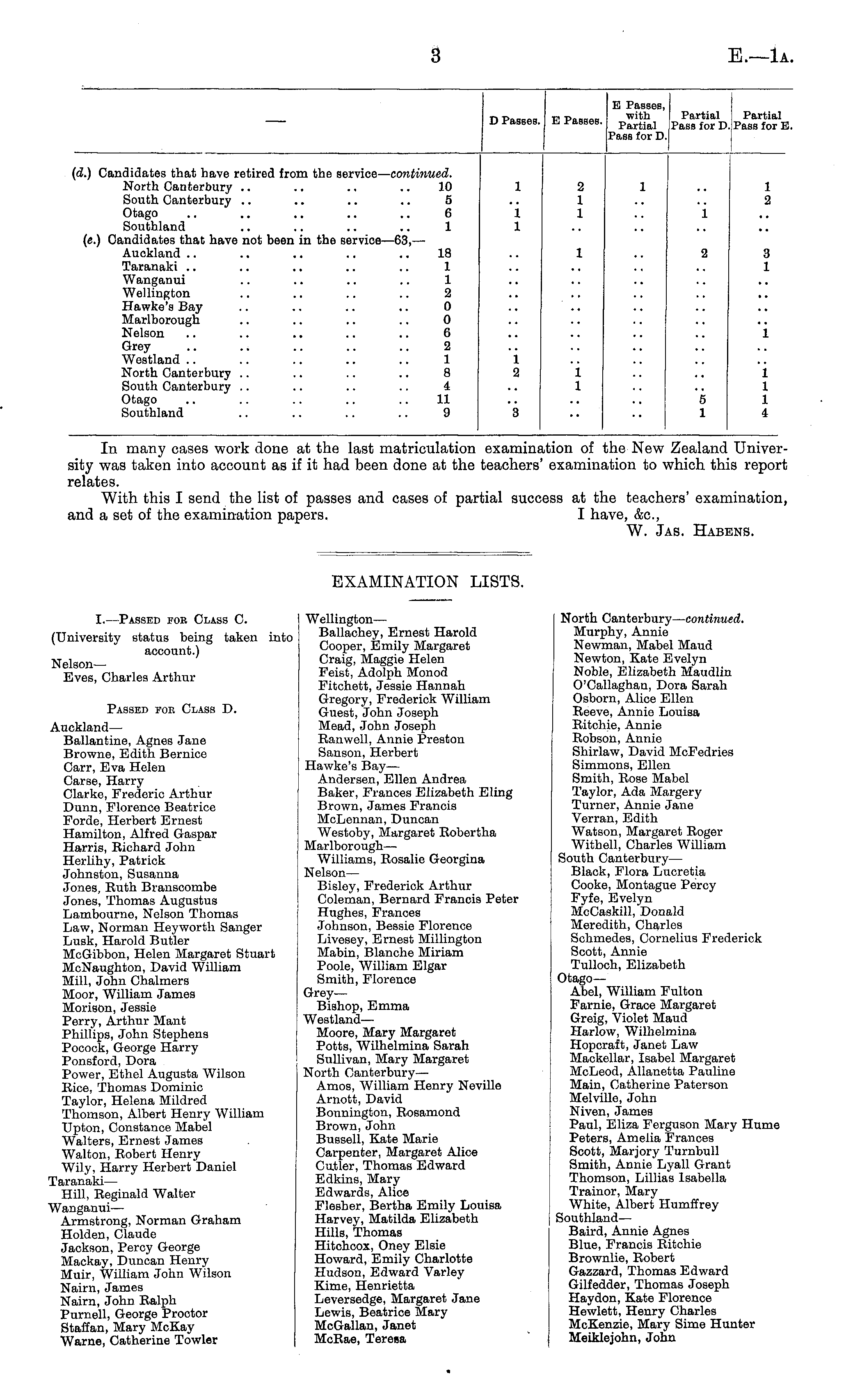 In many cases work done at the last matriculation examination of the New Zealand University was taken into account as if it had been done at the teachers' examination to which this report relates. With this I send the list of passes and cases of partial success at the teachers' examination, and a set of the examination papers, I have, &c, W. Jas. Habens.
