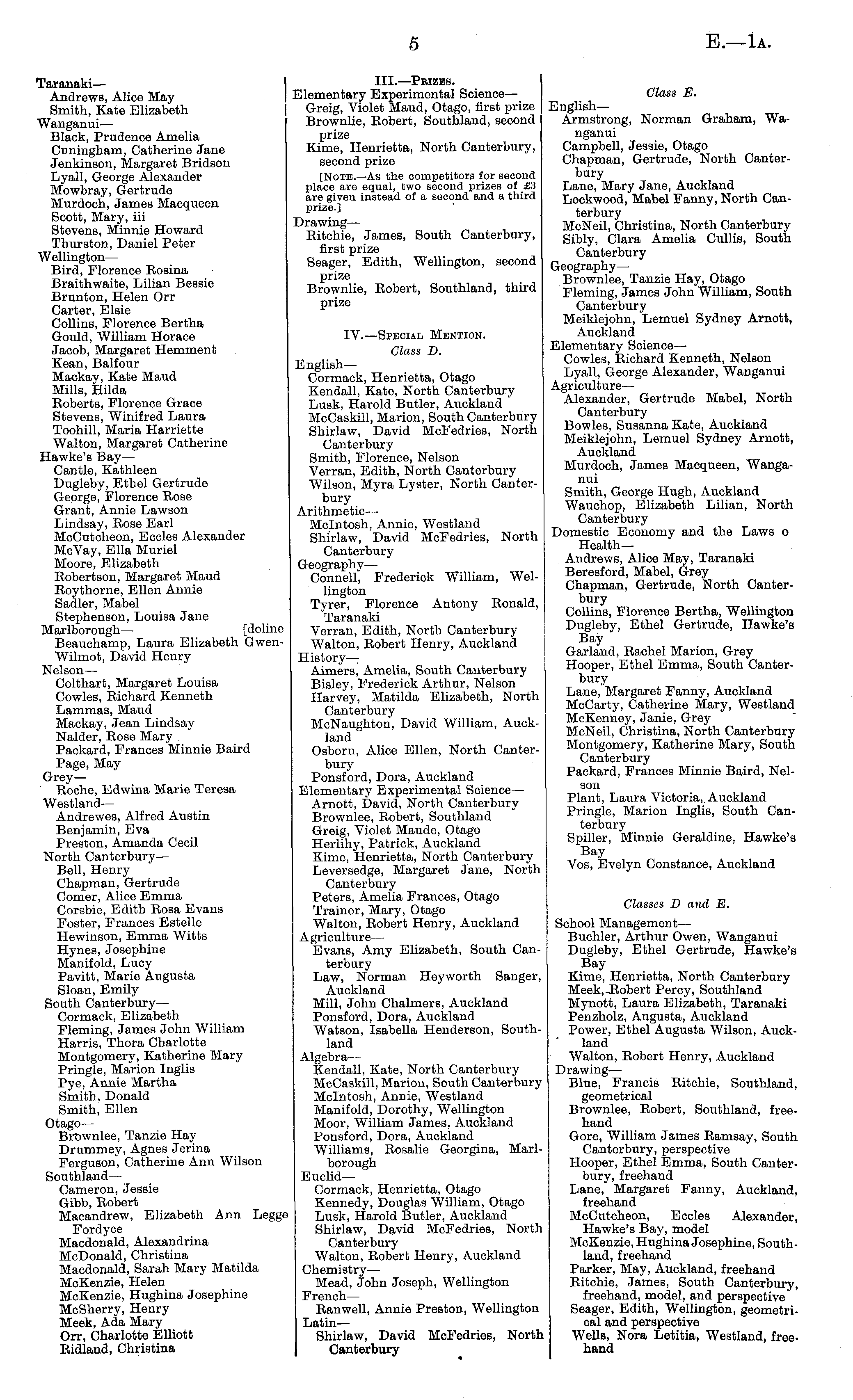 Class E. English— Armstrong, Norman Graham, Wanganui Campbell, Jessie, Otago Chapman, Gertrude, North Canterbury Lane, Mary Jane, Auckland Lockwood, Mabel Fanny, North Canterbury McNeil, Christina, North Canterbury Sibly, Clara Amelia Cullis, South Canterbury Geography— Brownlee, Tanzie Hay, Otago Fleming, James John William, South Canterbury Meiklejohn, Lemuel Sydney Arnott, Auckland Elementary Science — Cowles, Richard Kenneth, Nelson Lyall, George Alexander, Wanganui Agriculture— Alexander, Gertrude Mabel, North Canterbury Bowles, Susanna Kate, Auckland Meiklejohn, Lemuel Sydney Arnott, Auckland Murdoch, James Macqueen, Wanganui Smith, George Hugh, Auckland Wauchop, Elizabeth Lilian, North Canterbury Domestic Economy and the Laws o HealthAndrews, Alice May, Taranaki Beresford, Mabel, Grey Chapman, Gertrude, North Canterbury Collins, Florence Bertha, Wellington Dugleby, Ethel Gertrude, Hawke's Bay Garland, Rachel Marion, Grey Hooper, Ethel Emma, South Canterbury Lane, Margaret Fanny, Auckland McCarty, Catherine Mary, Westland McKenney, Janie, Grey McNeil, Christina, North Canterbury Montgomery, Katherine Mary, South Canterbury Packard, Frances Minnie Baird, Nelson Plant, Laura, Victoria, Auckland Pringle, Marion Inglis, South Canterbury Spiller, Minnie Geraldine, Hawke's Bay Vos, Evelyn Constance, Auckland Classes D and E. School Management— Buchler, Arthur Owen, Wanganui Dugleby, Ethel Gertrude, Hawke's Bay Kime, Henrietta, North Canterbury Meek, Robert Percy, Southland Mynott, Laura Elizabeth, Taranaki Penzholz, Augusta, Auckland Power, Ethel Augusta Wilson, Auckland Walton, Robert Henry, Auckland Drawing— Blue, Francis Ritchie, Southland, geometrical Brownlee, Robert, Southland, freehand Gore, William James Ramsay, South Canterbury, perspective Hooper, Ethel Emma, South Canterbury, freehand Lane, Margaret Fanny, Auckland, freehand McCutcheon, Eccles Alexander, Hawke's Bay, model McKenzie, Hughina Josephine, Southland, freehand Parker, May, Auckland, freehand Ritchie, James, South Canterbury, freehand, model, and perspective Seager, Edith, Wellington, geometrical and perspective Wells, Nora Letitia, Westland, freehand