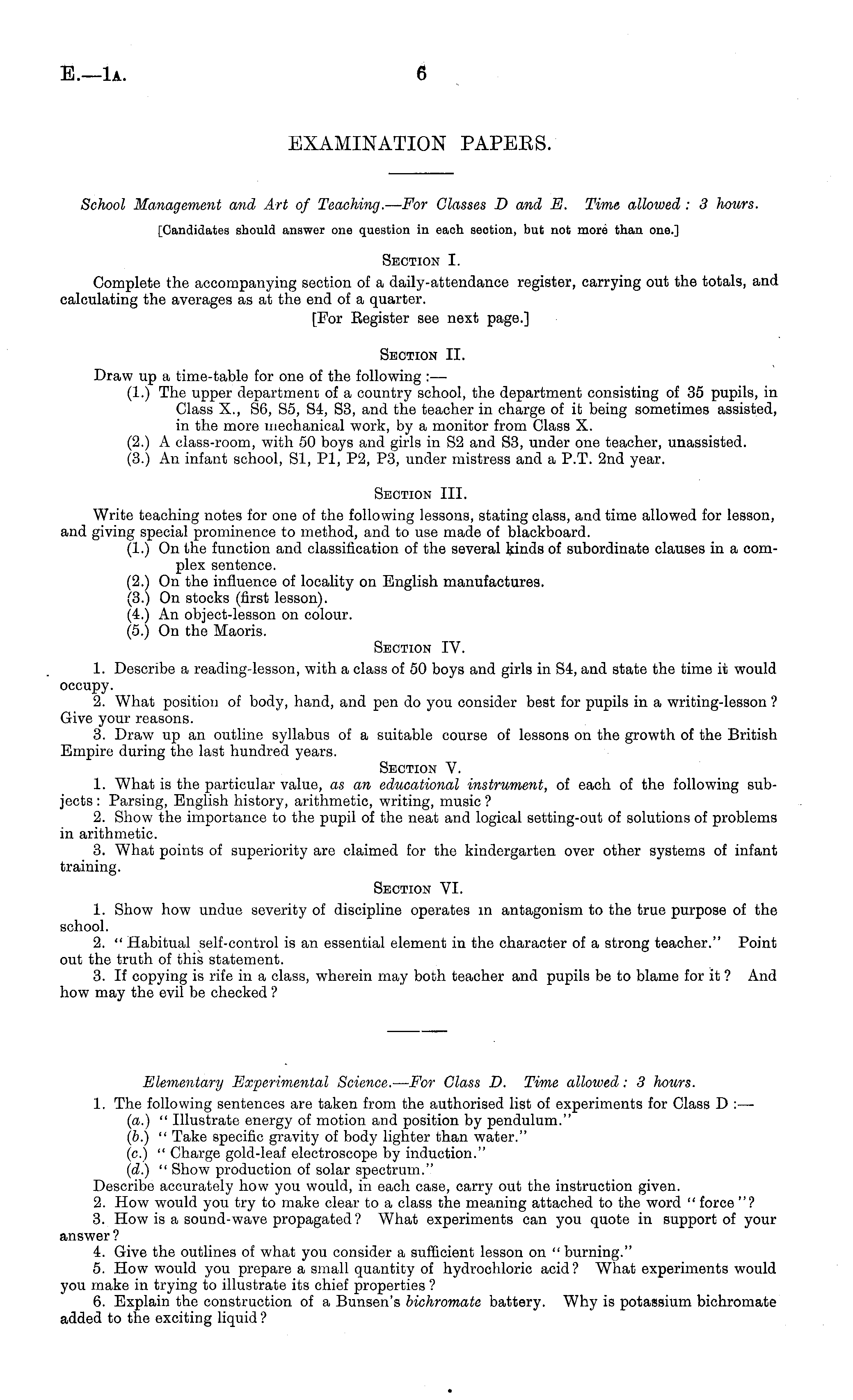 School Management and Art of Teaching. — For Glasses D and E. Time allowed : 3 hours. [Candidates should answer one question in each seotion, but not more than one.] Section I. Complete the accompanying section of a daily-attendance register, carrying out the totals, and calculating the averages as at the end of a quarter. [For Register see next page.] Section 11. Draw up a time-table for one of the following :— (1.) The upper department of a country school, the department consisting of 35 pupils, in Class X., S6, S5, S4, S3, and the teacher in charge of it being sometimes assisted, in the more mechanical work, by a monitor from Class X. (2.) A class-room, with 50 boys and girls in S2 and S3, under one teacher, unassisted. (3.) An infant school, SI, PI, P2, P3, under mistress and a P.T. 2nd year. Section 111. Write teaching notes for one of the following lessons, stating class, and time allowed for lesson, and giving special prominence to method, and to use made of blackboard. (1.) On the function and classification of the several kinds of subordinate clauses in a complex sentence. (2.) On the influence of locality on English manufactures. (3.) On stocks (first lesson). (4.) An object-lesson on colour. (5.) On the Maoris. Section IV. 1. Describe a reading-lesson, with a class of 50 boys and girls in S4, and state the time it would occupy. 2. What position of body, hand, and pen do you consider best for pupils in a writing-lesson ? Give your reasons. 3. Draw up an outline syllabus of a suitable course of lessons on the growth of the British Empire during the last hundred years. Section V. 1. What is the particular value, as an educational instrument, of each of the following subjects : Parsing, English history, arithmetic, writing, music ? 2. Show the importance to the pupil of the neat and logical setting-out of solutions of problems in arithmetic. 3. What points of superiority are claimed for the kindergarten over other systems of infant training. Section VI. 1. Show how undue severity of discipline operates in antagonism to the true purpose of the school. 2. " Habitual self-control is an essential element in the character of a strong teacher." Point out the truth of this statement. 3. If copying is rife in a class, wherein may both teacher and pupils be to blame for it ? And how may the evil be checked ?