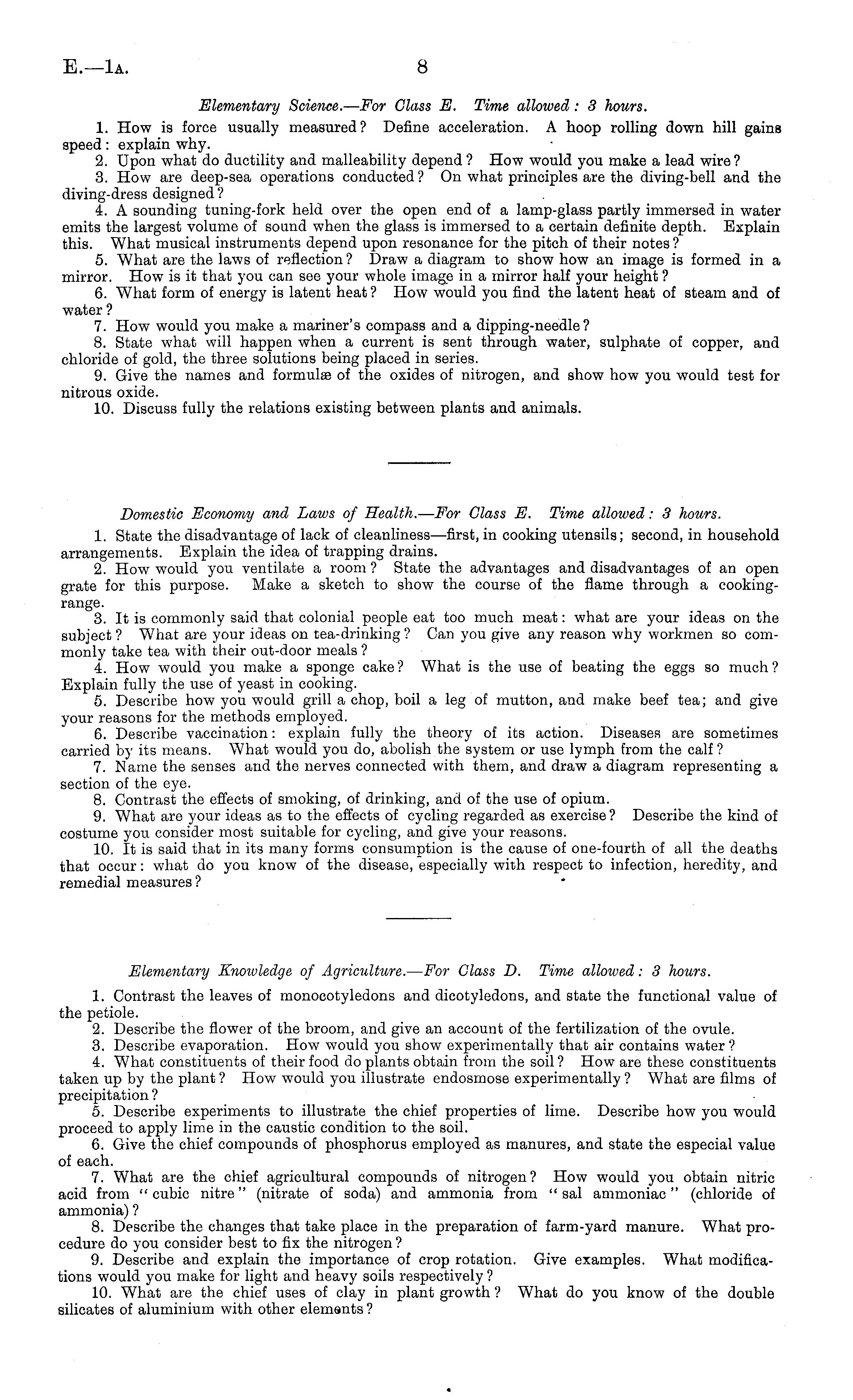 Domestic Economy and Laws of Health. — For Class E. Time allowed: 3 hours. 1. State the disadvantage of lack of cleanliness—first, in cooking utensils; second, in household arrangements. Explain the idea of trapping drains. 2. How would you ventilate a room ? State the advantages and disadvantages of an open grate for this purpose. Make a sketch to show the course of the flame through a cookingrange. 3. It is commonly said that colonial people eat too much meat: what are your ideas on the subject ? What are your ideas on tea-drinking ? Can you give any reason why workmen so commonly take tea with their out-door meals ? 4. How would you make a sponge cake? What is the use of beating the eggs so much? Explain fully the use of yeast in cooking. 5. Describe how you would grill a chop, boil a leg of mutton, and make beef tea; and give your reasons for the methods employed. 6. Describe vaccination: explain fully the theory of its action. Diseases are sometimes carried by its means. What would you do, abolish the system or use lymph from the calf ? 7. Name the senses and the nerves connected with them, and draw a diagram representing a section of the eye. 8. Contrast the effects of smoking, of drinking, and of the use of opium. 9. What are your ideas as to the effects of cycling regarded as exercise? Describe the kind of costume you consider most suitable for cycling, and give your reasons. 10. It is said that in its many forms consumption is the cause of one-fourth of all the deaths that occur: what do you know of the disease, especially with respect to infection, heredity, and remedial measures ?