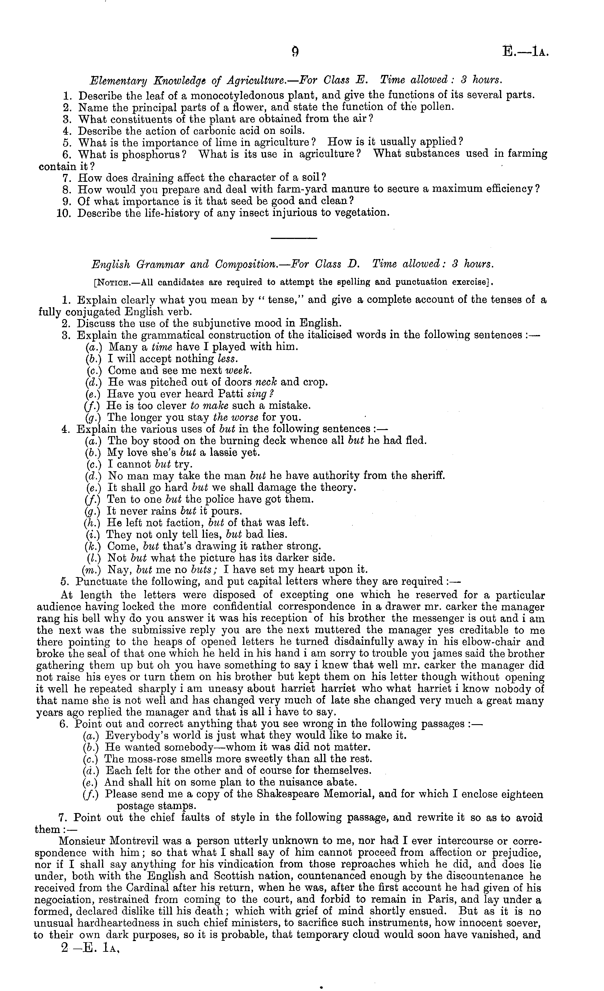 Elementary Knowledge of Agriculture. — For Class E. Time allowed : 3 hours. 1. Describe the leaf of a monocotyledonous plant, and give the functions of its several parts. 2. Name the principal parts of a flower, and state the function of the pollen. 3. What constituents of the plant are obtained from the air ? 4. Describe the action of carbonic acid on soils. 5. What is the importance of lime in agriculture? How is it usually applied? 6. What is phosphorus? What is its use in agriculture? What substances used in farming contain it ? 7. How does draining affect the character of a soil? 8. How would you prepare and deal with farm-yard manure to secure a maximum efficiency? 9. Of what importance is it that seed be good and clean? 10. Describe the life-history of any insect injurious to vegetation.