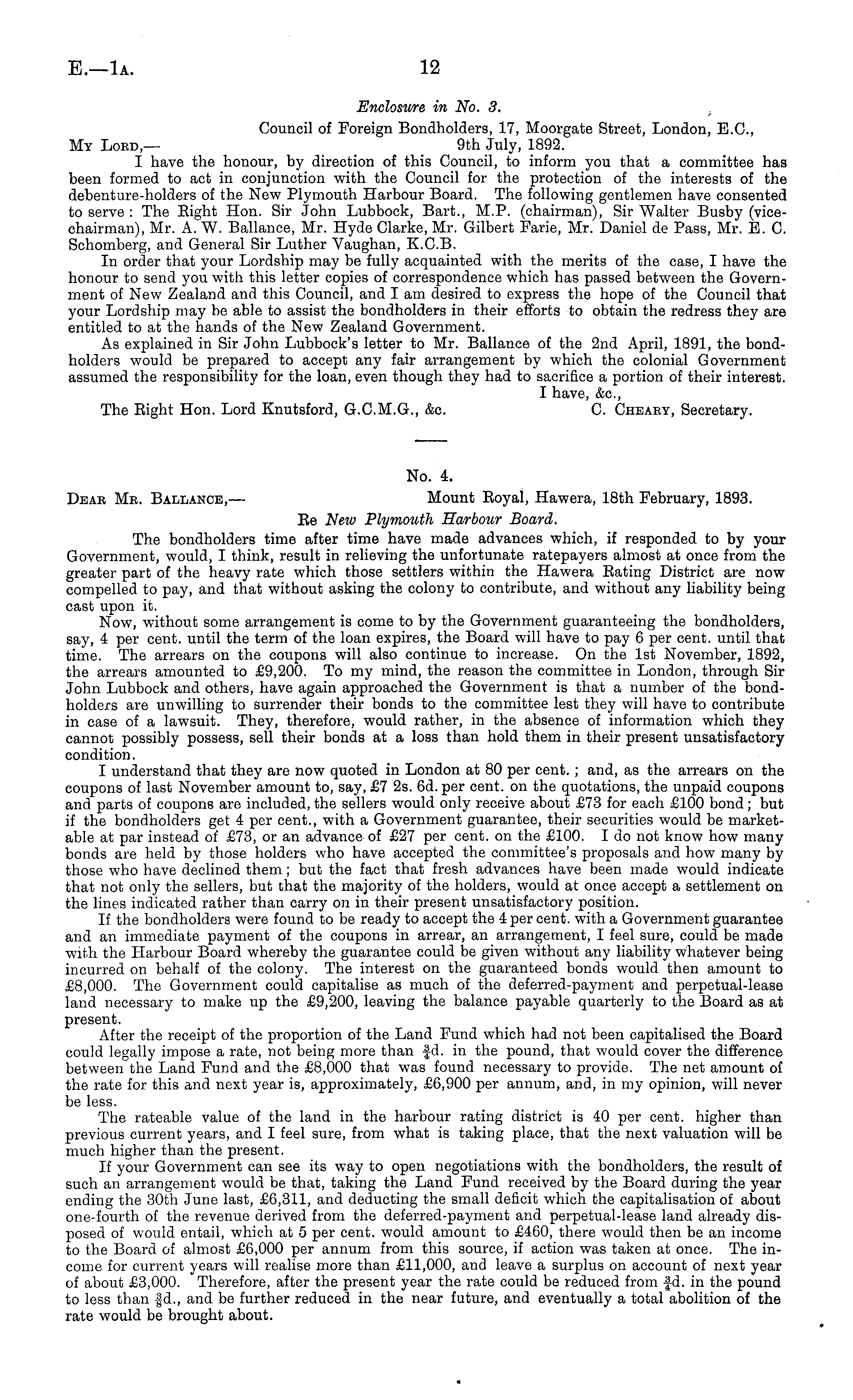 Enclosure in No. 3. Council of Foreign Bondholders, 17, Moorgate Street, London, E.C., My Loed,— 9th July, 1892. I have the honour, by direction of this Council, to inform you that a committee has been formed to act in conjunction with the Council for the protection of the interests of the debenture-holders of the New Plymouth Harbour Board. The following gentlemen have consented to serve : The Eight Hon. Sir John Lubbock, Bart., M.P. (chairman), Sir Walter Busby (vicechairman), Mr. A. W. Ballance, Mr. Hyde Clarke, Mr. Gilbert Farie, Mr. Daniel de Pass, Mr. E. C. Schomberg, and General Sir Luther Vaughan, K.C.B. In order that your Lordship may be fully acquainted with the merits of the case, I have the honour to send you with this letter copies of correspondence which has passed between the Government of New Zealand and this Council, and I am desired to express the hope of the Council that your Lordship may be able to assist the bondholders in their efforts to obtain the redress they are entitled to at the hands of the New Zealand Government. As explained in Sir John Lubbock's letter to Mr. Ballance of the 2nd April, 1891, the bondholders would be prepared to accept any fair arrangement by which the colonial Government assumed the responsibility for the loan, even though they had to sacrifice a portion of their interest. I have, &c, The Eight Hon. Lord Knutsford, G.C.M.G., &c. C. Cheaey, Secretary.