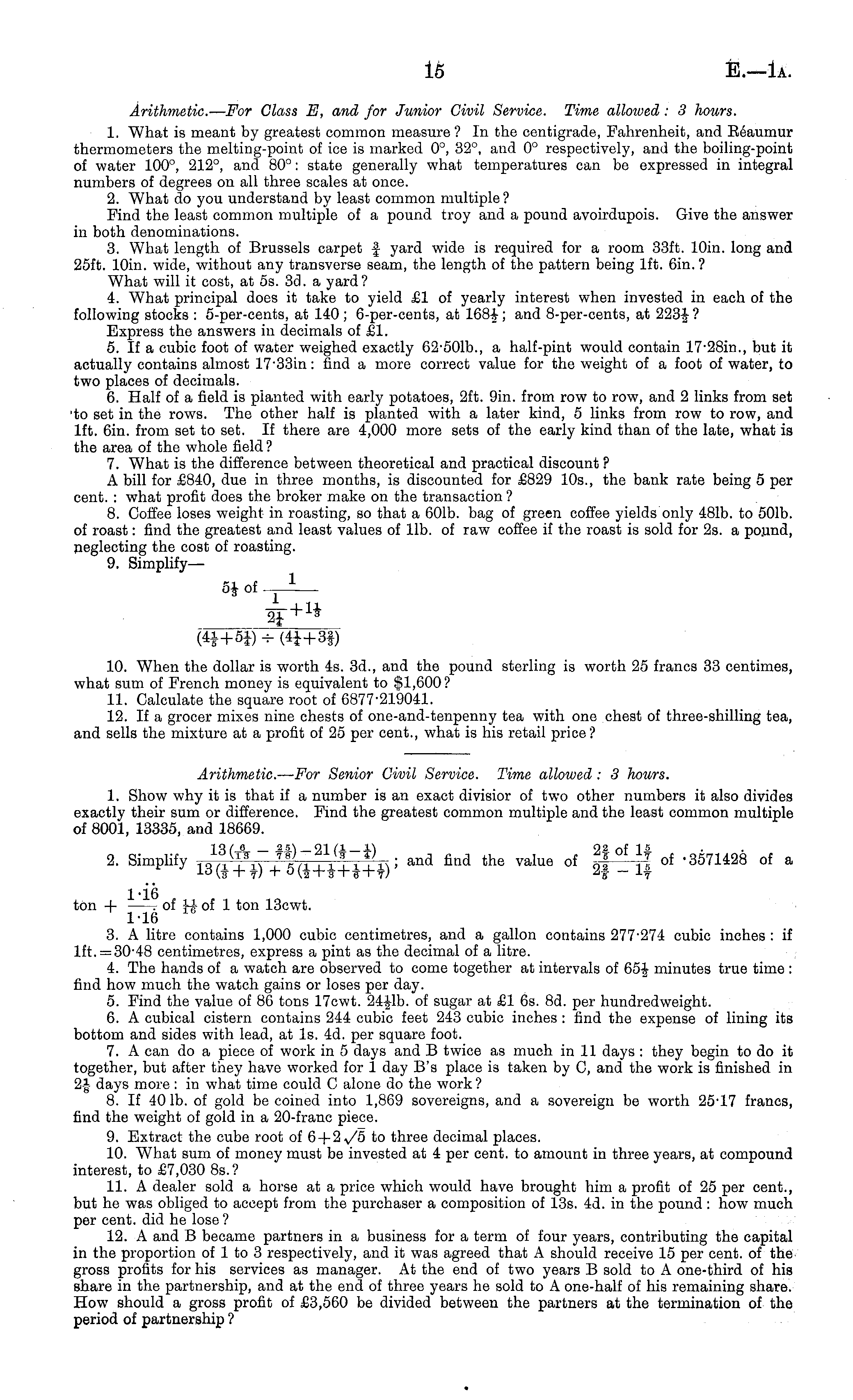 Arithmetic. — For Class E, and for Junior Civil Service. Time allowed : 3 hours. 1. What is meant by greatest common measure ? In the centigrade, Fahrenheit, and Eeaumur thermometers the melting-point of ice is marked o°, 32°, and 0° respectively, and the boiling-point of water 100°, 212°, and 80°: state generally what temperatures can be expressed in integral numbers of degrees on all three scales at once. 2. What do you understand by least common multiple ? Find the least common multiple of a pound troy and a pound avoirdupois. Give the answer in both denominations. 3. What length of Brussels carpet f yard wide is required for a room 33ft. 10in. long and 25ft. 10in. wide, without any transverse seam, the length of the pattern being lft. 6in.? What will it cost, at ss. 3d. a yard? 4. What principal does it take to yield £1 of yearly interest when invested in each of the following stocks : 5-per-cents, at 140 ; 6-per-cents, at 168 i; and 8-per-cents, at 223J ? Express the answers in decimals of £1. 5. If a cubic foot of water weighed exactly 62-501b., a half-pint would contain 17-28 in., but it actually contains almost 17'33in: find a more correct value for the weight of a foot of water, to two places of decimals. 6. Half of a field is planted with early potatoes, 2ft. 9in. from row to row, and 2 links from set to set in the rows. The other half is planted with a later kind, 5 links from row to row, and lft. 6in. from set to set. If there are 4,000 more sets of the early kind than of the late, what is the area of the whole field ? 7. What is the difference between theoretical and practical discount ? A bill for £840, due in three months, is discounted for £829 10s., the bank rate being 5 per cent. : what profit does the broker make on the transaction? 8. Coffee loses weight in roasting, so that a 601b. bag of green coffee yields only 481b. to 501b. of roast: find the greatest and least values of lib. of raw coffee if the roast is sold for 2s. a pound, neglecting the cost of roasting. 9. Simplify— siof^_ 2f + 1 * (4i+sJ) + (4i+3f) 10. When the dollar is worth 4s. 3d., and the pound sterling is worth 25 francs 33 centimes, what sum of French money is equivalent to $1,600? 11. Calculate the square root of 6877-219041. 12. If a grocer mixes nine chests of one-and-tenpenny tea with one chest of three-shilling tea, and sells the mixture at a profit of 25 per cent., what is his retail price ?