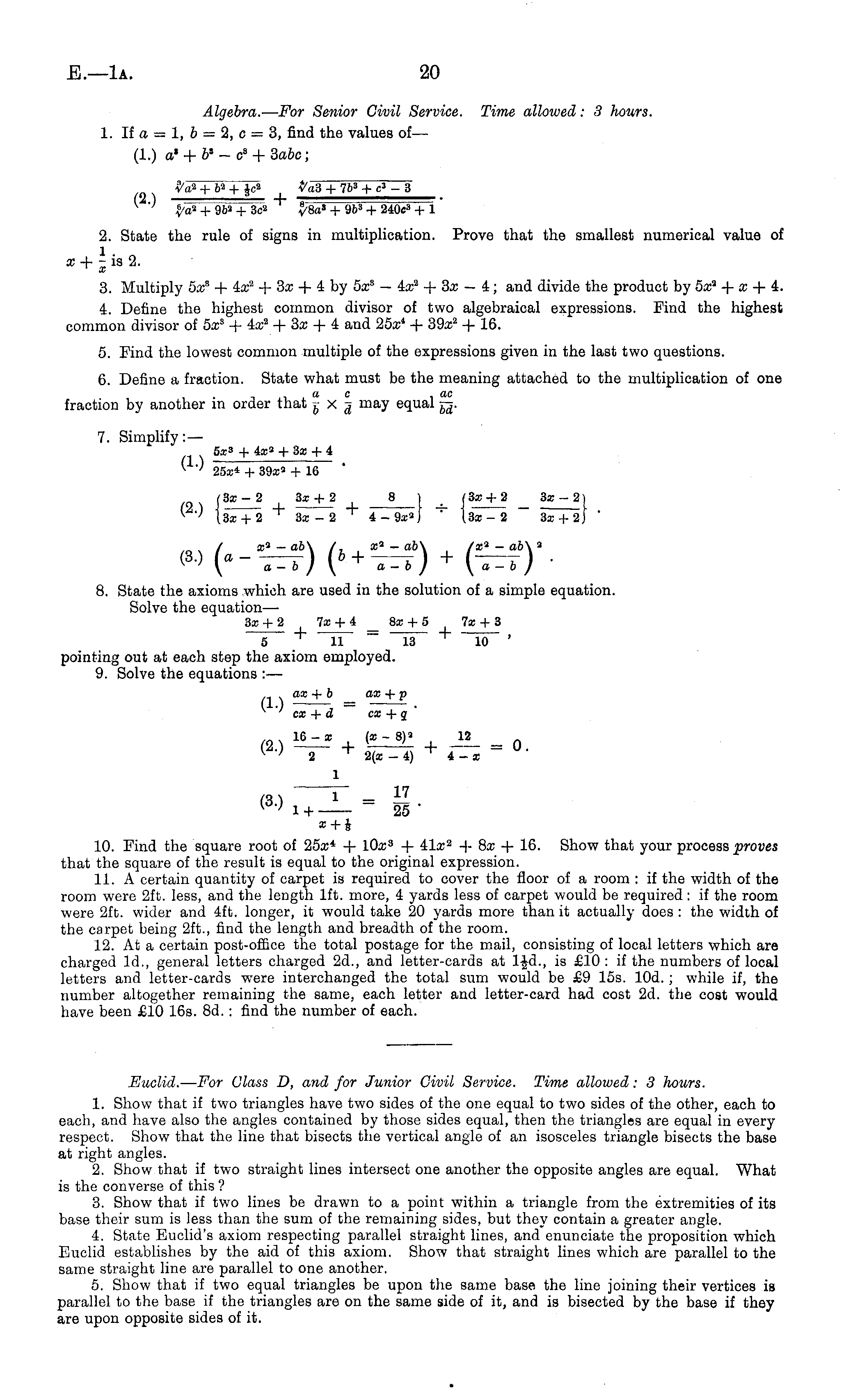 Algebra. — For Senior Civil Service. Time allowed: 3 hours. 1. If a = 1, b = 2, c = 3, find the values of— (1.) a , + b'- c s + 3abc; Vα? + i> 2 + Jc2 ffn3 + 7fc 3 + c 3 - 3 *• ' ff& 4. gp + Be* V&F+ 96 3 + 240e 3 + 1 2. State the rule of signs in multiplication. Prove that the smallest numerical value of a? + 3. Multiply 5a; 8 + 4a; 2 + 3a; +4 by 5a; 3 - 4z 2 + 3a; -4; and divide the product by sx* +x+ 4. 4. Define the highest common divisor of two algebraical expressions. Find the highest common divisor of 5a; 8 + 4a; 2 + 3a; + 4 and 25a; 1 + 39a; 2 + 16. 5. Find the lowest common multiple of the expressions given in the last two questions. 6. Define a fraction. State what must be the meaning attached to the multiplication of one fraction by another in order that may equal 7. Simplify:— 5a 3 + 4s? +3a + 4 ( "' 25a;* + 39x» + 16 (3a- 2 r 3a+ 2 8 | (3a; + 2 _ 3a-2j ' '' J 3a + 2 + 3x - 2 + 4-9a 2 } ' \3a-2 " 3a +2J " 8. State the axioms which are used in the solution of a simple equation. Solve the equation— 3x + 2 7a + 4 8a + 5 7x + 3 ~~ 5 *~ 11 13 W ' pointing out at each step the axiom employed. 9. Solve the equations :— '' ex + d " ex +q ' J2_ X ' 2 2(a-4) 4-a 1 (3l) 1 + - 25--a + 4 10. Find the square root of 25x* + 10a; 3 + 41a; 2 +8x + 16. Show that your process proves that the square of the result is equal to the original expression. 11. A certain quantity of carpet is required to cover the floor of a room : if the width of the room were 2ft. less, and the length lft. more, 4 yards less of carpet would be required: if the room were 2ft. wider and 4ft. longer, it would take 20 yards more than it actually does : the width of the carpet being 2ft., find the length and breadth of the room. 12. At a certain post-office the total postage for the mail, consisting of local letters which are charged Id., general letters charged 2d., and letter-cards at 1-Jd., is £10 : if the numbers of local letters and letter-cards were interchanged the total sum would be £9 15s. 10d. ; while if, the number altogether remaining the same, each letter and letter-card had cost 2d. the cost would have been £10 16s. Bd.: find the number of each.