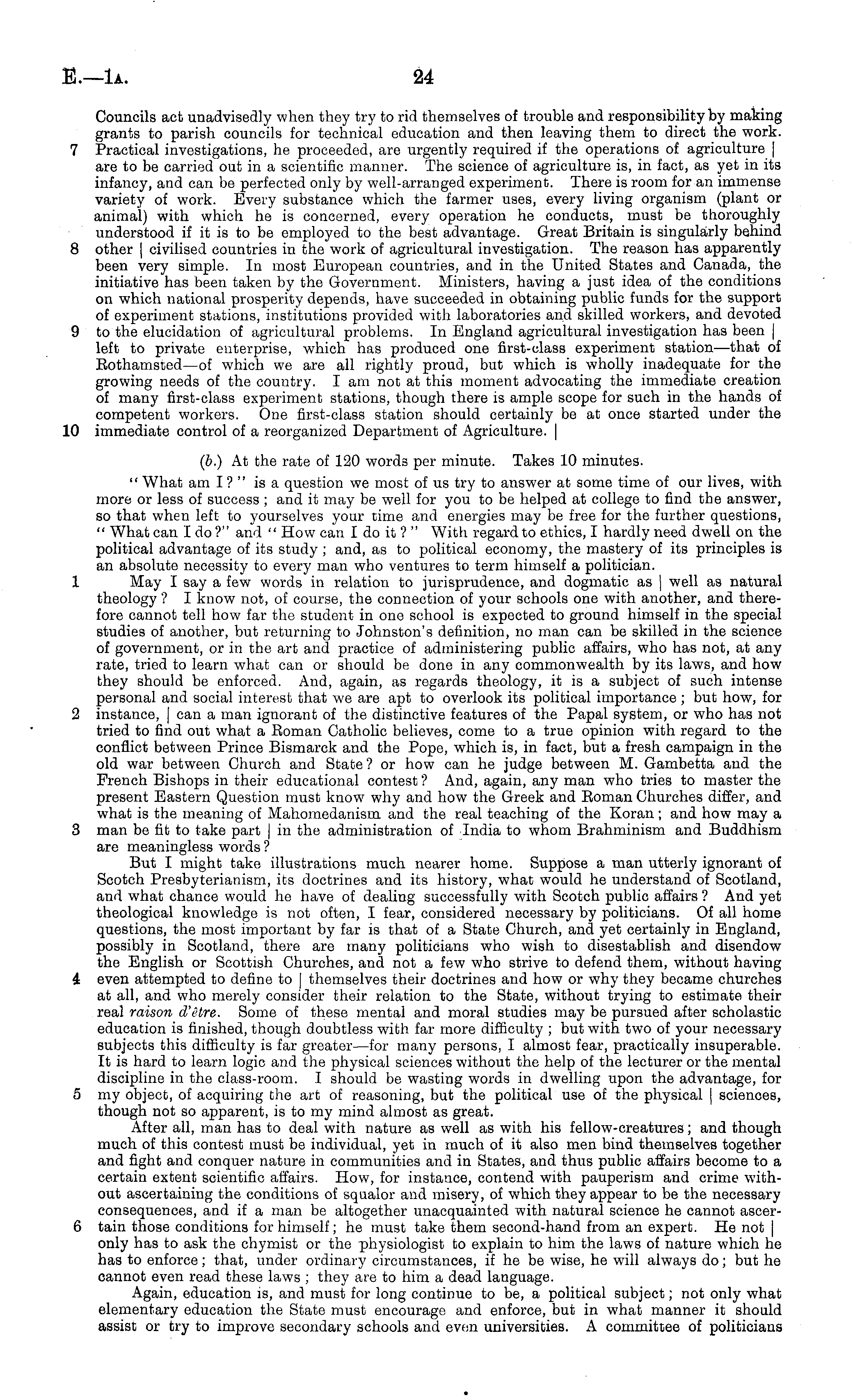 Councils act unadvisedly when they try to rid themselves of trouble and responsibility by making grants to parish councils for technical education and then leaving them to direct the work. 7 Practical investigations, he proceeded, are urgently required if the operations of agriculture | are to be carried out in a scientific manner. The science of agriculture is, in fact, as yet in its infancy, and can be perfected only by well-arranged experiment. There is room for an immense variety of work. Every substance which the farmer uses, every living organism (plant or animal) with which he is concerned, every operation he conducts, must be thoroughly understood if it is to be employed to the best advantage. Great Britain is singularly behind 8 other | civilised countries in the work of agricultural investigation. The reason has apparently been very simple. In most European countries, and in the United States and Canada, the initiative has been taken by the Government. Ministers, having a just idea of the conditions on which national prosperity depends, have succeeded in obtaining public funds for the support of experiment stations, institutions provided with laboratories and skilled workers, and devoted 9 to the elucidation of agricultural problems. In England agricultural investigation has been | left to private enterprise, which has produced one first-class experiment station —that of Rothamsted—of which we are all rightly proud, but which is wholly inadequate for the growing needs of the country. I am not at this moment advocating the immediate creation of many first-class experiment stations, though there is ample scope for such in the hands of competent workers. One first-class station should certainly be at once started under the 10 immediate control of a reorganized Department of Agriculture. | (b.) At the rate of 120 words per minute. Takes 10 minutes. " What am I ? " is a question we most of us try to answer at some time of our lives, with more or less of success ; and it may be well for you to be helped at college to find the answer, so that when left to yourselves your time and energies may be free for the further questions, " What can Ido ?" and " How can I do it ? " With regard to ethics, I hardly need dwell on the political advantage of its study ; and, as to political economy, the mastery of its principles is an absolute necessity to every man who ventures to term himself a politician. 1 May I say a few words in relation to jurisprudence, and dogmatic as | well as natural theology ? I know not, of course, the connection of your schools one with another, and therefore cannot tell how far the student in one school is expected to ground himself in the special studies of another, but returning to Johnston's definition, no man can be skilled in the science of government, or in the art and practice of administering public affairs, who has not, at any rate, tried to learn what can or should be done in any commonwealth by its laws, and how they should be enforced. And, again, as regards theology, it is a subject of such intense personal and social interest that we are apt to overlook its political importance ; but how, for 2 instance, | can a man ignorant of the distinctive features of the Papal system, or who has not tried to find out what a Roman Catholic believes, come to a true opinion with regard to the conflict between Prince Bismarck and the Pope, which is, in fact, but a fresh campaign in the old war between Church and State? or how can he judge between M. Gambetta and the French Bishops in their educational contest'? And, again, any man who tries to master the present Eastern Question must know why and how the Greek and Roman Churches differ, and what is the meaning of Mahomedanism and the real teaching of the Koran ; and how may a 3 man be fit to take part |in the administration of India to whom Brahminism and Buddhism are meaningless words ? But I might take illustrations much nearer home. Suppose a man utterly ignorant of Scotch Presbyterianism, its doctrines and its history, what would he understand of Scotland, and what chance would he have of dealing successfully with Scotch public affairs ? And yet theological knowledge is not often, I fear, considered necessary by politicians. Of all home questions, the most important by far is that of a State Church, and yet certainly in England, possibly in Scotland, there are many politicians who wish to disestablish and disendow the English or Scottish Churches, and not a few who strive to defend them, without having 4 even attempted to define to | themselves their doctrines and how or why they became churches at all, and who merely consider their relation to the State, without trying to estimate their real raison d'etre. Some of these mental and moral studies may be pursued after scholastic education is finished, though doubtless with far more difficulty ; but with two of your necessary subjects this difficulty is far greater—for many persons, I almost fear, practically insuperable. It is hard to learn logic and the physical sciences without the help of the lecturer or the mental discipline in the class-room. I should be wasting words in dwelling upon the advantage, for 5 my object, of acquiring the art of reasoning, but the political use of the physical | sciences, though not so apparent, is to my mind almost as great. After all, man has to deal with nature as well as with his fellow-creatures; and though much of this contest must be individual, yet in much of it also men bind themselves together and fight and conquer nature in communities and in States, and thus public affairs become to a certain extent scientific affairs. How, for instance, contend with pauperism and crime without ascertaining the conditions of squalor and misery, of which they appear to be the necessary consequences, and if a man be altogether unacquainted with natural science he cannot ascer--6 tain those conditions for himself; he must take them second-