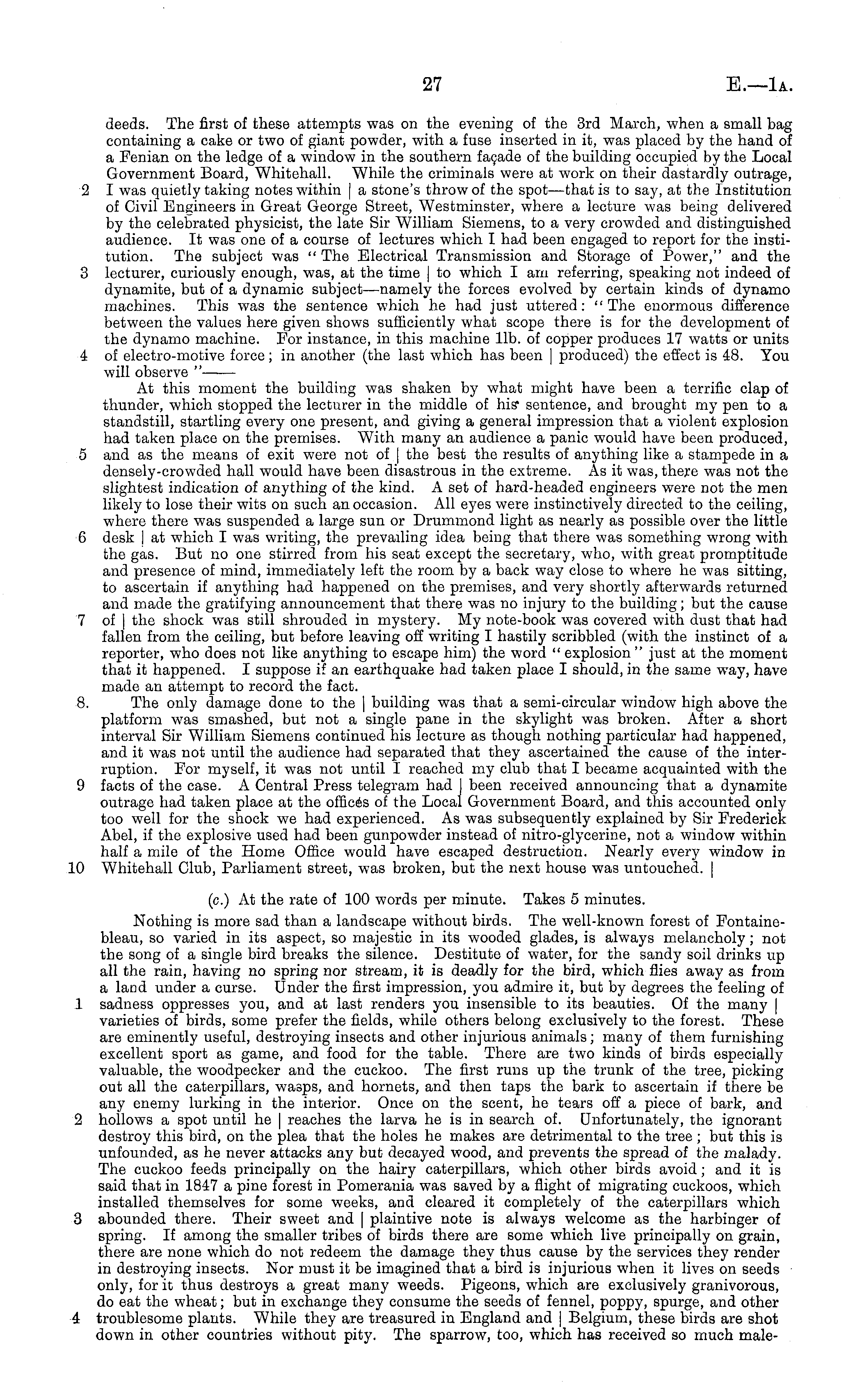 deeds. The first of these attempts was on the evening of the 3rd March, when a small bag containing a cake or two of giant powder, with a fuse inserted in it, was placed by the hand of a Fenian on the ledge of a window in the southern facade of the building occupied by the Local Government Board, Whitehall. While the criminals were at work on their dastardly outrage, 2 I was quietly taking notes within | a stone's throw of the spot —that is to say, at the Institution of Civil Engineers in Great George Street, Westminster, where a lecture was being delivered by the celebrated physicist, the late Sir William Siemens, to a very crowded and distinguished audience. It was one of a course of lectures which I had been engaged to report for the institution. The subject was " The Electrical Transmission and Storage of Power," and the 3 lecturer, curiously enough, was, at the time |to which I am referring, speaking not indeed of dynamite, but of a dynamic subject—namely the forces evolved by certain kinds of dynamo machines. This was the sentence which he had just uttered: " The enormous difference between the values here given shows sufficiently what scope there is for the development of the dynamo machine. For instance, in this machine lib. of copper produces 17 watts or units 4 of electro-motive force; in another (the last which has been | produced) the effect is 48. You will observe " At this moment the building was shaken by what might have been a terrific clap of thunder, which stopped the lecturer in the middle of his , sentence, and brought my pen to a standstill, startling every one present, and giving a general impression that a violent explosion had taken place on the premises. With many an audience a panic would have been produced, 5 and as the means of exit were not of | the best the results of anything like a stampede in a densely-crowded hall would have been disastrous in the extreme. As it was, there was not the slightest indication of anything of the kind. A set of hard-headed engineers were not the men likely to lose their wits on such an occasion. All eyes were instinctively directed to the ceiling, where there was suspended a large sun or Drummond light as nearly as possible over the little 6 desk Jat which I was writing, the prevailing idea being that there was something wrong with the gas. But no one stirred from his seat except the secretary, who, with great promptitude and presence of mind, immediately left the room by a back way close to where he was sitting, to ascertain if anything had happened on the premises, and very shortly afterwards returned and made the gratifying announcement that there was no injury to the building; but the cause 7 of I the shock was still shrouded in mystery. My note-book was covered with dust that had fallen from the ceiling, but before leaving off writing I hastily scribbled (with the instinct of a reporter, who does not like anything to escape him) the word " explosion " just at the moment that it happened. I suppose if an earthquake had taken place I should, in the same way, have made an attempt to record the fact. 8. The only damage done to the | building was that a semi-circular window high above the platform was smashed, but not a single pane in the skylight was broken. After a short interval Sir William Siemens continued his lecture as though nothing particular had happened, and it was not until the audience had separated that they ascertained the cause of the interruption. For myself, it was not until I reached my club that I became acquainted with the 9 facts of the case. A Central Press telegram had | been received announcing that a dynamite outrage had taken place at the offices of the Local Government Board, and this accounted only too well for the shock we had experienced. As was subsequently explained by Sir Frederick Abel, if the explosive used had been gunpowder instead of nitro-glycerine, not a window within half a mile of the Home Office would have escaped destruction. Nearly every window in 10 Whitehall Club, Parliament street, was broken, but the next house was untouched. | (c.) At the rate of 100 words per minute. Takes 5 minutes. Nothing is more sad than a landscape without birds. The well-known forest of Fontainebleau, so varied in its aspect, so majestic in its wooded glades, is always melancholy; not the song of a single bird breaks the silence. Destitute of water, for the sandy soil drinks up all the rain, having no spring nor stream, it is deadly for the bird, which flies away as from a land under a curse. Under the first impression, you admire it, but by degrees the feeling of 1 sadness oppresses you, and at last renders you insensible to its beauties. Of the many | varieties of birds, some prefer the fields, while others belong exclusively to the forest. These are eminently useful, destroying insects and other injurious animals; many of them furnishing excellent sport as game, and food for the table. There are two kinds of birds especially valuable, the woodpecker and the cuckoo. The first runs up the trunk of the tree, picking out all the caterpillars, wasps, and hornets, and then taps the bark to ascertain if there be any enemy lurking in the interior. Once on the scent, he tears off a piece of bark, and 2 hollows a spot until he | reaches the larva he is in search of. Unfortunately, the ignorant destroy this bird, on the plea that the holes he makes are detrimental to the tree ; but this is unfounded, as he never attacks any but decayed wood, and prevents the spread of the malady. The cuckoo feeds principally on the hairy caterpillars, which other birds avoid ; and it is said that in 1847 a pine forest in Pomerauia was saved by a flight of migrating cuckoos, which installed themselves for some weeks, and cleared it completely of the caterpillars which 3 abounded there. Their sweet and | plaintive note is always welcome as the harbinger of spring. If among the smaller tribes of birds there are some which live