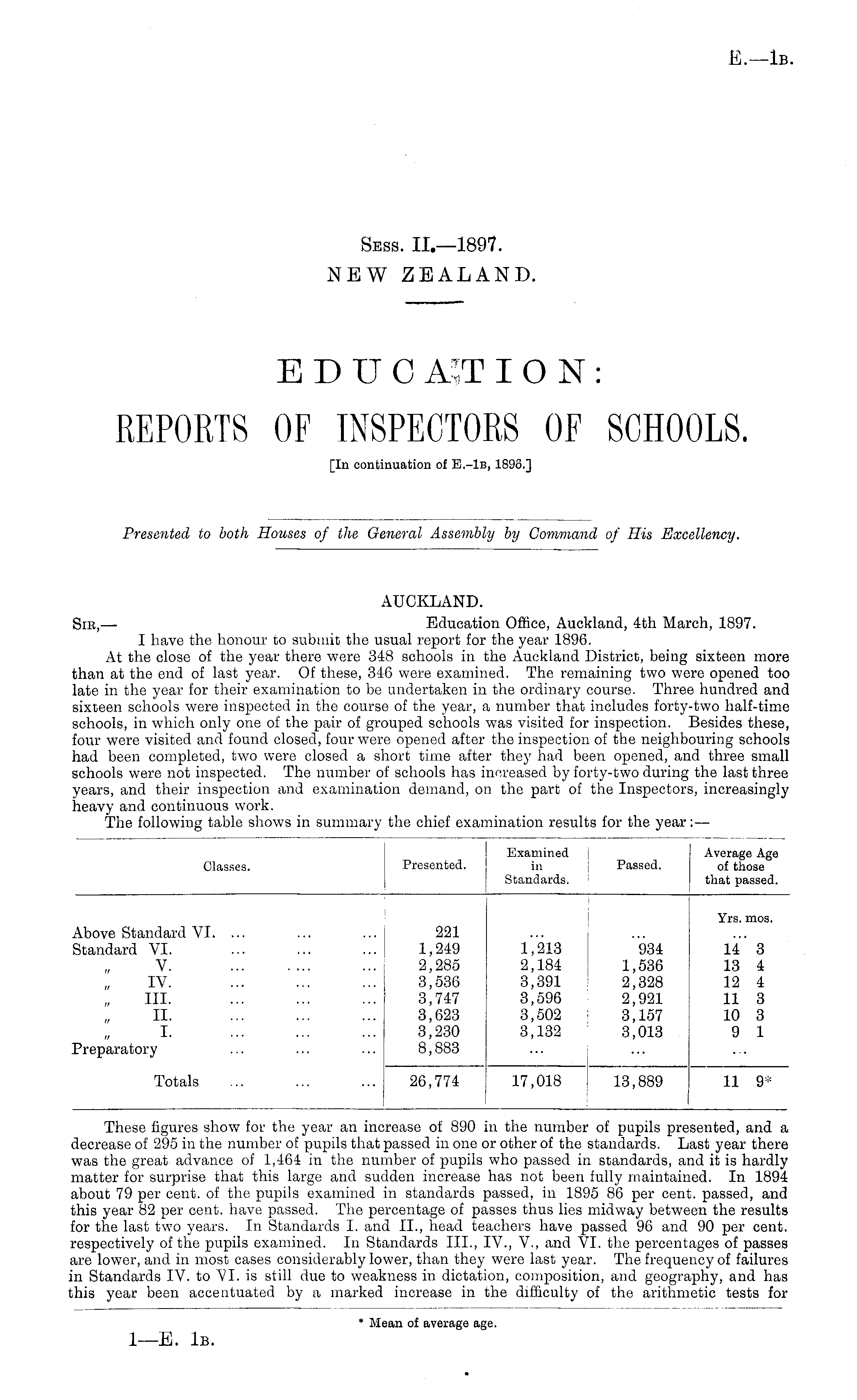 AUCKLAND. Sic,— Education Office, Auckland, 4th March, 1897. I have the honour to submit the usual report for the year 1896. At the close of the year there were 348 schools in the Auckland District, being sixteen more than at the end of last year. Of these, 346 were examined. The remaining two were opened too late in the year for their examination to be undertaken in the ordinary course. Three hundred and sixteen schools were inspected in the course of the year, a number that includes forty-two half-time schools, in which only one of the pair of grouped schools was visited for inspection. Besides these, four were visited and found closed, four were opened after the inspection of the neighbouring schools had been completed, two were closed a short time after they had been opened, and three small schools were not inspected. The number of schools has increased by forty-two during the last three years, and their inspection and examination demand, on the part of the Inspectors, increasingly heavy and continuous work.