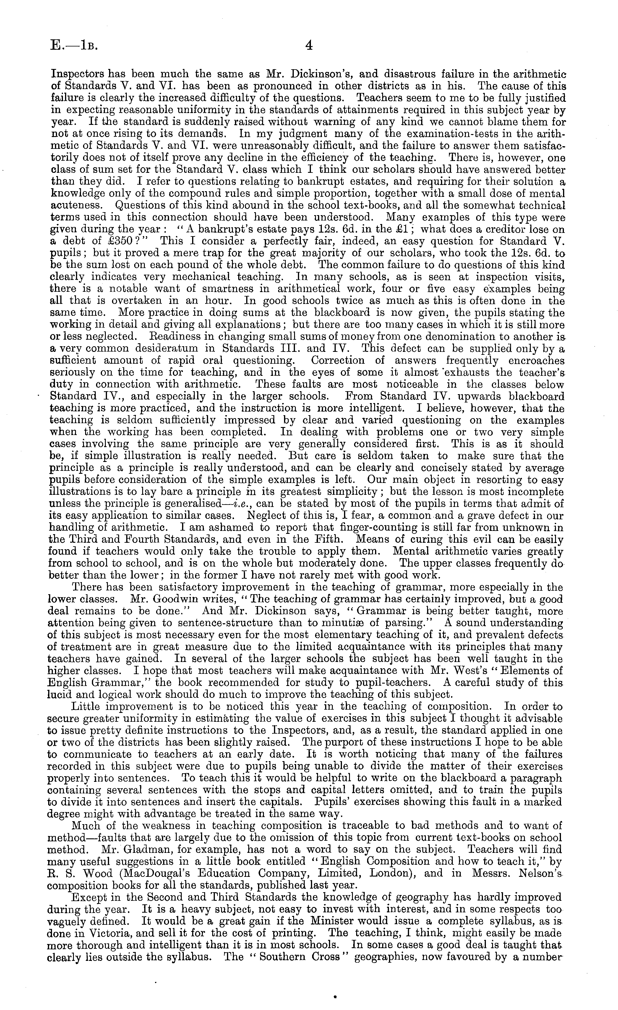 Inspectors has been much the same as Mr. Dickinson's, and disastrous failure in the arithmetic of Standards V. and VI. has been as pronounced in other districts as in his. The cause of this failure is clearly the increased difficulty of the questions. Teachers seem to me to be fully justified in expecting reasonable uniformity in the standards of attainments required in this subject year by year. If the standard is suddenly raised without warning of any kind we cannot blame them for not at once rising to its demands. In my judgment many of the examination-tests in the arithmetic of Standards V. and VI. were unreasonably difficult, and the failure to answer them satisfactorily does not of itself prove any decline in the efficiency of the teaching. There is, however, one class of sum set for the Standard V. class which I think our scholars should have answered better than they did. I refer to questions relating to bankrupt estates, and requiring for their solution a knowledge only of the compound rules and simple proportion, together with a small dose of mental acuteness. Questions of this kind abound in the school text-books, and all the somewhat technical terms used in this connection should have been understood. Many examples of this type were given during the year :" A bankrupt's estate pays 12s. 6d. in the £1; what does a creditor lose on a debt of £350?" This I consider a perfectly fair, indeed, an easy question for Standard V. pupils; but it proved a mere trap for the great majority of our scholars, who took the 12s. 6d. to be the sum lost on each pound of the whole debt. The common failure to do questions of this kind clearly indicates very mechanical teaching. In many schools, as is seen at inspection visits, there is a notable want of smartness in arithmetical work, four or five easy examples being all that is overtaken in an hour. In good schools twice as much as this is often done in the same time. More practice in doing sums at the blackboard is now given, the pupils stating the working in detail and giving all explanations ; but there are too many cases in which it is still more or less neglected. Readiness in changing small sums of money from one denomination to another is a very common desideratum in Standards 111. and IV. This defect can be supplied only by a sufficient amount of rapid oral questioning. Correction of answers frequently encroaches seriously on the time for teaching, and in the eyes of some it almost 'exhausts the teacher's duty in connection with arithmetic. These faults are most noticeable in the classes below Standard IV., and especially in the larger schools. From Standard IV. upwards blackboard teaching is more practiced, and the instruction is more intelligent. I believe, however, that the teaching is seldom sufficiently impressed by clear and varied questioning on the examples when the working has been completed. In dealing with problems one or two very simple cases involving the same principle are very generally considered first. This is as it should be, if simple illustration is really needed. But care is seldom taken to make sure that the principle as a principle is really understood, and can be clearly and concisely stated by average pupils before consideration of the simple examples is left. Our main object in resorting to easy illustrations is to lay bare a principle in its greatest simplicity ; but the lesson is most incomplete unless the principle is generalised— i.e., can be stated by most of the pupils in terms that admit of its easy application to similar cases. Neglect of this is, I fear, a common and a grave defect in our handling of arithmetic. lam ashamed to report that finger-counting is still far from unknown in the Third and Fourth Standards, and even in the Fifth. Means of curing this evil can be easily found if teachers would only take the trouble to apply them. Mental arithmetic varies greatly from school to school, and is on the whole but moderately done. The upper classes frequently do better than the lower; in the former I have not rarely met with good work. There has been satisfactory improvement in the teaching of grammar, more especially in the lower classes. Mr. Goodwin writes, " The teaching of grammar has certainly improved, but a good deal remains to be done." And Mr. Dickinson says, " Grammar is being better taught, more attention being given to sentence-structure than to minutias of parsing." A sound understanding of this subject is most necessary even for the most elementary teaching of it, and prevalent defects of treatment are in great measure due to the limited acquaintance with its principles that many teachers have gained. In several of the larger schools the subject has been well taught in the higher classes. I hope that most teachers will make acquaintance with Mr. West's " Elements of English. Grammar," the book recommended for study to pupil-teachers. A careful study of this lucid and logical work should do much to improve the teaching of this subject. Little improvement is to be noticed this year in the teaching of composition. In order to secure greater uniformity in estimating the value of exercises in this subject I thought it advisable to issue pretty definite instructions to the Inspectors, and, as a result, the standard applied in one or two of the districts has been slightly raised. The purport of these instructions I hope to be able to communicate to teachers at an early date. It is worth noticing that many of the failures recorded in this subject were due to pupils being unable to divide the matter of their exercises properly into sentences. To teach this it would be helpful to write on the blackboard a paragraph containing several sentences with the stops and capital letters omitted, and to train the pupils to divide it into sentences and insert the capitals. Pupils' exercises showing this fault in a marked degree might with advantage be treated in the same way. Much of the weakness in teaching