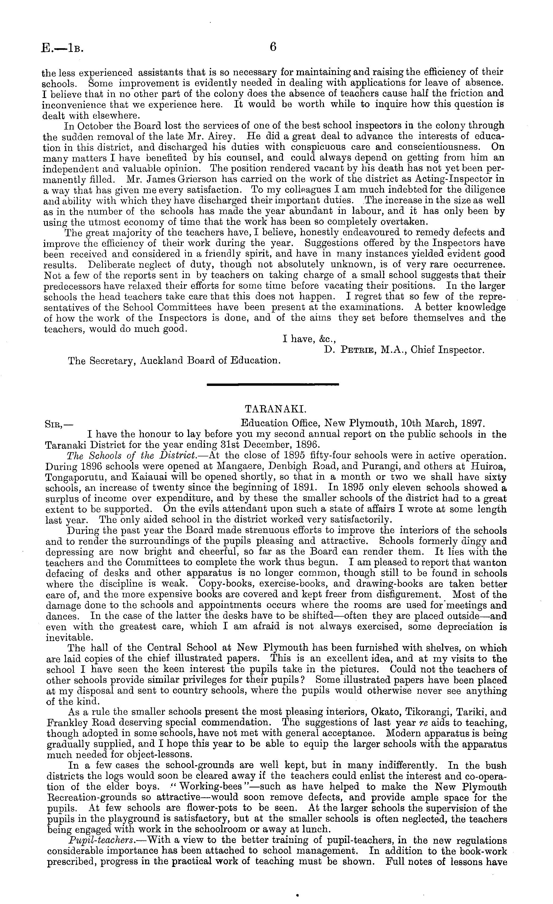 TARANAKI. Sib,— Education Office, New Plymouth, 10th March, 1897. I have the honour to lay before you my second annual report on the public schools in the Taranaki District for the year ending 31st December, 1896. The Schools of the District. —At the close of 1895 fifty-four schools were in active operation. During 1896 schools were opened at Mangaere, Denbigh Road, and Purangi, and others at Huiroa, Tongaporutu, and Kaiauai will be opened shortly, so that in a month or two we shall have sixty schools, an increase of twenty since the beginning of 1891. In 1895 only eleven schools showed a surplus of income over expenditure, and by these the smaller schools of the district had to a great extent to be supported. On the evils attendant upon such a state of affairs I wrote at some length last year. The only aided school in the district worked very satisfactorily. During the past year the Board made strenuous efforts to improve the interiors of the schools and to render the surroundings of the pupils pleasing and attractive. Schools formerly dingy and depressing are now bright and cheerful, so far as the Board can render them. It lies with the teachers and the Committees to complete the work thus begun. lam pleased to report that wanton defacing of desks and other apparatus is no longer common, though still to be found in schools where the discipline is weak. Copy-books, exercise-books, and drawing-books are taken better care of, and the more expensive books are covered and kept freer from disfigurement. Most of the damage done to the schools and appointments occurs where the rooms are used for'meetings and dances. In the case of the latter the desks have to be shifted—often they are placed outside—and even with the greatest care, which I am afraid is not always exercised, some depreciation is inevitable. The hall of the Central School at New Plymouth has been furnished with shelves, on which are laid copies of the chief illustrated papers. This is an excellent idea, and at my visits to the school I have seen the keen interest the pupils take in the pictures. Could not the teachers of other schools provide similar privileges for their pupils ? Some illustrated papers have been placed at my disposal and sent to country schools, where the pupils would otherwise never see anything of the kind. As a rule the smaller schools present the most pleasing interiors, Okato, Tikorangi, Tariki, and Frankley Road deserving special commendation. The suggestions of last year re aids to teaching, though adopted in some schools, have not met with general acceptance. Modern apparatus is being gradually supplied, and I hope this year to be able to equip the larger schools with the apparatus much needed for object-lessons. In a few cases the school-grounds are well kept, but in many indifferently. In the bush districts the logs would soon be cleared away if the teachers could enlist the interest and co-opera-tion of the elder boys. "Working-bees"—such as have helped to make the New Plymouth Recreation-grounds so attractive—would soon remove defects, and provide ample space for the pupils. At few schools are flower-pots to be seen. At the larger schools the supervision of the pupils in the playground is satisfactory, but at the smaller schools is often neglected, the teachers being engaged with work in the schoolroom or away at lunch. Pupil-teachers. —With a view to the better training of pupil-teachers, in the new regulations considerable importance has been attached to school management. In addition to the book-work prescribed, progress in the practical work of teaching must be shown. Pull notes of lessons have
