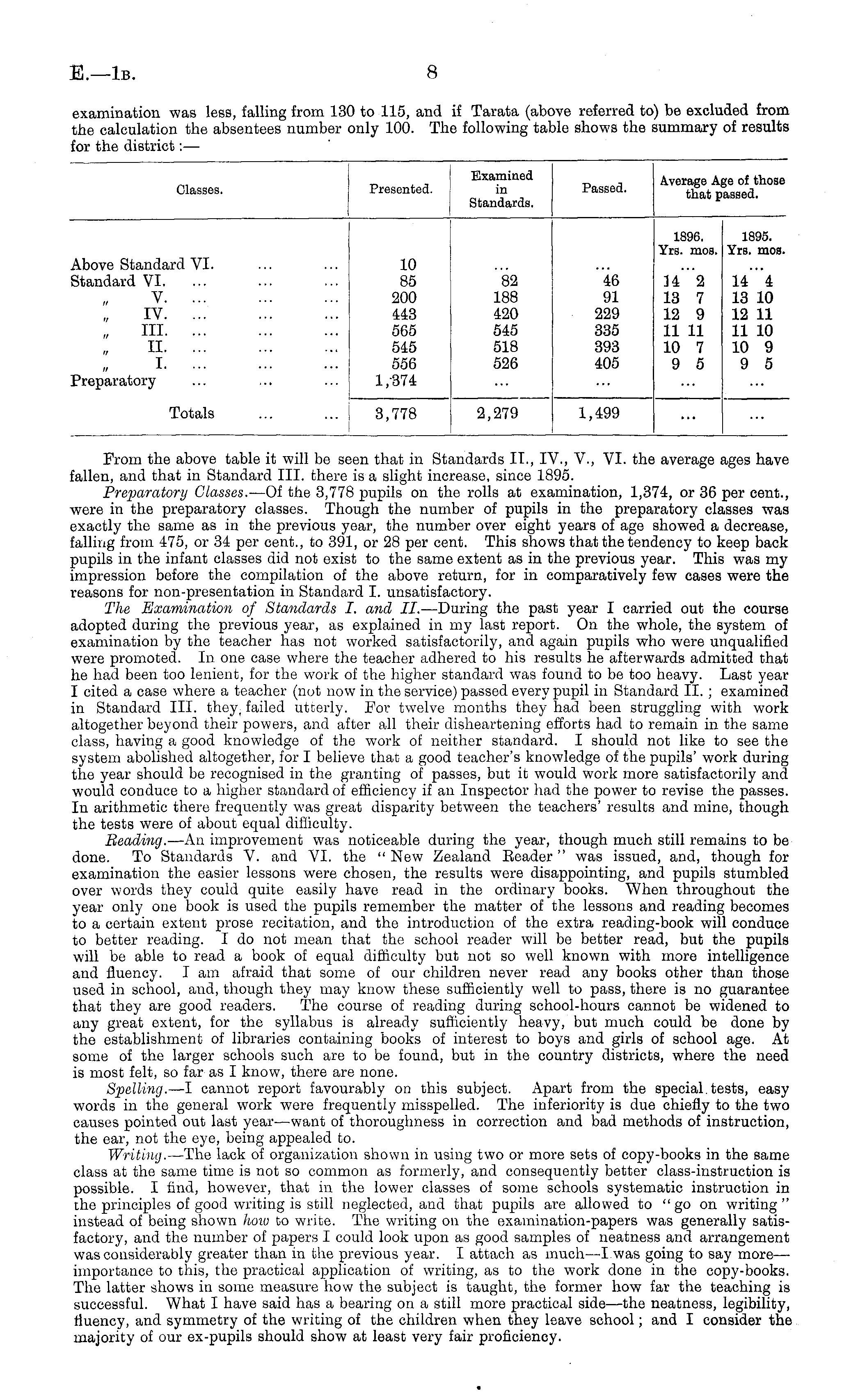 From the above table it will be seen that in Standards 11., IV., V., VI. the average ages have fallen, and that in Standard 111. there is a slight increase, since 1895. Preparatory Glasses. —Of the 3,778 pupils on the rolls at examination, 1,374, or 36 per cent., were in the preparatory classes. Though the number of pupils in the preparatory classes was exactly the same as in the previous year, the number over eight years of age showed a decrease, falling from 475, or 34 per cent., to 391, or 28 per cent. This shows that the tendency to keep back pupils in the infant classes did not exist to the same extent as in the previous year. This was my impression before the compilation of the above return, for in comparatively few cases were the reasons for non-presentation in Standard I. unsatisfactory. The Examination of Standards I. and ll. —During the past year I carried out the course adopted during the previous year, as explained in my last report. On the whole, the system of examination by the teacher has not worked satisfactorily, and. again pupils who were unqualified were promoted. In one case where the teacher adhered to his results he afterwards admitted that he had been too lenient, for the work of the higher standard was found to be too heavy. Last year I cited a case where a teacher (not now in the service) passed every pupil in Standard 11. ; examined in Standard 111. they, failed utterly. For twelve months they had been struggling with work altogether beyond their powers, and after all their disheartening efforts had to remain in the same class, having a good knowledge of the work of neither standard. I should not like to see the system abolished altogether, for I believe that a good teacher's knowledge of the pupils' work during the year should be recognised in the granting of passes, but it would work more satisfactorily and would conduce to a higher standard of efficiency if an Inspector had the power to revise the passes. In arithmetic there frequently was great disparity between the teachers' results and mine, though the tests were of about equal difficulty. Beading. —An improvement was noticeable during the year, though much still remains to be done. To Standards V. and VI. the " New Zealand Eeader" was issued, and, though for examination the easier lessons were chosen, the results were disappointing, and pupils stumbled over words they could quite easily have read in the ordinary books. When throughout the year only one book is used the pupils remember the matter of the lessons and reading becomes to a certain extent prose recitation, and the introduction of the extra reading-book will conduce to better reading. I do not mean that the school reader will be better read, but the pupils will be able to read a book of equal difficulty but not so well known with more intelligence and fluency. lam afraid that some of our children never read any books other than those used in school, and, though they may know these sufficiently well to pass, there is no guarantee that they are good readers. The course of reading during school-hours cannot be widened to any great extent, for the syllabus is already sufficiently heavy, but much could be done by the establishment of libraries containing books of interest to boys and girls of school age. At some of the larger schools such are to be found, but in the country districts, where the need is most felt, so far as I know, there are none. Spelling. —l cannot report favourably on this subject. Apart from the special tests, easy words in the general work were frequently misspelled. The inferiority is due chiefly to the two causes pointed out last year—want of thoroughness in correction and bad methods of instruction, the ear, not the eye, being appealed to. Writing. —The lack of organization shown in using two or more sets of copy-books in the same class at the same time is not so common as formerly, and consequently better class-instruction is possible. I find, however, that in the lower classes of some schools systematic instruction in the principles of good writing is still neglected, and that pupils are allowed to "go on writing" instead of being shown lioiv to write. The writing on the examination-papers was generally satisfactory, and the number of papers I could look upon as good samples of neatness and arrangement was considerably greater than in the previous year. I attach as much—l was going to say more— importance to this, the practical application of writing, as to the work done in the copy-books. The latter shows in some measure how the subject is taught, the former how far the teaching is successful. What I have said has a bearing on a still more practical side—the neatness, legibility, fluency, and symmetry of the writing of the children when they leave school; and I consider the majority of our ex-pupils should show at least very fair proficiency.