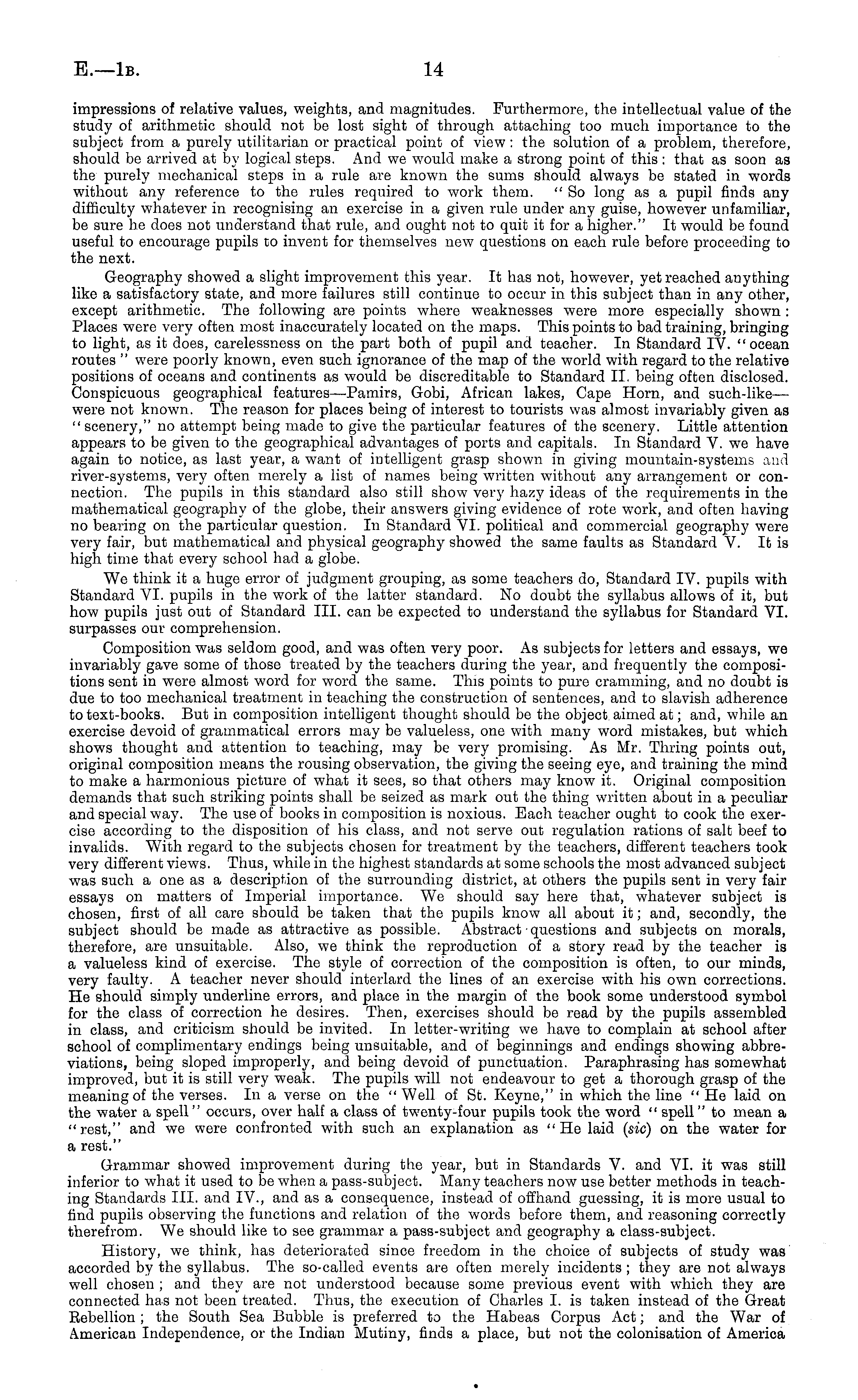 impressions of relative values, weights, and magnitudes. Furthermore, the intellectual value of the study of arithmetic should not be lost sight of through attaching too much importance to the subject from a purely utilitarian or practical point of view : the solution of a problem, therefore, should be arrived at by logical steps. And we would make a strong point of this : that as soon as the purely mechanical steps in a rule are known the sums should always be stated in words without any reference to the rules required to work them. "So long as a pupil finds any difficulty whatever in recognising an exercise in a given rule under any guise, however unfamiliar, be sure he does not understand that rule, and ought not to quit it for a higher." It would be found useful to encourage pupils to invent for themselves new questions on each rule before proceeding to the next. Geography showed a slight improvement this year. It has not, however, yet reached anything like a satisfactory state, and more failures still continue to occur in this subject than in any other, except arithmetic. The following are points where weaknesses were more especially shown : Places were very often most inaccurately located on the maps. This points to bad training, bringing to light, as it does, carelessness on the part both of pupil and teacher. In Standard IV. "ocean routes " were poorly known, even such ignorance of the map of the world with regard to the relative positions of oceans and continents as would be discreditable to Standard 11. being often disclosed. Conspicuous geographical features —Pamirs, Gobi, African lakes, Cape Horn, and such-like— were not known. The reason for places being of interest to tourists was almost invariably given as "scenery," no attempt being made to give the particular features of the scenery. Little attention appears to be given to the geographical advantages of ports and capitals. In Standard V. we have again to notice, as last year, a want of intelligent grasp shown in giving mountain-systems and river-systems, very often merely a list of names being written without any arrangement or connection. The pupils in this standard also still show very hazy ideas of the requirements in the mathematical geography of the globe, their answers giving evidence of rote work, and often having no bearing on the particular question. In Standard VI. political and commercial geography were very fair, but mathematical and physical geography showed the same faults as Standard V. It is high time that every school had a globe. We think it a huge error of judgment grouping, as some teachers do, Standard IV. pupils with Standard VI. pupils in the work of the latter standard. No doubt the syllabus allows of it, but how pupils just out of Standard 111. can be expected to understand the syllabus for Standard VI. surpasses our comprehension. Composition was seldom good, and was often very poor. As subjects for letters and essays, we invariably gave some of those treated by the teachers during the year, and frequently the compositions sent in were almost word for word the same. This points to pure cramming, and no doubt is due to too mechanical treatment in teaching the construction of sentences, and to slavish adherence to text-books. But in composition intelligent thought should be the object aimed at; and, while an exercise devoid of grammatical errors may be valueless, one with many word mistakes, but which shows thought and attention to teaching, may be very promising. As Mr. Thring points out, original composition means the rousing observation, the giving the seeing eye, and training the mind to make a harmonious picture of what it sees, so that others may know it. Original composition demands that such striking points shall be seized as mark out the thing written about in a peculiar and special way. The use of books in composition is noxious. Bach teacher ought to cook the exercise according to the disposition of his class, and not serve out regulation rations of salt beef to invalids. With regard to the subjects chosen for treatment by the teachers, different teachers took very different views. Thus, while in the highest standards at some schools the most advanced subject was such a one as a description of the surrounding district, at others the pupils sent in very fair essays on matters of Imperial importance. We should say here that, whatever subject is chosen, first of all care should be taken that the pupils know all about it; and, secondly, the subject should be made as attractive as possible. Abstract questions and subjects on morals, therefore, are unsuitable. Also, we think the reproduction of a story read by the teacher is a valueless kind of exercise. The style of correction of the composition is often, to our minds, very faulty. A teacher never should interlard the lines of an exercise with his own corrections. He should simply underline errors, and place in the margin of the book some understood symbol for the class of correction he desires. Then, exercises should be read by the pupils assembled in class, and criticism should be invited. In letter-writing we have to complain at school after school of complimentary endings being unsuitable, and of beginnings and endings showing abbreviations, being sloped improperly, and being devoid of punctuation. Paraphrasing has somewhat improved, but it is still very weak. The pupils will not endeavour to get a thorough grasp of the meaning of the verses. In a verse on the " Well of St. Keyne," in which the line "He laid on the water a spell" occurs, over half a class of twenty-four pupils took the word " spell" to mean a "rest," and we were confronted with such an explanation as "He laid (sic) on the water for a rest." Grammar showed improvement during the year, but in Standards V. and VI. it was still inferior to what it used to be when a pass-subject. Many teachers now use better methods in teaching Standards 111. and IV., and as a consequence
