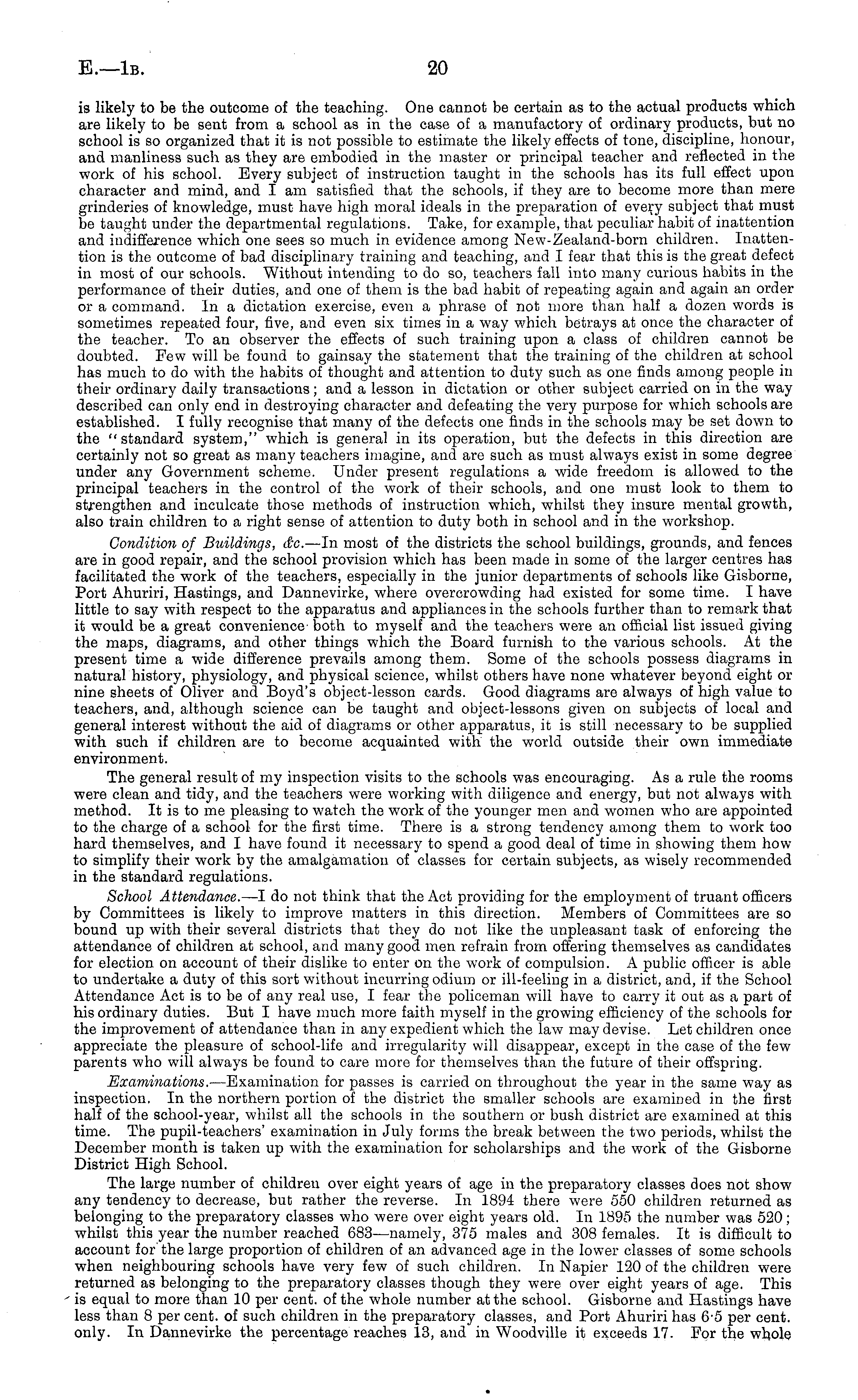 is likely to be the outcome of the teaching. One cannot be certain as to the actual products which are likely to be sent from a school as in the case of a manufactory of ordinary products, but no school is so organized that it is not possible to estimate the likely effects of tone, discipline, honour, and manliness such as they are embodied in the master or principal teacher and reflected in the work of his school. Every subject of instruction taught in the schools has its full effect upon character and mind, and I am satisfied that the schools, if they are to become more than mere grinderies of knowledge, must have high moral ideals in the preparation of every subject that must be taught under the departmental regulations. Take, for example, that peculiar habit of inattention and indifference which one sees so much in evidence among New-Zealand-born children. Inattention is the outcome of bad disciplinary training and teaching, and I fear that this is the great defect in most of our schools. Without intending to do so, teachers fall into many curious habits in the performance of their duties, and one of them is the bad habit of repeating again and again an order or a command. In a dictation exercise, even a phrase of not more than half a dozen words is sometimes repeated four, five, and even six times in a way which betrays at once the character of the teacher. To an observer the effects of such training upon a class of children cannot be doubted. Few will be found to gainsay the statement that the training of the children at school has much to do with the habits of thought and attention to duty such as one finds among people in their ordinary daily transactions; and a lesson in dictation or other subject carried on in the way described can only end in destroying character and defeating the very purpose for which schools are established. I fully recognise that many of the defects one finds in the schools may be set down to the "standard system," which is general in its operation, but the defects in this direction are certainly not so great as many teachers imagine, and are such as must always exist in some degree under any Government scheme. Under present regulations a wide freedom is allowed to the principal teachers in the control of the work of their schools, and one must look to them to strengthen and inculcate those methods of instruction which, whilst they insure mental growth, also train children to a right sense of attention to duty both in school and in the workshop. Condition of Buildings, &c. —ln most of the districts the school buildings, grounds, and fences are in good repair, and the school provision which has been made in some of the larger centres has facilitated the work of the teachers, especially in the junior departments of schools like Gisborne, Port Ahuriri, Hastings, and Dannevirke, where overcrowding had existed for some time. I have little to say with respect to the apparatus and appliances in the schools further than to remark that it would be a great convenience both to myself and the teachers were an official list issued giving the maps, diagrams, and other things which the Board furnish to the various schools. At the present time a wide difference prevails among them. Some of the schools possess diagrams in natural history, physiology, and physical science, whilst others have none whatever beyond eight or nine sheets of Oliver and Boyd's object-lesson cards. Good diagrams are always of high value to teachers, and, although science can be taught and object-lessons given on subjects of local and general interest without the aid of diagrams or other apparatus, it is still necessary to be supplied with such if children are to become acquainted with the world outside their own immediate environment. The general result of my inspection visits to the schools was encouraging. As a rule the rooms were clean and tidy, and the teachers were working with diligence and energy, but not always with method. It is to me pleasing to watch the work of the younger men and women who are appointed to the charge of a school for the first time. There is a strong tendency among them to work too hard themselves, and I have found it necessary to spend a good deal of time in showing them how to simplify their work by the amalgamation of classes for certain subjects, as wisely recommended in the standard regulations. School Attendance. —l do not think that the Act providing for the employment of truant officers by Committees is likely to improve matters in this direction. Members of Committees are so bound up with their several districts that they do not like the unpleasant task of enforcing the attendance of children at school, and many good men refrain from offering themselves as candidates for election on account of their dislike to enter on the work of compulsion. A public officer is able to undertake a duty of this sort without incurring odium or ill-feeling in a district, and, if the School Attendance Act is to be of any real use, I fear the policeman will have to carry it out as a part of his ordinary duties. But I have much more faith myself in the growing efficiency of the schools for the improvement of attendance than in any expedient which the law may devise. Let children once appreciate the pleasure of school-life and irregularity will disappear, except in the case of the few parents who will always be found to care more for themselves than the future of their offspring. Examinations. —Examination for passes is carried on throughout the year in the same way as inspection. In the northern portion of the district the smaller schools are examined in the first half of the school-year, whilst all the schools in the southern or bush district are examined at this time. The pupil-teachers' examination in July forms the break between the two periods, whilst the December month is taken up with the examination for scholarships and the work of the Gisborne District High School. Th