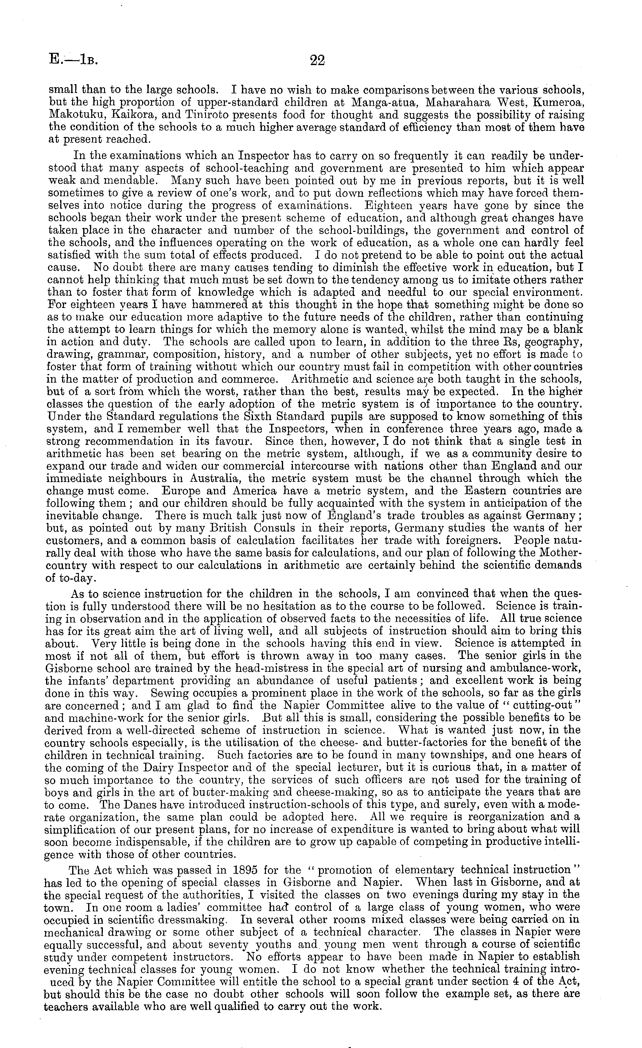 small than to the large schools. I have no wish to make comparisons between the various schools, but the high proportion of upper-standard children at Manga-atua, Maharahara West, Kumeroa, Makotuku, Kaikora, and Tiniroto presents food for thought and suggests the possibility of raising the condition of the schools to a much higher average standard of efficiency than most of them have at present reached. In the examinations which an Inspector has to carry on so frequently it can readily be understood that many aspects of school-teaching and government are presented to him which appear weak and mendable. Many such have been pointed out by me in previous reports, but it is well sometimes to give a review of one's work, and to put down reflections which may have forced themselves into notice during the progress of examinations. Eighteen years have gone by since the schools began their work under the present scheme of education, and although great changes have taken place in the character and number of the school-buildings, the government and control of the schools, and the influences operating on the work of education, as a whole one can hardly feel satisfied with the sum total of effects produced. Ido not pretend to be able to point out the actual cause. No doubt there are many causes tending to diminish the effective work in education, but I cannot help thinking that much must be set down to the tendency among us to imitate others rather than to foster that form of knowledge which is adapted and needful to our special environment. For eighteen years I have hammered at this thought in the hope that something might be done so as to make our education more adaptive to the future needs of the children, rather than continuing the attempt to learn things for which the memory alone is wanted, whilst the mind may be a blank in action and duty. The schools are called upon to learn, in addition to the three Es, geography, drawing, grammar, composition, history, and a number of other subjects, yet no effort is made to foster that form of training without which our country must fail in competition with other countries in the matter of production and commerce. Arithmetic and science are both taught in the schools, but of a sort from which the worst, rather than the best, results may be expected. In the higher classes the question of the early adoption of the metric system is of importance to the country. Under the Standard regulations the Sixth Standard pupils are supposed to know something of this system, and I remember well that the Inspectors, when in conference three years ago, made a strong recommendation in its favour. Since then, however, Ido not think that a single test in arithmetic has been set bearing on the metric system, although, if we as a community desire to expand our trade and widen our commercial intercourse with nations other than England and our immediate neighbours in Australia, the metric system must be the channel through which the change must come. Europe and America have a metric system, and the Eastern countries are following them ; and our children should be fully acquainted with the system in anticipation of the inevitable change. There is much talk just now of England's trade troubles as against Germany; but, as pointed out by many British Consuls in their reports, Germany studies the wants of her customers, and a common basis of calculation facilitates her trade with foreigners. People naturally deal with those who have the same basis for calculations, and our plan of following the Mothercountry with respect to our calculations in arithmetic are certainly behind the scientific demands of to-day. As to science instruction for the children in the schools, I am convinced that when the question is fully understood there will be no hesitation as to the course to be followed. Science is training in observation and in the application of observed facts to the necessities of life. All true science has for its great aim the art of living well, and all subjects of instruction should aim to bring this about. Very little is being done in the schools having this end in view. Science is attempted in most if not all of them, but effort is thrown away in too many cases. The senior girls in the Gisborne school are trained by the head-mistress in the special art of nursing and ambulance-work, the infants' department providing an abundance of useful patients ; and excellent work is being done in this way. Sewing occupies a prominent place in the work of the schools, so far as the girls are concerned ; and I am glad to find the Napier Committee alive to the value of " cutting-out" and machine-work for the senior girls. But all this is small, considering the possible benefits to be derived from a well-directed scheme of instruction in science. What is wanted just now, in the country schools especially, is the utilisation of the cheese- and butter-factories for the benefit of the children in technical training. Such factories are to be found in many townships, and one hears of the coming of the Dairy Inspector and of the special lecturer, but it is curious that, in a matter of so much importance to the country, the services of such officers are riot used for the training of boys and girls in the art of buoter-making and cheese-making, so as to anticipate the years that are to come. The Danes have introduced instruction-schools of this type, and surely, even with a moderate organization, the same plan could be adopted here. All we require is reorganization and a simplification of our present plans, for no increase of expenditure is wanted to bring about what will soon become indispensable, if the children are to grow up capable of competing in productive intelligence with those of other countries. The Act which was passed in 1895 for the " promotion of elementary technical instruction" has led to the opening of special classes in Gisborne and Napier. When last in Gisborne, and at the special req