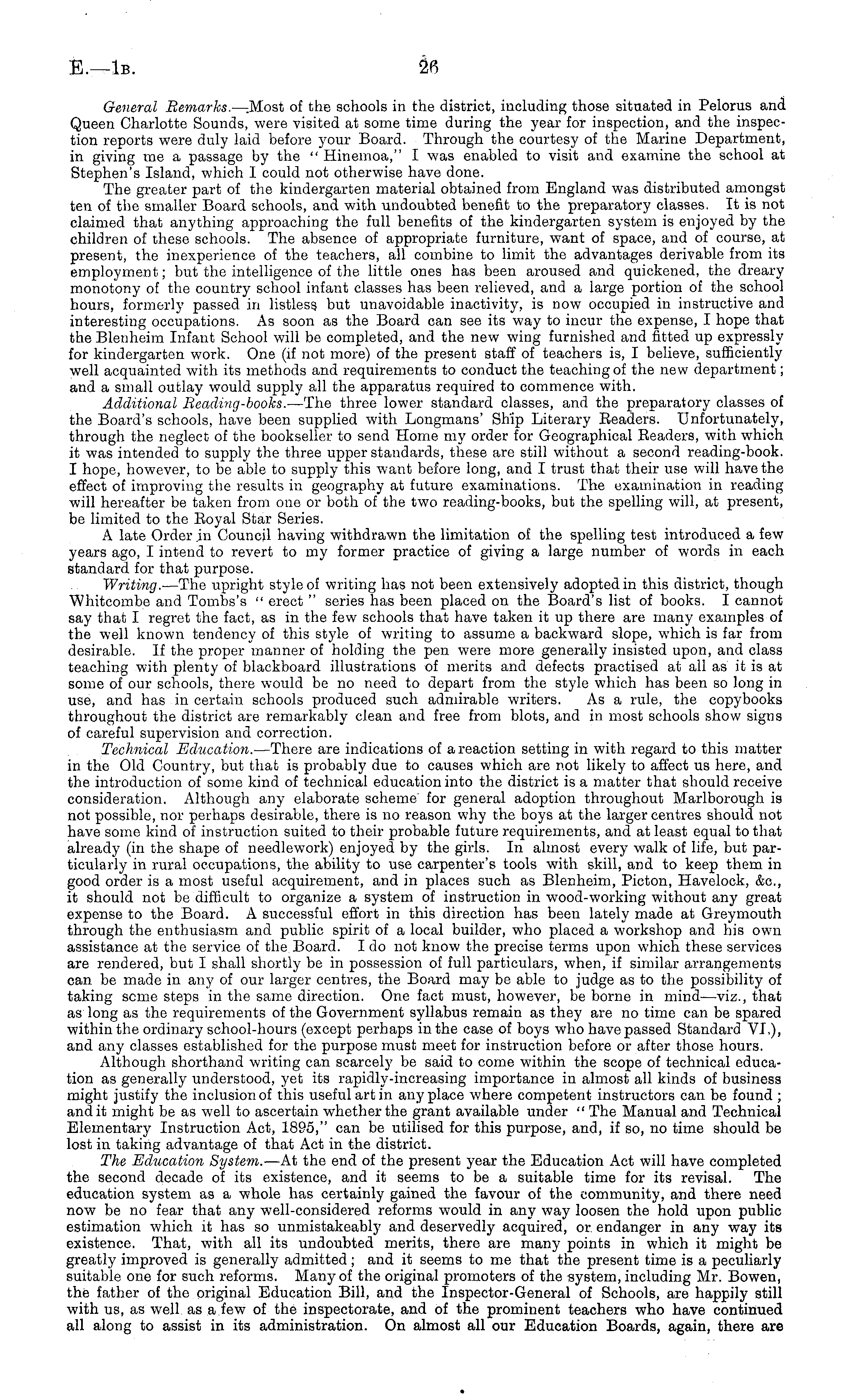 General Remarks. —-.Most of the schools in the district, including those situated in Pelorus and Queen Charlotte Sounds, were visited at some time during the year for inspection, and the inspection reports were duly laid before your Board. Through the courtesy of the Marine Department, in giving me a passage by the " Hinemoa," I was enabled to visit and examine the school at Stephen's Island, which I could not otherwise have done. The greater part of the kindergarten material obtained from England was distributed amongst ten of the smaller Board schools, and with undoubted benefit to the preparatory classes. It is not claimed that anything approaching the full benefits of the kindergarten system is enjoyed by the children of these schools. The absence of appropriate furniture, want of space, and of course, at present, the inexperience of the teachers, all combine to limit the advantages derivable from its employment; but the intelligence of the little ones has been aroused and quickened, the dreary monotony of the country school infant classes has been relieved, and a large portion of the school hours, formerly passed in listless but unavoidable inactivity, is now occupied in instructive and interesting occupations. As soon as the Board can see its way to incur the expense, I hope that the Blenheim Infant School will be completed, and the new wing furnished and fitted up expressly for kindergarten work. One (if not more) of the present staff of teachers is, I believe, sufficiently well acquainted with its methods and requirements to conduct the teaching of the new department; and a small outlay would supply all the apparatus required to commence with. Additional Reading-books. —The three lower standard classes, and the preparatory classes of the Board's schools, have been supplied with Longmans' Ship Literary Eeaders. Unfortunately, through the neglect of the bookseller to send Home my order for Geographical Eeaders, with which it was intended to supply the three upper standards, these are still without a second reading-book. I hope, however, to be able to supply this want before long, and I trust that their use will have the effect of improving the results in geography at future examinations. The examination in reading will hereafter be taken from one or both of the two reading-books, but the spelling will, at present, be limited to the Soyal Star Series. A late Order in Council having withdrawn the limitation of the spelling test introduced a few years ago, I intend to revert to my former practice of giving a large number of words in each standard for that purpose. Writing. —The upright style of writing has not been extensively adopted in this district, though Whitcombe and Tombs's " erect " series has been placed on the Board's list of books. I cannot say that I regret the fact, as in the few schools that have taken it up there are many examples of the well known tendency of this style of writing to assume a backward slope, which is far from desirable. If the proper manner of holding the pen were more generally insisted upon, and class teaching with plenty of blackboard illustrations of merits and defects practised at all as it is at some of our schools, there would be no need to depart from the style which has been so long in use, and has in certain schools produced such admirable writers. As a rule, the copybooks throughout the district are remarkably clean and free from blots, and in most schools show signs of careful supervision and correction. Technical Education. —There are indications of a reaction setting in with regard to this matter in the Old Country, but that is probably due to causes which are not likely to affect us here, and the introduction of some kind of technical education into the district is a matter that should receive consideration. Although any elaborate scheme for general adoption throughout Marlborough is not possible, nor perhaps desirable, there is no reason why the boys at the larger centres should not have some kind of instruction suited to their probable future requirements, and at least equal to that already (in the shape of needlework) enjoyed by the girls. In almost every walk of life, but particularly in rural occupations, the ability to use carpenter's tools with skill, and to keep them in good order is a most useful acquirement, and in places such as Blenheim, Picton, Havelock, &c, it should not be difficult to organize a system of instruction in wood-working without any great expense to the Board. A successful effort in this direction has been lately made at Greymouth through the enthusiasm and public spirit of a local builder, who placed a workshop and his own assistance at the service of the Board. Ido not know the precise terms upon which these services are rendered, but I shall shortly be in possession of full particulars, when, if similar arrangements can be made in any of our larger centres, the Board may be able to judge as to the possibility of taking seme steps in the same direction. One fact must, however, be borne in mind—viz., that as long as the requirements of the Government syllabus remain as they are no time can be spared within the ordinary school-hours (except perhaps in the case of boys who have passed Standard VI.), and any classes established for the purpose must meet for instruction before or after those hours. Although shorthand writing can scarcely be said to come within the scope of technical education as generally understood, yet its rapidly-increasing importance in almost all kinds of business might justify the inclusion of this useful art in any place where competent instructors can be found ; and it might be as well to ascertain whether the grant available under " The Manual and Technical Elementary Instruction Act, 1895," can be utilised for this purpose, and, if so, no time should be lost in taking advantage of that Act in the district. The Education System. —At the end of the present year the Education A