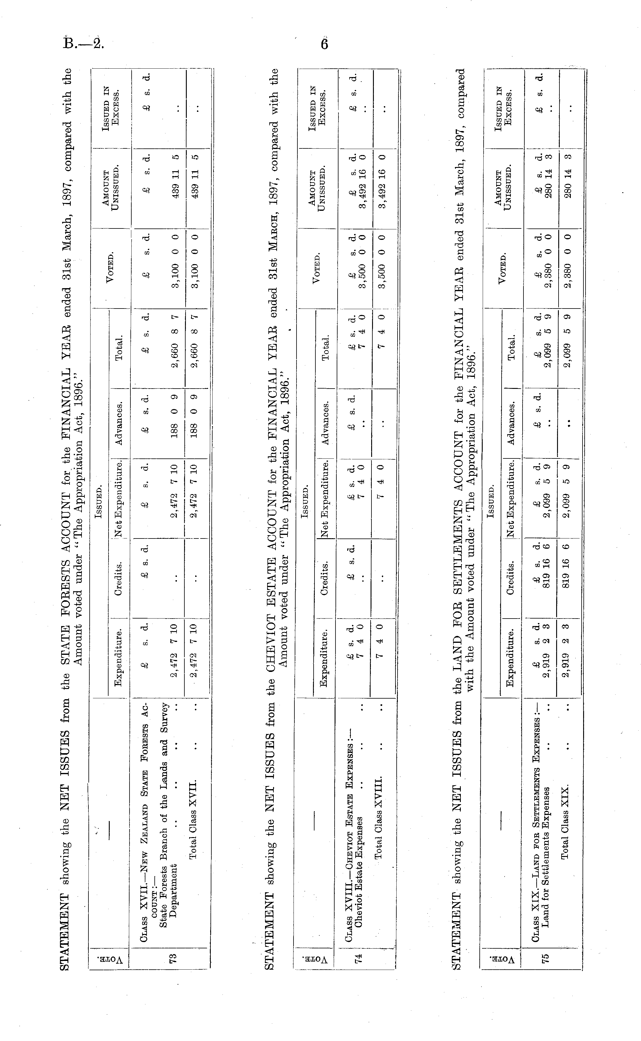 STATEMENT showing the NET ISSUES from the LAND FOR SETTLEMENTS ACCOUNT for the FINANCIAL YEAR ended 31st March, 1897, compared with the Amount voted under "The Appropriation Act, 1896."