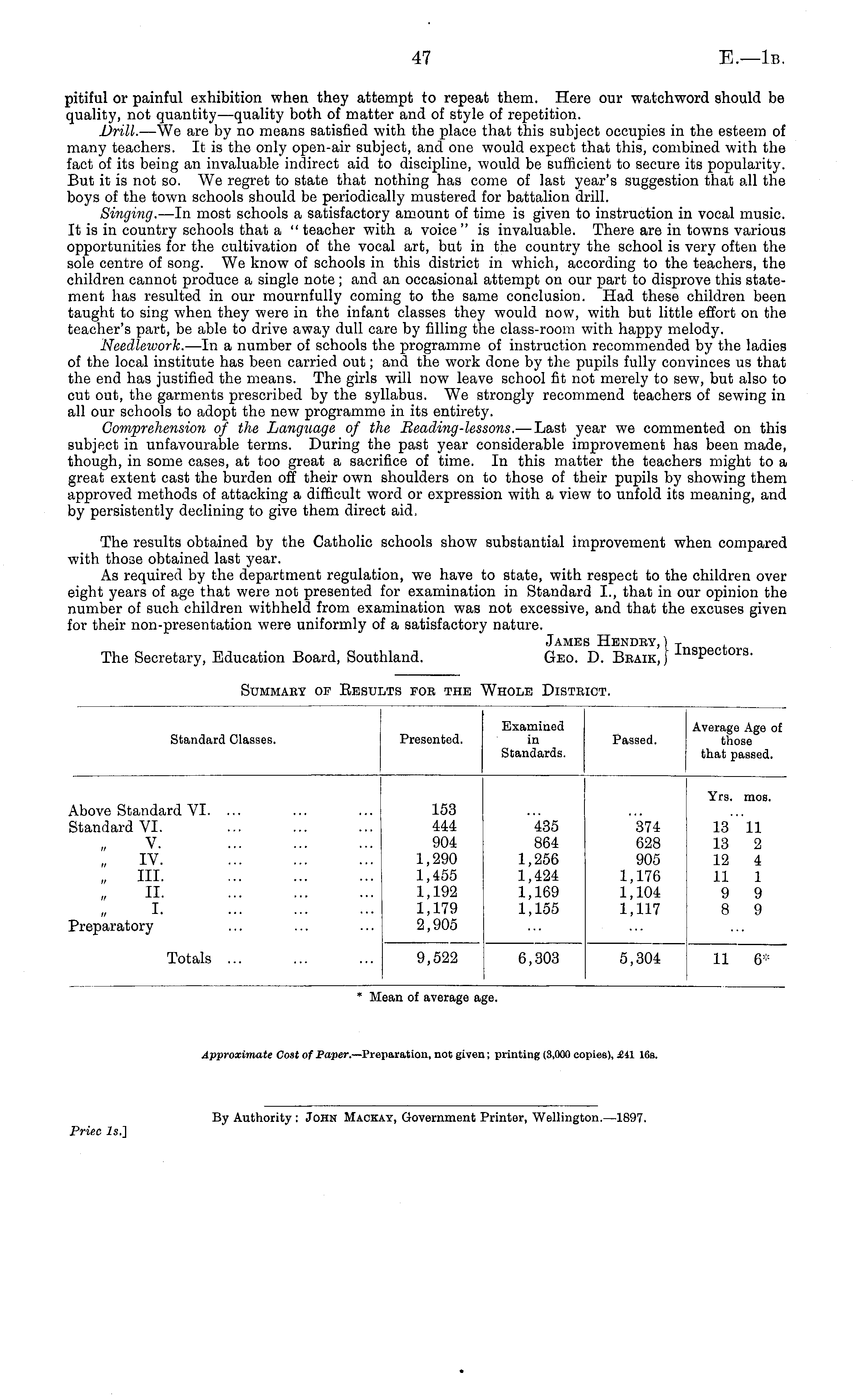 pitiful or painful exhibition when they attempt to repeat them. Here our watchword should be quality, not quantity —quality both of matter and of style of repetition. Drill. —We are by no means satisfied with the place that this subject occupies in the esteem of many teachers. It is the only open-air subject, and one would expect that this, combined with the fact of its being an invaluable indirect aid to discipline, would be sufficient to secure its popularity. But it is not so. We regret to state that nothing has come of last year's suggestion that all the boys of the town schools should be periodically mustered for battalion drill. Singing. —ln most schools a satisfactory amount of time is given to instruction in vocal music. It is in country schools that a " teacher with a voice " is invaluable. There are in towns various opportunities for the cultivation of the vocal art, but in the country the school is very often the sole centre of song. We know of schools in this district in which, according to the teachers, the children cannot produce a single note; and an occasional attempt on our part to disprove this statement has resulted in our mournfully coming to the same conclusion. Had these children been taught to sing when they were in the infant classes they would now, with but little effort on the teacher's part, be able to drive away dull care by filling the class-room with happy melody. Needlework. —ln a number of schools the programme of instruction recommended by the ladies of the local institute has been carried out; and the work done by the pupils fully convinces us that the end has justified the means. The girls will now leave school fit not merely to sew, but also to cut out, the garments prescribed by the syllabus. We strongly recommend teachers of sewing in all our schools to adopt the new programme in its entirety. Comprehension of the Language of the Beading-lessons. — Last year we commented on this subject in unfavourable terms. During the past year considerable improvement has been made, though, in some cases, at too great a sacrifice of time. In this matter the teachers might to a great extent cast the burden off their own shoulders on to those of their pupils by showing them approved methods of attacking a difficult word or expression with a view to unfold its meaning, and by persistently declining to give them direct aid. The results obtained by the Catholic schools show substantial improvement when compared with those obtained last year. As required by the department regulation, we have to state, with respect to the children over eight years of age that were not presented for examination in Standard 1., that in our opinion the number of such children withheld from examination was not excessive, and that the excuses given for their non-presentation were uniformly of a satisfactory nature. James Hendry, ) T . The Secretary, Education Board, Southland. Geo. D. Braik, ) lns P ectors -