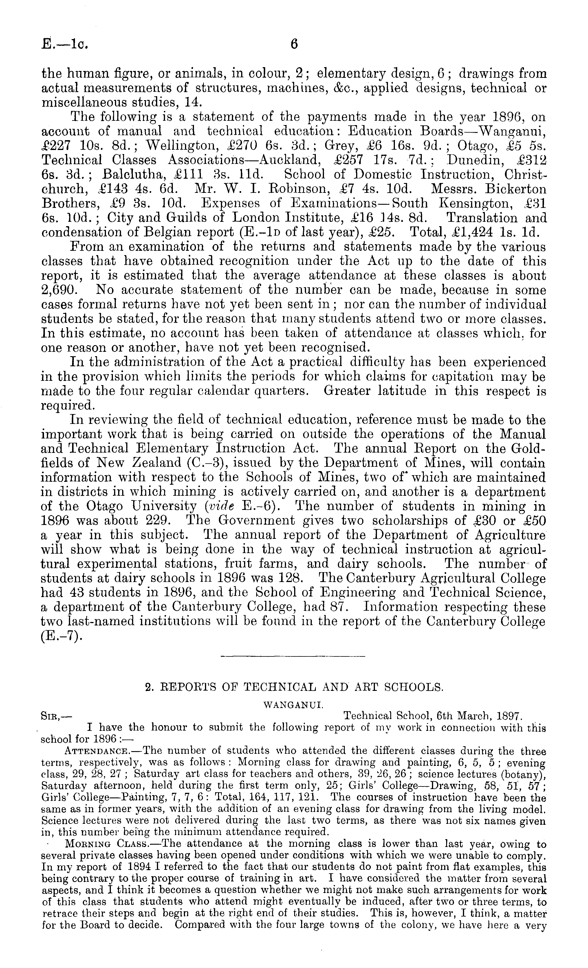 the human figure, or animals, in colour, 2; elementary design, 6 ; drawings from actual measurements of structures, machines, &c, applied designs, technical or miscellaneous studies, 14. The following is a statement of the payments made in the year 1896, on account of manual and technical education: Education Boards—Wanganui, £227 10s. Bd.; Wellington, £270 6s. 3d.; Grey, £6 16s. 9d. ; Otago, £5 ss. Technical Classes Associations —Auckland, £257 17s. 7d. ; Dunedin, £312 6s. 3d. ; Balclutha, £111 3s. lid. School of Domestic Instruction, Christchurch, £143 4s. 6d. Mr. W. I. Kobinson, £7 4s. 10d. Messrs. Bickerton Brothers, £9 3s. 10d. Expenses of Examinations—South Kensington, £31 6s. 10d. ; City and Guilds of London Institute, £16 14s. Bd. Translation and condensation of Belgian report (E.-ln of last year), £25. Total, £1,424 Is. Id. From an examination of the returns and statements made by the various classes that have obtained recognition under the Act up to the date of this report, it is estimated that the average attendance at these classes is about 2,690. No accurate statement of the number can be made, because in some cases formal returns have not yet been sent in; nor can the number of individual students be stated, for the reason that many students attend two or more classes. In this estimate, no account has been taken of attendance at classes which, for one reason or another, have not yet been recognised. In the administration of the Act a practical difficulty has been experienced in the provision which limits the periods for which claims for capitation may be made to the four regular calendar quarters. Greater latitude in this respect is required. In reviewing the field of technical education, reference must be made to the important work that is being carried on outside the operations of the Manual and Technical Elementary Instruction Act. The annual Eeport on the Goldfields of New Zealand (C.-3), issued by the Department of Mines, will contain information with respect to the Schools of Mines, two of which are maintained in districts in which mining is actively carried on, and another is a department of the Otago University (vide E.-6). The number of students in mining in 1896 was about 229. The Government gives two scholarships of £30 or £50 a year in this subject. The annual report of the Department of Agriculture will show what is being done in the way of technical instruction at agricultural experimental stations, fruit farms, and dairy schools. The number of students at dairy schools in 1896 was 128. The Canterbury Agricultural College had 43 students in 1896, and the School of Engineering and Technical Science, a department of the Canterbury College, had 87. Information respecting these two last-named institutions will be found in the report of the Canterbury College (E.-7).