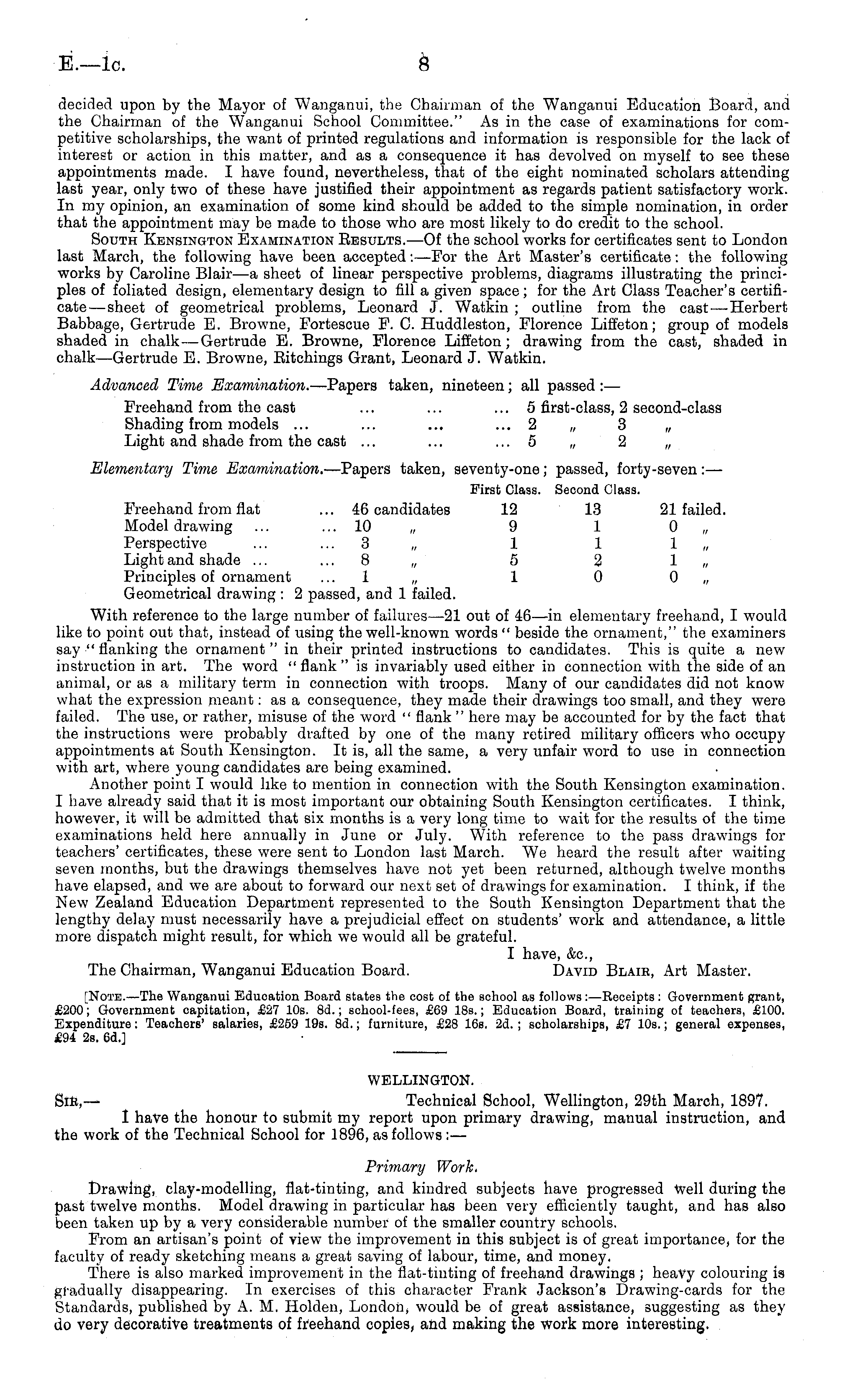 WELLINGTON. Sm,— Technical School, Wellington, 29th March, 1897. I have the honour to submit my report upon primary drawing, manual instruction, and the work of the Technical School for 1896, as follows: — Primary Work, Drawing, clay-modelling, flat-tinting, and kindred subjects have progressed Well during the past twelve months. Model drawing in particular has been very efficiently taught, and has also been taken up by a very considerable number of the smaller country schools. From an artisan's point of view the improvement in this subject is of great importance, for the faculty of ready sketching means a great saving of labour, time, and money. There is also marked improvement in the flat-tinting of freehand drawings ; heavy colouring is gradually disappearing. In exercises of this character Frank Jackson's Drawing-cards for the Standards, published by A. M. Holden, London, would be of great assistance, suggesting as they do very decorative treatments of freehand copies, and making the work more interesting.