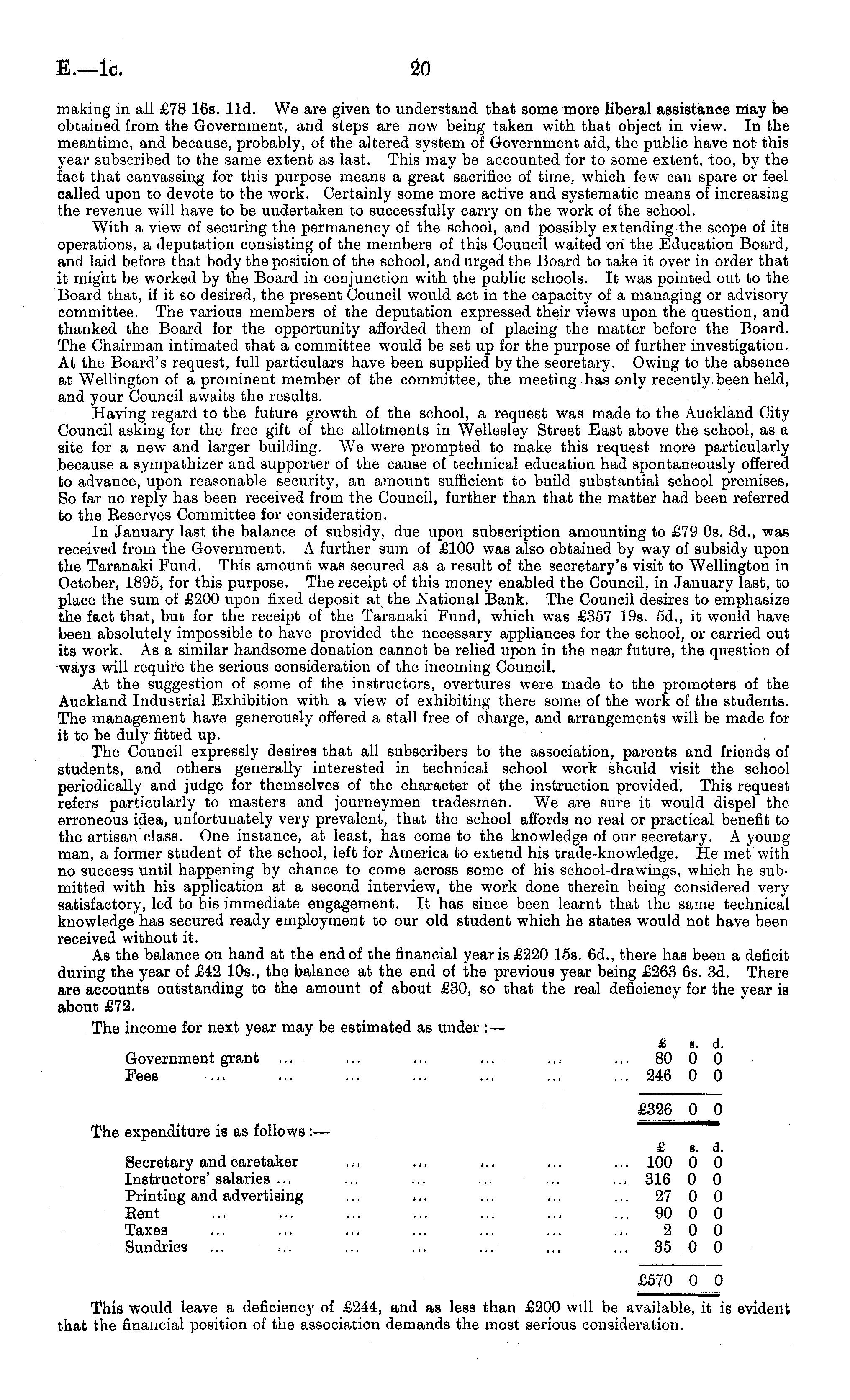 making in all £78 16s. lid. We are given to understand that some more liberal assistance may be obtained from the Government, and steps are now being taken with that object in view. In the meantime, and because, probably, of the altered system of Government aid, the public have not this year subscribed to the same extent as last. This may be accounted for to some extent, too, by the fact that canvassing for this purpose means a great sacrifice of time, which few can spare or feel called upon to devote to the work. Certainly some more active and systematic means of increasing the revenue will have to be undertaken to successfully carry on the work of the school. With a view of securing the permanency of the school, and possibly extending the scope of its operations, a deputation consisting of the members of this Council waited on the Education Board, and laid before that body the position of the school, and urged the Board to take it over in order that it might be worked by the Board in conjunction with the public schools. It was pointed out to the Board that, if it so desired, the present Council would act in the capacity of a managing or advisory committee. The various members of the deputation expressed their views upon the question, and thanked the Board for the opportunity afforded them of placing the matter before the Board. The Chairman intimated that a committee would be set up for the purpose of further investigation. At the Board's request, full particulars have been supplied by the secretary. Owing to the absence at Wellington of a prominent member of the committee, the meeting has only recently been held, and your Council awaits the results. Having regard to the future growth of the school, a request was made to the Auckland City Council asking for the free gift of the allotments in Wellesley Street Bast above the school, as a site for a new and larger building. We were prompted to make this request more particularly because a sympathizer and supporter of the cause of technical education had spontaneously offered to advance, upon reasonable security, an amount sufficient to build substantial school premises. So far no reply has been received from the Council, further than that the matter had been referred to the Reserves Committee for consideration. In January last the balance of subsidy, due upon subscription amounting to £79 Os. Bd., was received from the Government. A further sum of £100 was also obtained by way of subsidy upon the Taranaki Fund. This amount was secured as a result of the secretary's visit to Wellington in October, 1895, for this purpose. The receipt of this money enabled the Council, in January last, to place the sum of £200 upon fixed deposit at the National Bank. The Council desires to emphasize the fact that, but for the receipt of the Taranaki Fund, which was £357 19s. 5d., it would have been absolutely impossible to have provided the necessary appliances for the school, or carried out its work. As a similar handsome donation cannot be relied upon in the near future, the question of ways will require the serious consideration of the incoming Council. At the suggestion of some of the instructors, overtures were made to the promoters of the Auckland Industrial Exhibition with a view of exhibiting there some of the work of the students. The management have generously offered a stall free of charge, and arrangements will be made for it to be duly fitted up. The Council expressly desires that all subscribers to the association, parents and friends of students, and others generally interested in technical school work should visit the school periodically and judge for themselves of the character of the instruction provided. This request refers particularly to masters and journeymen tradesmen. We are sure it would dispel the erroneous idea, unfortunately very prevalent, that the school affords no real or practical benefit to the artisan class. One instance, at least, has come to the knowledge of our secretary. A young man, a former student of the school, left for America to extend his trade-knowledge. He met with no success until happening by chance to come across some of his school-drawings, which he submitted with his application at a second interview, the work done therein being considered very satisfactory, led to his immediate engagement. It has since been learnt that the same technical knowledge has secured ready employment to our old student which he states would not have been received without it. As the balance on hand at the end of the financial year is £220 15s. 6d., there has been a deficit during the year of £42 10s., the balance at the end of the previous year being £263 6s. 3d. There are accounts outstanding to the amount of about £30, so that the real deficiency for the year is about £72. The income for next year may be estimated as under : — £ s. d. Government grant ... ... ... ... ~, ... 80 0 0 Fees ... ... ... ... ... ... ... 246 0 0 £326 0 0 The expenditure is as follows : — £ s. d. Secretary and caretaker .-.. ... ~. ... ... 100 0 0 Instructors' salaries ... ... ... .. ... ~. 316 0 0 Printing and advertising ... ~, ... ~. ... 27 0 0 Eent ... ... ... ... ... ... ... 90 0 0 Taxes ... ... ... ... ... ... ... 2 0 0 Sundries ... ... ... ... ... ... ... 35 0 0 £570 0 0 This would leave a deficiency of £244, and as less than £200 will be available, it is evident that the financial position of the association demands the most serious consideration.