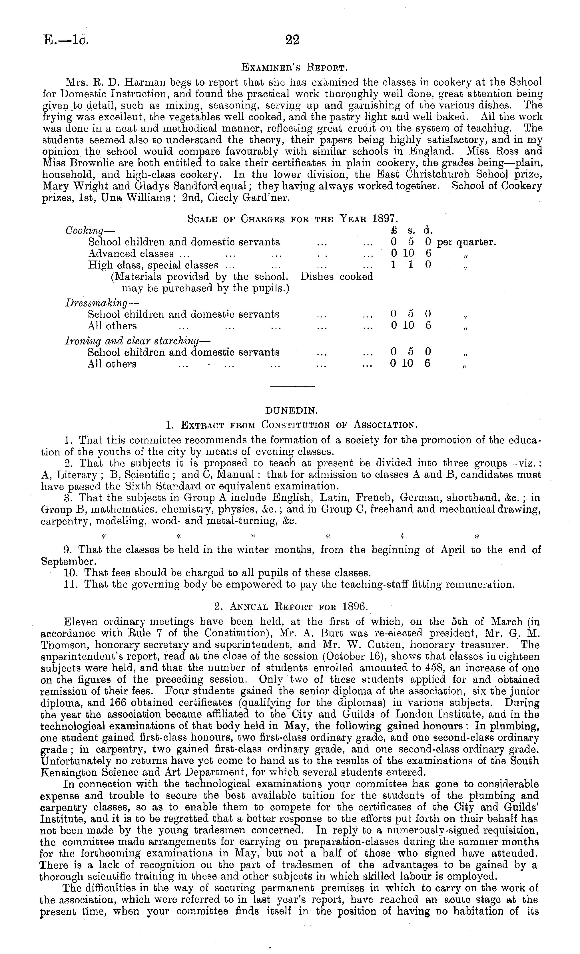 DUNEDLN. 1. BXTEACT FKOM CONSTITUTION OF ASSOCIATION. 1. That this committee recommends the formation of a society for the promotion of the education of the youths of the city by means of evening classes. 2. That the subjects it is proposed to teach at present be divided into three groups—-viz. : A, Literary ; B, Scientific ; and C, Manual : that for admission to classes A and B, candidates must have passed the Sixth Standard or equivalent examination. 3. That the subjects in Group A include English, Latin, French, German, shorthand, &c. ; in Group B, mathematics, chemistry, physics, &c.; and in Group C, freehand and mechanical drawing, carpentry, modelling, wood- and metal-turning, &c. 9. That the classes be held in the winter months, from the beginning of April to the end of September. 10. That fees should be charged to all pupils of these classes. 11. That the governing body be empowered to pay the teaching-staff fitting remuneration. 2. Annual Eepoet fok 1896. Eleven ordinary meetings have been held, at the first of which, on the sth of March (in accordance with Rule 7 of the Constitution), Mr. A. Burt was re-elected president, Mr. G. M. Thomson, honorary secretary and superintendent, and Mr. W. Cutten, honorary treasurer. The superintendent's report, read at the close of the session (October 16), shows that classes in eighteen subjects were held, and that the number of students enrolled amounted to 458, an increase of one on the figures of the preceding session. Only two of these students applied for and obtained remission of their fees. Pour students gained the senior diploma of the association, six the junior diploma, and 166 obtained certificates (qualifying for the diplomas) in various subjects. During the year the association became affiliated to the City and Guilds of London Institute, and in the technological examinations of that body held in May, the following gained honours : In plumbing, one student gained first-class honours, two first-class ordinary grade, and one second-class ordinary grade ; in carpentry, two gained first-class ordinary grade, and one second-class ordinary grade. Unfortunately no returns have yet come to hand as to the results of the examinations of the South Kensington Science and Art Department, for which several students entered. In connection with the technological examinations your committee has gone to considerable expense and trouble to secure the best available tuition for the students of the plumbing and carpentry classes, so as to enable them to compete for the certificates of the City and Guilds' Institute, and it is to be regretted that a better response to the efforts put forth on their behalf has not been made by the young tradesmen concerned. In reply to a numerously signed requisition, the committee made arrangements for carrying on preparation-classes during the summer months for the forthcoming examinations in May, but not a half of those who signed have attended. There is a lack of recognition on the part of tradesmen of the advantages to be gained by a thorough scientific training in these and other subjects in which skilled labour is employed. The difficulties in the way of securing permanent premises in which to carry on the work of the association, which were referred to in last year's report, have reached an acute stage at the present time, when your committee finds itself in the position of having no habitation of its