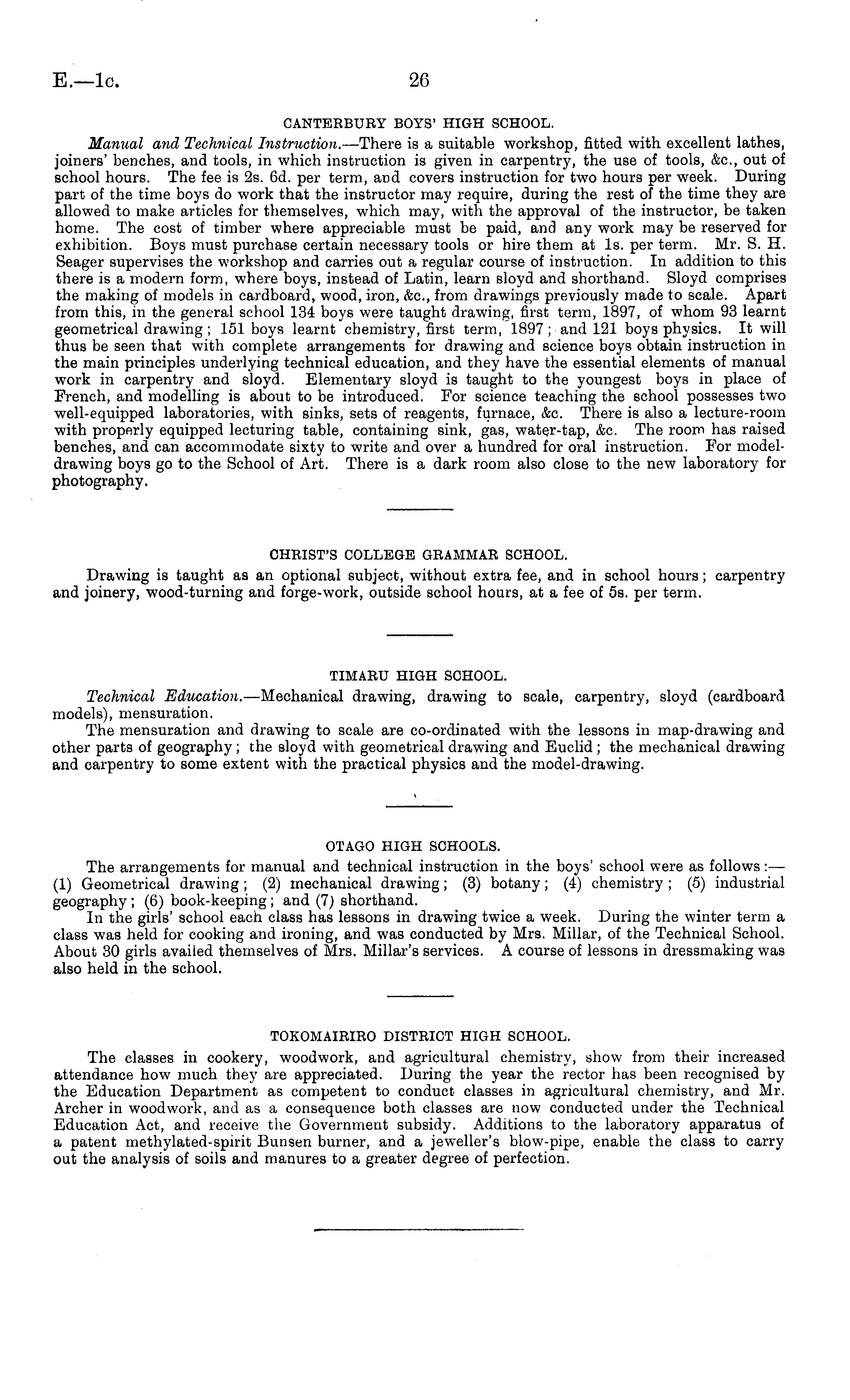 CANTERBURY BOYS' HIGH SCHOOL. Manual and Technical Instruction. —There is a suitable workshop, fitted with excellent lathes, joiners' benches, and tools, in which instruction is given in carpentry, the use of tools, &c, out of school hours. The fee is 2s. 6d. per term, and covers instruction for two hours per week. During part of the time boys do work that the instructor may require, during the rest of the time they are allowed to make articles for themselves, which may, with the approval of the instructor, be taken home. The cost of timber where appreciable must be paid, and any work may be reserved for exhibition. Boys must purchase certain necessary tools or hire them at Is. per term. Mr. S. H. Seager supervises the workshop and carries out a regular course of instruction. In addition to this there is a modern form, where boys, instead of Latin, learn sloyd and shorthand. Sloyd comprises the making of models in cardboard, wood, iron, &c, from drawings previously made to scale. Apart from this, in the general school 134 boys were taught drawing, first term, 1897, of whom 93 learnt geometrical drawing ; 151 boys learnt chemistry, first term, 1897 ; and 121 boys physics. It will thus be seen that with complete arrangements for drawing and science boys obtain instruction in the main principles underlying technical education, and they have the essential elements of manual work in carpentry and sloyd. Elementary sloyd is taught to the youngest boys in place of French, and modelling is about to be introduced. For science teaching the school possesses two well-equipped laboratories, with sinks, sets of reagents, furnace, &c. There is also a lecture-room with properly equipped lecturing table, containing sink, gas, wate.r-tap, &c. The room has raised benches, and can accommodate sixty to write and over a hundred for oral instruction. For modeldrawing boys go to the School of Art. There is a dark room also close to the new laboratory for photography.