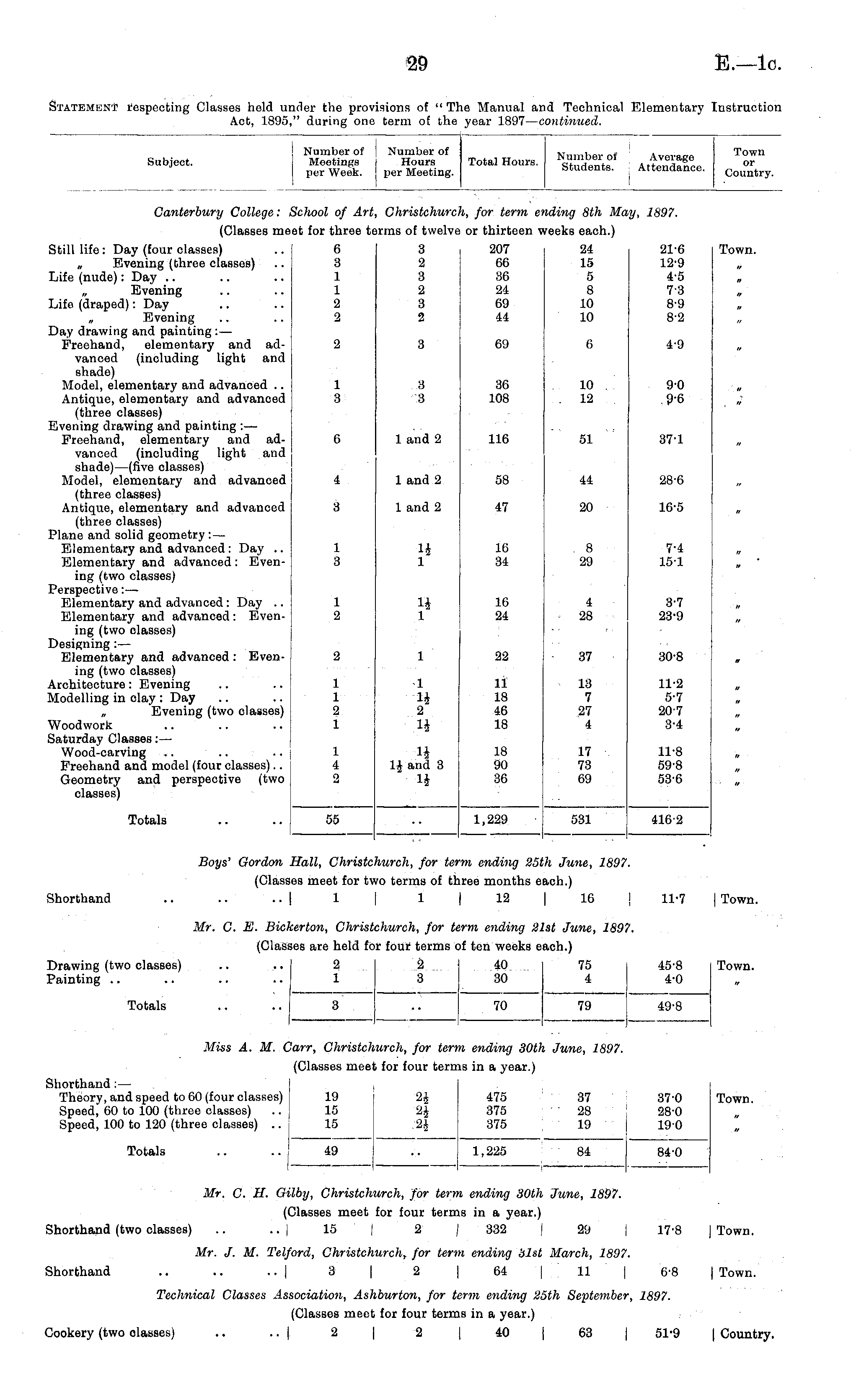 Subject. Meetings Hour, Total Hours. Attendance « per Week. per Meeting. Btudente. Attendance. Countl . y . ; Number of Meetings per Week. Number of Hours per Meeting. n™,« Number of Total Houlb. students. Average T °™ Attendance. Countl . y . £- v _ VI ~" —- — - L i — _ _ — — f~ 1 - V< » ■ J Canterbury College: School of Art, Christchurch, for term ending 8th May, 1897. (Classes meet for three terras of twelve or thirteen weeks each.) Still life: Day (four classes) .. | 6 3 207 24 21-6 Town. Evening (three classes) .. j 3 2 66 15 12-9 Life (nude): Day ...... j 1 3 36 5 4-5 Evening .... 1 2 24 8 73,, Life (draped): Day .... 2 3 69 10 8-9 Evening .... 2 2 44 10 8-2 Day drawing and painting:— Freehand, elementary and ad- j 2 3 69 6 4'9 „ vanced (including light and shade) Model, elementary and advanced .. 1 3 36 10 9-0 Antique, elementary and advanced 13 3 108 12 9'6 „ (three classes) Evening drawing and painting :— Freehand, elementary and ad- i 6 1 and 2 116 51 37'1 „ vanced (including light and j shade) —(five classes) Model, elementary and advanced 4 1 and 2 58 44 28'6 „ (three classes) Antique, elementary and advanced i 3 1 and 2 47 20 16'5 (three classes) Plane and solid geometry :— Elementary and advanced: Day .. ' 1 1| 16 8 7-4 Elementary and advanced: Even- : 3 1 34 29 15-1 ing (two classes) Perspective:— Elementary and advanced: Day .. 1 1J 16 4 3'7 „ Elementary and advanced: Even- 2 1 24 28 23'9 „ ing (two classes) Designing :— Elementary and advanced: Even- 2 1 22 37 30-8 ing (two classes) Architecture: Evening .. .. I 1 1 11 13 11-2 Modelling in clay: Day .... \ 1 1J 18 7 5-7 Evening (two classes) 2 2 46 27 207 Woodwork ...... j 1 1} 18 4 3-4 Saturday Classes: — Wood-carving .. .. .. ; 1 li 18 17 11-8 Freehand and model (four classes)... 4 1J and 3 90 73 59'8 Geometry and perspective (two 2 1J 36 69 53'6 „ classes) School of Art et for three tt 6 3 1 1 2 2 2 1 3 6 4 3 , Christchurci jrras of twelve 3 2 3 2 3 2 3 3 3 1 and 2 1 and 2 1 and 2 h, for term e . i or thirteen \ 207 66 36 24 69 44 69 36 108 116 58 47 riding 8th Mα veeks each.) 24 15 5 8 10 10 6 10 12 51 44 20 iy, 1897. 21-6 12-9 4-5 73 8-9 8-2 4-9 90 9-6 37-1 28-6 16-5 Town. II 1 3 1* 16 34 8 29 7-4 15-1 1 2 1 16 24 4 ■ 28 3-7 23-9 2 1 22 37 30-8 H 1 1 2 1 1 14 2 1* 11 18 46 18 13 7 27 4 11-2 5-7 207 3-4 1 4 2 li li and 3 li 18 90 36 17 73 69 11-8 59-8 53-6 55 1,229 531 4162 Totals .. .. 55 .. 1,229 531 4162 Boys' Gordon Hall, Christchurch, for term ending 25th June, 1897. (Classes meet for two terms of three months each.) Shorthand .. .. .. | 1 | 1 | 12 | 16 \ 11-7 | Town. Mr. C. E. Bickerton, Christchurch, for term ending 21st June, 1897. (Classes are held for four terms of ten weeks each.) Drawing (two classes) .... 2 2 40 75 I 45-8 Town. Painting ........ 1 3 30 4 4-0 Totals .... 3 .. 70 79 49-8 Miss A. M. Carr, Christchurch, for term ending 30th June, 1897. lurch, for ten I for four tern (Classes meet for four terms in a year.) Shorthand :— Theory, and speed to 60 (four classes) [ 19 2£ 475 37 37-0 Town. Speed, 60 to 100 (three classes) .. 15 2J 375 28 28'0 Speed, 100 to 120 (three classes) .. 15 .2i 375 19 19-0 Totals .. .. 49 .. 1,225 84 84-0 2* Mr. C. H. Gilby, Christchurch, for term ending 30th June, 1897. (Classes meet for four terms in a year.) Shorthand (two classes) .. ..I 15 2 / 332 29 | 17-8 | Town. Mr. J. M. Telford, Christchurch, for term ending Hist March, 1897. Shorthand .. .. .. | 3 | 2 | 64 | XI | 6-8 | Town. Techyiical Classes Association, Ashburton, for term ending 25th September, 1897. (Classes meet for four terms in a year.) Cookery (two olasses) .. .. | 2 | 2 | 40 | 63 | 51-9 | Country.