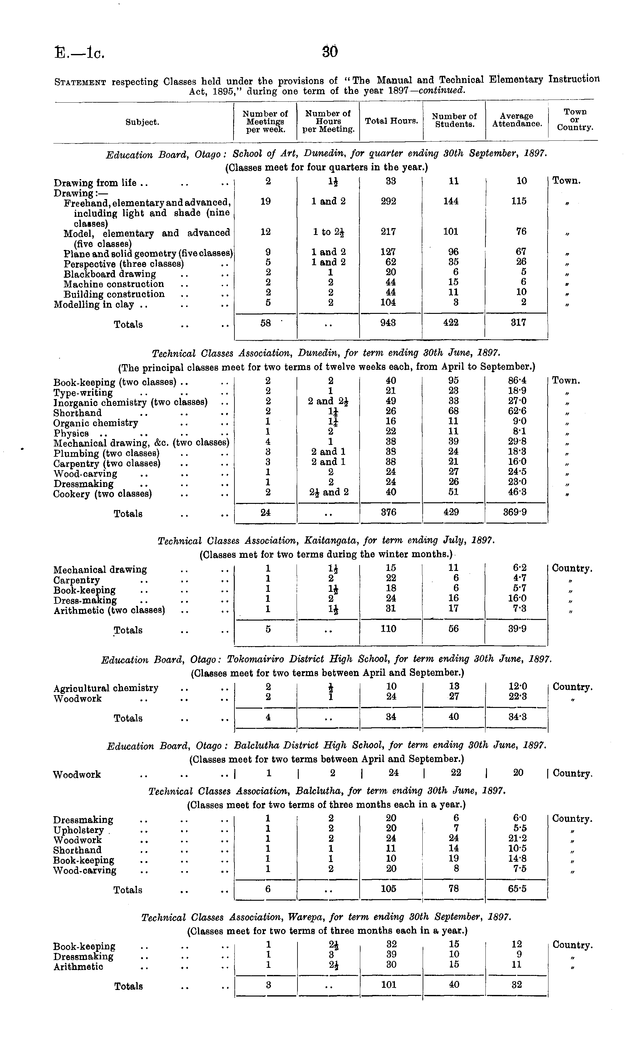 Subject. Number of Meetings per week. Number of Hours per Meeting. Total Hours. Number of Students. Average Attendance. Town or Country. Education Board, Otago: School of Art, Dunedin, fo (Classes meet for four quarte School of Art, 'lasses meet ft Dunedin, fo ir four quarte: 14 r quarter eni :s in the yeai ling 30th Se\ ■■) Member, 1897. 10 Drawing from life .. .. .. 2 11 Drawing:— Freehand, elementary and advanced, 19 1 and 2 including light and shade (nine classes) Model, elementary and advanced 12 1 to 2J (five classes) Plane and solid geometry (five classes) 9 1 and 2 Perspective (three classes) .. 5 1 and 2 Blackboard drawing .. .. 2 1 Machine construction .. .. 2 2 Building construction .. .. 2 2 Modelling in clay .. .. .. 5 2 2 33 11 Town. 19 1 and 2 292 144 115 12 1 to2J 217 101 76 9 5 2 2 2 5 1 and 2 1 and 2 1 2 2 2 127 62 20 44 44 104 96 35 6 15 11 3 67 26 5 6 10 2 Totals .. .. 58 ' 58 • 943 422 317 Technical Classes Association, Dunedin, for (The principal classes meet for two terms of twelve ' Book-keeping (two classes) .. .. 2 2 Type-writing .. .. . • 2 1 Inorganic chemistry (two classes) .. 2 2 and 21 Shorthand .. .. .. 2 1J Organic chemistry .... lj Physics .. .. .. • • 1 2 Mechanical drawing, &c. (two classes) 4 1 Plumbing (two classes) .. .. 3 2 and 1 Carpentry (two classes) .. .. 3 2 and 1 Wood-carving .. .. .. 1 2 Dressmaking .. .. .. 1 2 Cookery (two classes) .. .. 2 21 and 2 Association, :et for two ter Dunedin, for •ms of twelve ' term ending weeks each, fi 30th June, 11 torn April to S 95 23 33 68 11 11 39 24 21 27 26 51 S97. leptember.) 2 2 2 2 1 1 4 3 3 1 1 2 2 1 2 and 2% 11 l| 2 1 2 and 1 2 and 1 2 2 21 and 2 40 21 49 26 16 22 38 38 38 24 24 40 86-4 18-9 270 626 9-0 8-1 29-8 18-3 160 24-5 23-0 463 Town. Totals .. .. 24 24 376 429 3699 Technical Classes Association, Kaitangata, is Association, Kaitangata, for term end the winter mi ling July, 18! snths.) I n 6 6 16 17 7. (Classes met for two terms during i met for two ;erms during 6-2 4-7 5-7 16-0 7-3 Mechanical drawing .... 11 Carpentry .. .. . • 2 Book-keeping .. .. • ■ 1 1J Dress-making .. .. • • 1 2 Arithmetic (two classes) .. .. 1 1J li 2 2* li 15 22 18 24 31 Country. Totals .. .. 5 110 66 39-9 Education Board, Otago: Tokomairiro District High t Hstrict High •School, for te'i rm ending 30, ptember.) 13 27 >th June, 1897. (Classes meet for two terms between ;erms betwee: April and Se] 12-0 i 22-3 Country. Agricultural chemistry .. .. 2 1 Woodwork .. .. .. 2 1 Totals .. .. 4 I 1 10 24 34 40 34-3 Education Board, Otago : Balclutha District High Si (Classes meet for two terms between :hool, for term ending 30th June, 1897. April and September.) | 24 | 22 | 20 | | Country. Woodwork .. .. .. | 1 | 2 Technical Classes Association, Balclutha, fof (Classes meet for two terms of throe r term ending 30th June, 1897. lonths each in a year.) Dressmaking .. .. .. 1 2 Upholstery .. .. .. 1 2 Woodwork .. .. .. 1 2 Shorthand .. .. .. 1 1 Book-keeping .. .. .. 1 1 Wood-carving .. .. .. 1 2 20 6 60 20 7 5-5 24 24 21-2 11 14 105 10 19 14-8 20 8 7-5 Country. Totals .. .. 6 105 78 65-5 Technical Classes Association, Warepa, for ter r arepa, for term ending 30th September, 1897. jrms of three months eaoh in a year.) (Classes meet for two terms of three l Book-keeping .. .. • • 1 2J Dressmaking .. .. • • 3 Arithmetic .. .. • • 1 2 1 Totals .. .. 3 2J 32 15 12 | 3 39 10 9 2J 30 15 11 101 40 32 Country.