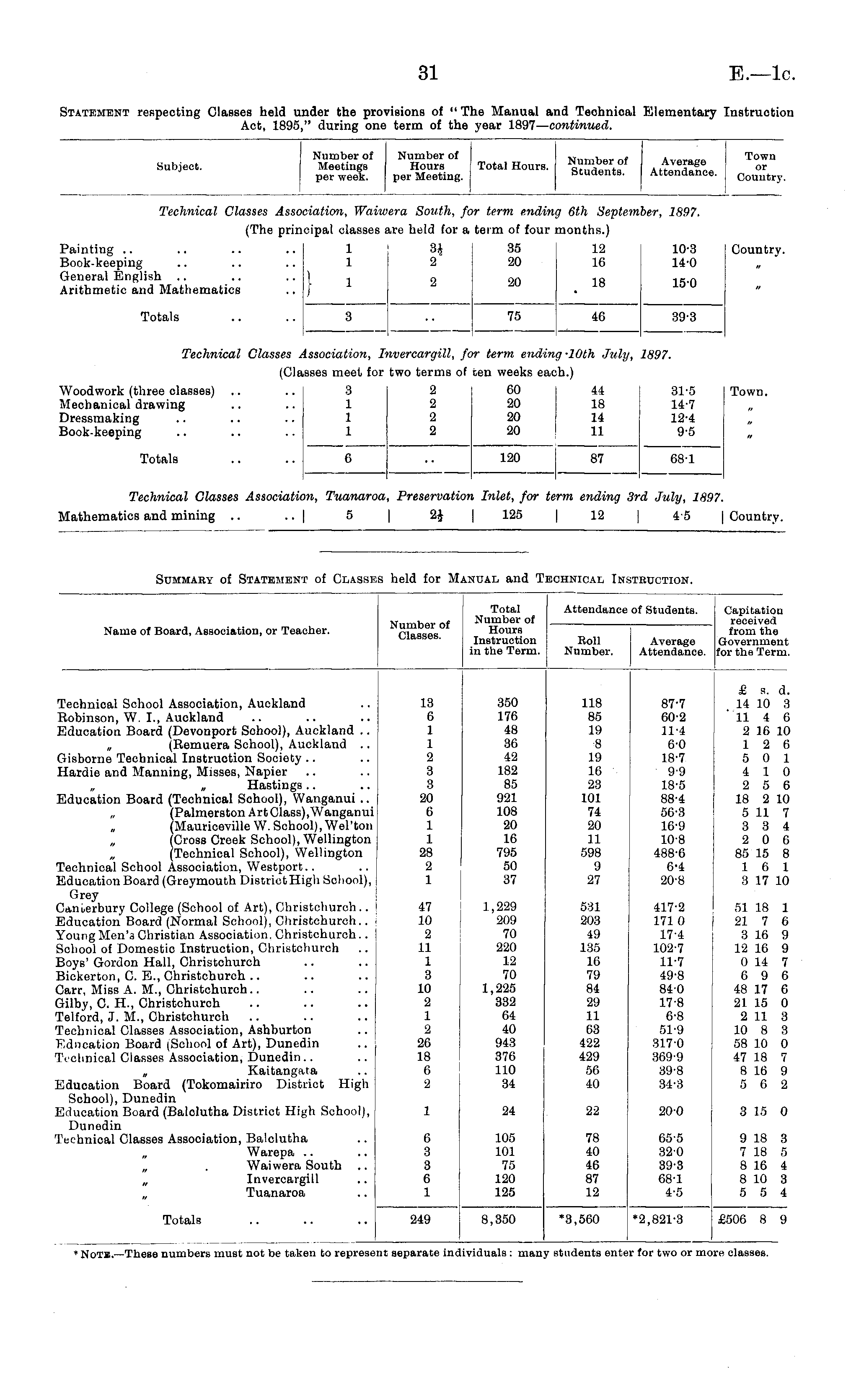 Subject. Number of Number of Meetings Hours Total Hours, per week. per Meeting. Number of Students. Average To ™ Attendance. Couutrj , Technical Classes Assoi ciation, Waiw 'era South, fo ir term ending <7 6th September, 1897. months.) 12 10-3 Country. 16 14-0 18 150 46 39-3 (The prin cipal classes t are held for a term of four ] Painting Book-keeping General English Arithmetic and Mathematics 1 ] 1 2 35 20 3 2 20 Totals 75 Technical Classes A issociation, h ,sses meet for nvercargill, fo two terms of w term endim g-10th July, 1897. (Gla ten weeks eac lh.) Woodwork (three classes) Mechanical drawing Dressmaking Book-keeping 8 1 1 1 2 2 2 2 60 20 20 20 44 31-5 Town. 18 14-7 14 12-4 11 9-5 Totals 120 S7 68-1 Technical Classes Associatio on, Tuanaroa, , Preservation Inlet, for U 125 >,rm ending 3rd July, 1897. I 12 I 45 I Country. Mathematics and mining .. .. | I 5 I 2J