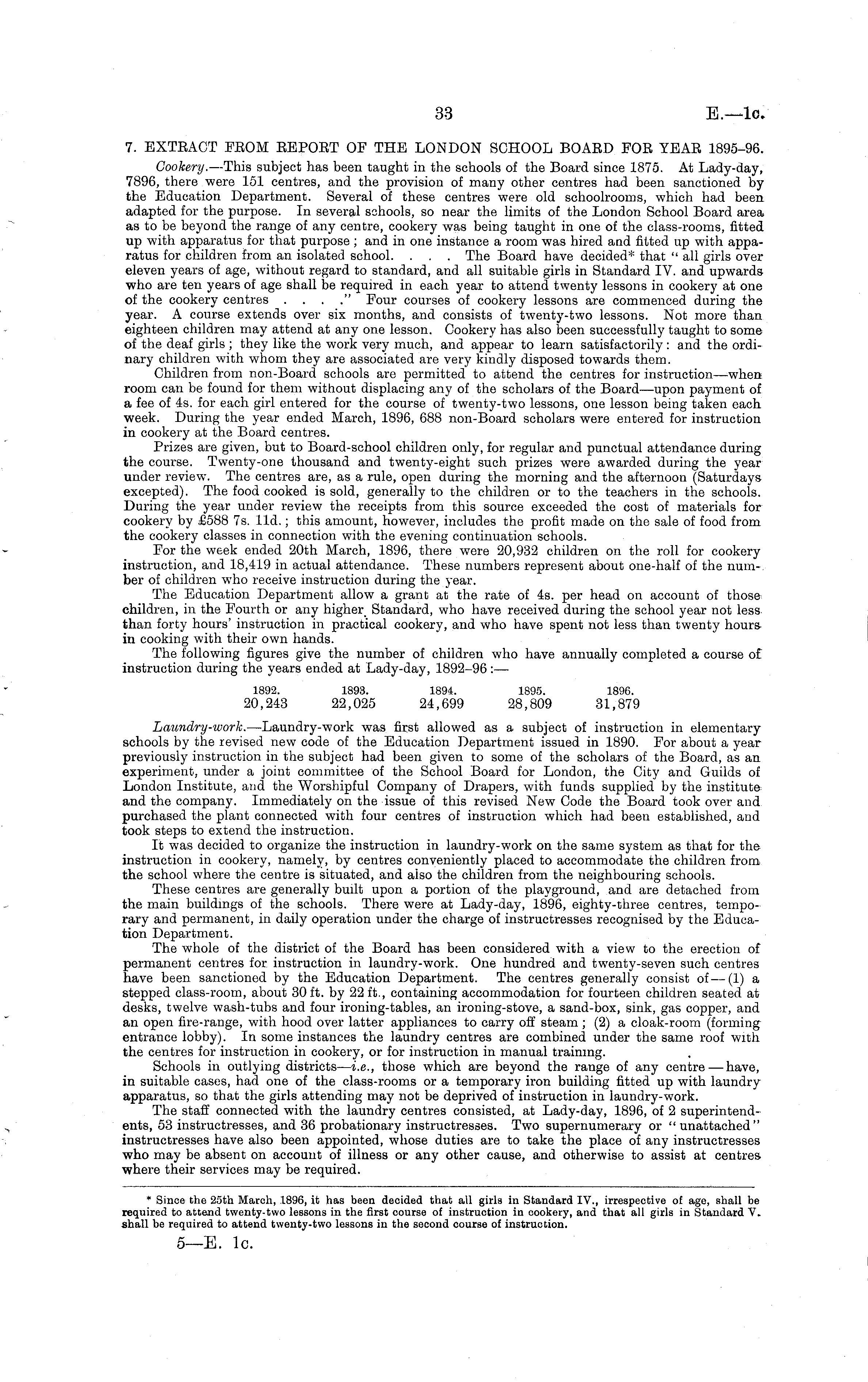 7. EXTEACT FBOM EEPOET OF THE LONDON SCHOOL BOAED FOE YEAE 1895-96. Cookery. —This subject has been taught in the schools of the Board since 1875. At Lady-day, 7896, there were 151 centres, and the provision of many other centres had been sanctioned by the Education Department. Several of these centres were old schoolrooms, which had been adapted for the purpose. In several schools, so near the limits of the London School Board area. as to be beyond the range of any centre, cookery was being taught in one of the class-rooms, fitted up with apparatus for that purpose ; and in one instance a room was hired and fitted up with apparatus for children from an isolated school. . . . The Board have decided* that " all girls over eleven years of age, without regard to standard, and all suitable girls in Standard IV. and upwards who are ten years of age shall be required in each year to attend twenty lessons in cookery at one of the cookery centres . . . ." Four courses of cookery lessons are commenced during the year. A course extends over six months, and consists of twenty-two lessons. Not more than eighteen children may attend at any one lesson. Cookery has also been successfully taught to some of the deaf girls ; they like the work very much, and appear to learn satisfactorily : and the ordinary children with whom they are associated are very kindly disposed towards them. Children from non-Board schools are permitted to attend the centres for instruction—when room can be found for them without displacing any of the scholars of the Board—upon payment of a fee of 4s. for each girl entered for the course of twenty-two lessons, one lesson being taken each week. During the year ended March, 1896, 688 non-Board scholars were entered for instruction in cookery at the Board centres. Prizes are given, but to Board-school children only, for regular and punctual attendance during the course. Twenty-one thousand and twenty-eight such prizes were awarded during the year under review. The centres are, as a rule, open during the morning and the afternoon (Saturdays excepted). The food cooked is sold, generally to the children or to the teachers in the schools. During the year under review the receipts from this source exceeded the cost of materials for cookery by £588 7s. lid.; this amount, however, includes the profit made on the sale of food from the cookery classes in connection with the evening continuation schools. For the week ended 20th March, 1896, there were 20,932 children on the roll for cookery instruction, and 18,419 in actual attendance. These numbers represent about one-half of the num-. ber of children who receive instruction during the year. The Education Department allow a grant at the rate of 4s. per head on account of those, children, in the Fourth or any higher_ Standard, who have received during the school year not less than forty hours' instruction in practical cookery, and who have spent not less than twenty hoursin cooking with their own hands. The following figures give the number of children who have annually completed a course of instruction during the years ended at Lady-day, 1892-96 :— 1892. 1893. 1894. 1895. 1896. 20,243 22,025 24,699 28,809 31,879 Laundry-work. —Laundry-work was first allowed as a subject of instruction in elementary schools by the revised new code of the Education Department issued in 1890. For about a year previously instruction in the subject had been given to some of the scholars of the Board, as an experiment, under a joint committee of the School Board for London, the City and Guilds of London Institute, and the Worshipful Company of Drapers, with funds supplied by the institute. and the company. Immediately on the issue of this revised New Code the Board took over and purchased the plant connected with four centres of instruction which had been established, and took steps to extend the instruction. It was decided to organize the instruction in laundry-work on the same system as that for the instruction in cookery, namely, by centres conveniently placed to accommodate the children from the school where the centre is situated, and also the children from the neighbouring schools. These centres are generally built upon a portion of the playground, and are detached from the main buildings of the schools. There were at Lady-day, 1896, eighty-three centres, temporary and permanent, in daily operation under the charge of instructresses recognised by the Education Department. The whole of the district of the Board has been considered with a view to the erection of permanent centres for instruction in laundry-work. One hundred and twenty-seven such centres have been sanctioned by the Education Department. The centres generally consist of—(1) a stepped class-room, about 30 ft. by 22 ft., containing accommodation for fourteen children seated at desks, twelve wash-tubs and four ironing-tables, an ironing-stove, a sand-box, sink, gas copper, and an open fire-range, with hood over latter appliances to carry off steam ; (2) a cloak-room (forming entrance lobby). In some instances the laundry centres are combined under the same roof with the centres for instruction in cookery, or for instruction in manual training. Schools in outlying districts— i.e., those which are beyond the range of any centre — have, in suitable cases, had one of the class-rooms or a temporary iron building fitted up with laundry apparatus, so that the girls attending may not be deprived of instruction in laundry-work. The staff connected with the laundry centres consisted, at Lady-day, 1896, of 2 superintendents, 53 instructresses, and 36 probationary instructresses. Two supernumerary or "unattached" instructresses have also been appointed, whose duties are to take the place of any instructresses who may be absent on account of illness or any other cause, and otherwise to assist at centres, where their services may be required.