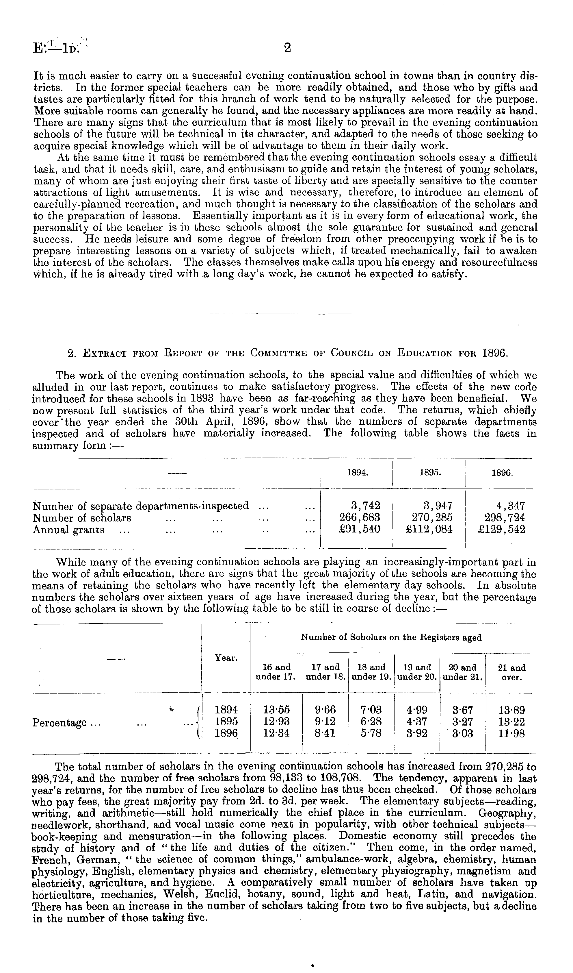 2. EXTRACT FROM BePORT OF THE COMMITTEE OP COUNCIL ON EDUCATION FOR 1896. The work of the evening continuation schools, to the special value and difficulties of which we alluded in our last report, coutinues to make satisfactory progress. The effects of the new code introduced for these schools in 1893 have been as far-reaching as they have been beneficial. We now present full statistics of the third year's work under that code. The returns, which chiefly cover'the year ended the 30th April, 1896, show that the numbers of separate departments inspected and of scholars have materially increased. The following table shows the facts in summary form : —