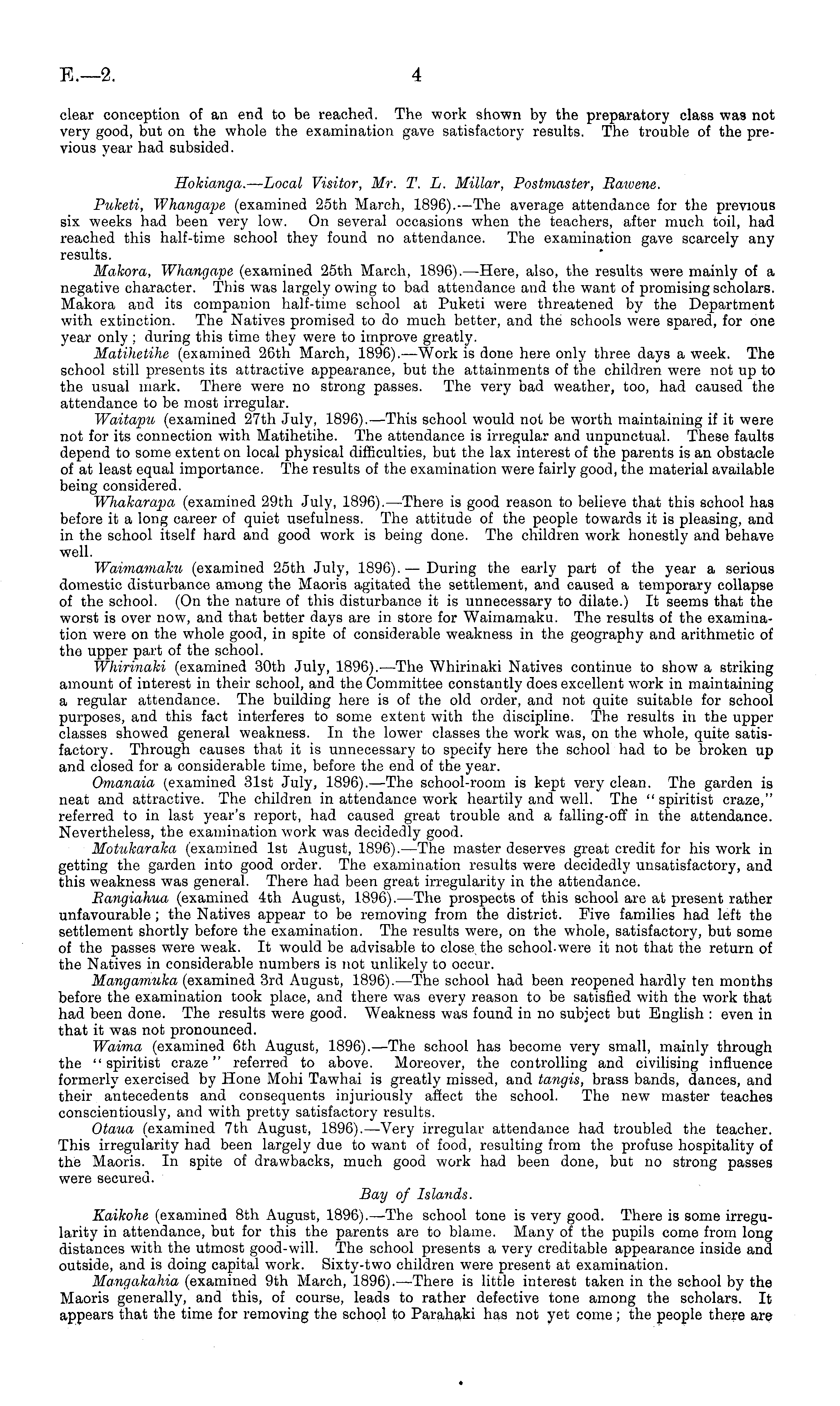 clear conception of an end to be reached. The work shown by the preparatory class was not very good, but on the whole the examination gave satisfactory results. The trouble of the previous year had subsided. Hokianga. — Local Visitor, Mr. T. L. Millar, Postmaster, Rawene. Puketi, Whangape (examined 25th March, 1896). —The average attendance for the previous six weeks had been very low. On several occasions when the teachers, after much toil, had reached this half-time school they found no attendance. The examination gave scarcely any results. Makora, Whangape (examined 25th March, 1896). —Here, also, the results were mainly of a negative character. This was largely owing to bad attendance and the want of promising scholars. Makora and its companion half-time school at Puketi were threatened by the Department with extinction. The Natives promised to do much better, and the schools were spared, for one year only : during this time they were to improve greatly. Matihetihe (examined 26th March, 1896). —Work is done here only three days a week. The school still presents its attractive appearance, but the attainments of the children were not up to the usual mark. There were no strong passes. The very bad weather, too, had caused the attendance to be most irregular. Waitapu (examined 27th July, 1896). —This school would not be worth maintaining if it were not for its connection with Matihetihe. The attendance is irregular and unpunctual. These faults depend to some extent on local physical difficulties, but the lax interest of the parents is an obstacle of at least equal importance. The results of the examination were fairly good, the material available being considered. Wliakarapa (examined 29th July, 1896). —There is good reason to believe that this school has before it a long career of quiet usefulness. The attitude of the people towards it is pleasing, and in the school itself hard and good work is being done. The children work honestly and behave well. Waimamaku (examined 25th July, 1896). — During the early part of the year a serious domestic disturbance among the Maoris agitated the settlement, and caused a temporary collapse of the school. (On the nature of this disturbance it is unnecessary to dilate.) It seems that the worst is over now, and that better days are in store for Waimamaku. The results of the examination were on the whole good, in spite of considerable weakness in the geography and arithmetic of the upper part of the school. Whirinaki (examined 30th July, 1896). —The Whirinaki Natives continue to show a striking amount of interest in their school, and the Committee constantly does excellent work in maintaining a regular attendance. The building here is of the old order, and not quite suitable for school purposes, and this fact interferes to some extent with the discipline. The results in the upper classes showed general weakness. In the lower classes the work was, on the whole, quite satisfactory. Through causes that it is unnecessary to specify here the school had to be broken up and closed for a considerable time, before the end of the year. Omanaia (examined 31st July, 1896). —The school-room is kept very clean. The garden is neat and attractive. The children in attendance work heartily and well. The "spiritist craze," referred to in last year's report, had caused great trouble and a falling-off in the attendance. Nevertheless, the examination work was decidedly good. Motukaraka (examined Ist August, 1896). —The master deserves great credit for his work in getting the garden into good order. The examination results were decidedly unsatisfactory, and this weakness was general. There had been great irregularity in the attendance. Rangiahua (examined 4th August, 1896). —The prospects of this school are at present rather unfavourable ; the Natives appear to be removing from the district. Five families had left the settlement shortly before the examination. The results were, on the whole, satisfactory, but some of the passes were weak. It would be advisable to close the school-were it not that the return of the Natives in considerable numbers is not unlikely to occur. Mangamuka (examined 3rd August, 1896). —The school had been reopened hardly ten months before the examination took place, and there was every reason to be satisfied with the work that had been done. The results were good. Weakness was found in no subject but English : even in that it was not pronounced. Waima (examined 6th August, 1896). —The school has become very small, mainly through the "spiritist craze" referred to above. Moreover, the controlling and civilising influence formerly exercised by Hone Mohi Tawhai is greatly missed, and tangis, brass bands, dances, and their antecedents and consequents injuriously affect the school. The new master teaches conscientiously, and with pretty satisfactory results. Otaua (examined 7th August, 1896). —Very irregular attendance had troubled the teacher. This irregularity had been largely due to want of food, resulting from the profuse hospitality of the Maoris. In spite of drawbacks, much good work had been done, but no strong passes were secured. Bay of Islands. Kaikohe (examined Bth August, 1896). —The school tone is very good. There is some irregularity in attendance, but for this the parents are to blame. Many of the pupils come from long distances witVi the utmost good-will. The school presents a very creditable appearance inside and outside, and is doing capital work. Sixty-two children were present at examination. Mangakahia (examined 9th March, 1896). —There is little interest taken in the school by the Maoris generally, and this, of course, leads to rather defective tone among the scholars. It appears that the time for removing the school to Parahaki has not yet come; the people there are