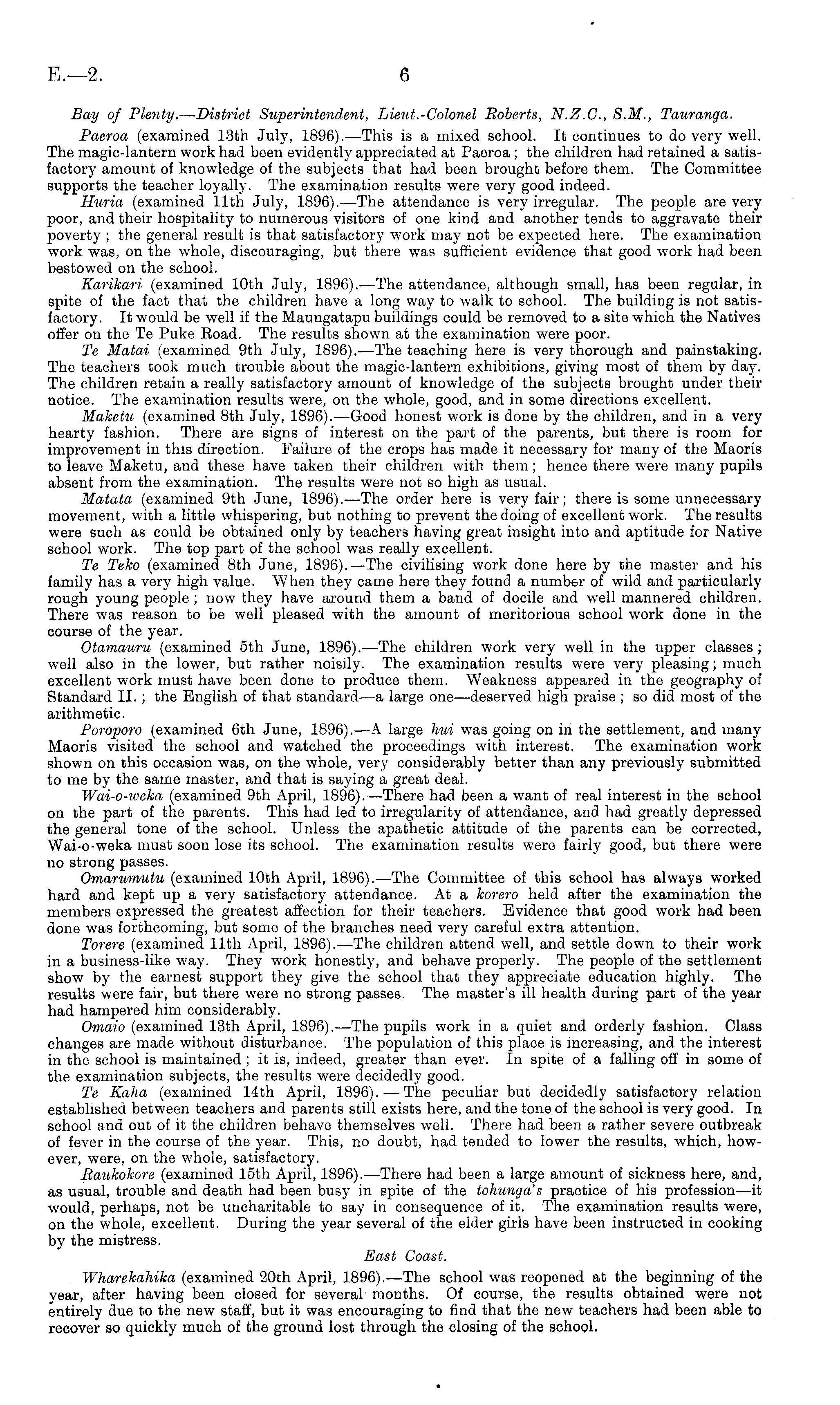 Bay of Plenty. — District Superintendent, Lieut.-Colonel Roberts, N.Z.C., S.M., Tauranga. Paeroa (examined 13th July, 1896). —This is a mixed school. It continues to do very well. The magic-lantern work had been evidently appreciated at Paeroa ; the children had retained a satisfactory amount of knowledge of the subjects that had been brought before them. The Committee supports the teacher loyally. The examination results were very good indeed. Huria (examined 11th July, 1896). —The attendance is very irregular. The people are very poor, and their hospitality to numerous visitors of one kind and another tends to aggravate their poverty ; the general result is that satisfactory work may not be expected here. The examination work was, on the whole, discouraging, but there was sufficient evidence that good work had been bestowed on the school. Karikari (examined 10th July, 1896). —The attendance, although small, has been regular, in spite of the fact that the children have a long way to walk to school. The building is not satisfactory. It would be well if the Maungatapu buildings could be removed to a site which the Natives offer on the Te Puke Road. The results shown at the examination were poor. Te Matai (examined 9th July, 1896). —The teaching here is very thorough and painstaking. The teachers took much trouble about the magic-lantern exhibitions, giving most of them by day. The children retain a really satisfactory amount of knowledge of the subjects brought under their notice. The examination results were, on the whole, good, and in some directions excellent. Maketu (examined Bth July, 1896). —Good honest work is done by the children, and in a very hearty fashion. There are signs of interest on the part of the parents, but there is room for improvement in this direction. Failure of the crops has made it necessary for many of the Maoris to leave Maketu, and these have taken their children with them; hence there were many pupils absent from the examination. The results were not so high as usual. Matata (examined 9th June, 1896). —The order here is very fair; there is some unnecessary movement, with a little whispering, but nothing to prevent the doing of excellent work. The results were such as could be obtained only by teachers having great insight into and aptitude for Native school work. The top part of the school was really excellent. Te Teko (examined Bth June, 1896). —The civilising work done here by the master and his family has a very high value. When they came here they found a number of wild and particularly rough young people ; now they have around them a band of docile and well mannered children. There was reason to be well pleased with the amount of meritorious school work done in the course of the year. Otamauru (examined sth June, 1896). —The children work very well in the upper classes ; well also in the lower, but rather noisily. The examination results were very pleasing; much excellent work must have been done to produce them. Weakness appeared in the geography of Standard II.; the English of that standard—a large one—deserved high praise ;so did most of the arithmetic. Poroporo (examined 6th June, 1896). —A large hut was going on in the settlement, and many Maoris visited the school and watched the proceedings with interest. The examination work shown on this occasion was, on the wdiole, very considerably better than any previously submitted to me by the same master, and that is saying a great deal. Wai-o-weka (examined 9th April, 1896). —There had been a want of real interest in the school on the part of the parents. This had led to irregularity of attendance, and had greatly depressed the general tone of the school. Unless the apathetic attitude of the parents can be corrected, Wai-o-weka must soon lose its school. The examination results were fairly good, but there were no strong passes. Omarumutu (examined 10th April, 1896). —The Committee of this school has always worked hard and kept up a very satisfactory attendance. At a korero held after the examination the members expressed the greatest affection for their teachers. Evidence that good work had been done was forthcoming, but some of the branches need very careful extra attention. Torere (examined 11th April, 1896). —The children attend well, and settle down to their work in a business-like way. They work honestly, and behave properly. The people of the settlement show by the earnest support they give the school that they appreciate education highly. The results were fair, but there were no strong passes. The master's ill health during part of the year had hampered him considerably. Omaio (examined 13th April, 1896). —The pupils work in a quiet and orderly fashion. Class changes are made without disturbance. The population of this place is increasing, and the interest in the school is maintained ;it is, indeed, greater than ever. In spite of a falling off in some of the examination subjects, the results were decidedly good. Te Kaha (examined 14th April, 1896). — The peculiar but decidedly satisfactory relation established between teachers and parents still exists here, and the tone of the school is very good. In school and out of it the children behave themselves well. There had been a rather severe outbreak of fever in the course of the year. This, no doubt, had tended to lower the results, which, however, were, on the whole, satisfactory. Raukokore (examined 15th April, 1896). —There had been a large amount of sickness here, and, as usual, trouble and death had been busy in spite of the tohunga's practice of his profession—it would, perhaps, not be uncharitable to say in consequence of it. The examination results were, on the whole, excellent. During the year several of the elder girls have been instructed in cooking by the mistress. East Coast. Wharekahika (examined 20th April, 1896). —The school was reopened at the beginning of the year, after having been closed for