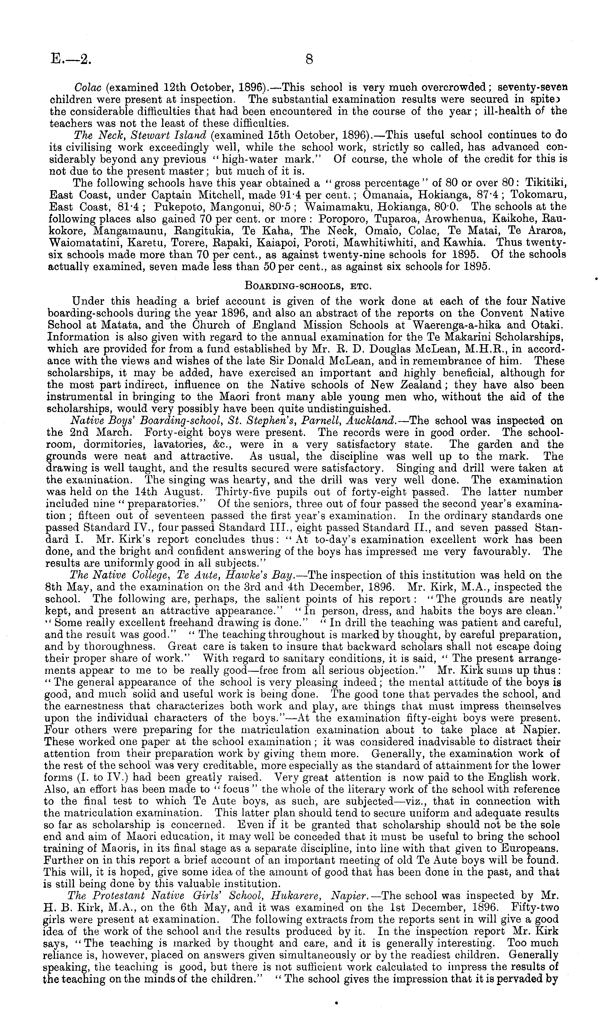 Golac (examined 12th October, 1896). —This school is very much overcrowded; seventy-seven children were present at inspection. The substantial examination results were secured in spite} the considerable difficulties that had been encountered in the course of the year ; ill-health of the teachers was not the least of these difficulties. The Neck, Stewart Island (examined 15th October, 1896). —This useful school continues to do its civilising work exceedingly well, while the school work, strictly so called, has advanced considerably beyond any previous " high-water mark." Of course, the whole of the credit for this is not due to the present master; but much of it is. The following schools have this year obtained a " gross percentage " of 80 or over 80 : Tikitiki, East Coast, under Captain Mitchell, made 914 per cent.; Omanaia, Hokianga, 87"4 ; Tokomaru, East Coast, 81-4 ; Pukepoto, Mangonui, 80-5 ; Waimamaku, Hokianga, 800. The schools at the following places also gained 70 per cent, or more : Poroporo, Tuparoa, Arowhenua, Kaikohe, Raukokore, Mangainaunu, Rangitukia, Te Kaha, The Neck, Omaio, Colac, Te Matai, Te Araroa, Waiomatatini, Karetu, Torere, Rapaki, Kaiapoi, Poroti, Mawhitiwhiti, and Kawhia. Thus twentysix schools made more than 70 per cent., as against twenty-nine schools for 1895. Of the schools actually examined, seven made less than 50per cent., as against six schools for 1895. Boarding-schools, etc. Under this heading a brief account is given of the work done at each of the four Native boarding-schools during the year 1896, and also an abstract of the reports on the Convent Native School at Matata, and the Church of England Mission Schools at Waerenga-a-hika and Otaki. Information is also given with regard to the annual examination for the Te Makarini Scholarships, which are provided for from a fund established by Mr. R. D. Douglas McLean, M.H.R., in accordance with the views and wishes of the late Sir Donald McLean, and in remembrance of him. These scholarships, it may be added, have exercised an important and highly beneficial, although for the most part indirect, influence on the Native schools of New Zealand; they have also been instrumental in bringing to the Maori front many able young men who, without the aid of the scholarships, would very possibly have been quite undistinguished. Native Boys' Boarding-school, St. Stephen's, Parnell, Auckland. —The school was inspected on the 2nd March. Forty-eight boys were present. The records were in good order. The schoolroom, dormitories, lavatories, &c, were in a very satisfactory state. The garden and the grounds were neat and attractive. As usual, the discipline was well up to the mark. The drawing is well taught, and the results secured were satisfactory. Singing and drill were taken at the examination. The singing was hearty, and the drill was very well done. The examination was held on the 14th August. Thirty-five pupils out of forty-eight passed. The latter number included nine " preparatories." Of the seniors, three out of four passed the second year's examination ; fifteen out of seventeen passed the first year's examination. In the ordinary standards one passed Standard IV., four passed Standard 111., eight passed Standard 11., and seven passed Standard I. Mr. Kirk's report concludes thus: "At to-day's examination excellent work has been done, and the bright and confident answering of the boys has impressed me very favourably. The results are uniformly good in all subjects." The Native College, Te Aute, Hawke's Bay. —The inspection of this institution was held on the Bth May, and the examination on the 3rd and 4th December, 1896. Mr. Kirk, M.A., inspected the school. The following are, perhaps, the salient points of his report : " The grounds are neatly kept, and present an attractive appearance." "In person, dress, and habits the boys are clean." " Some really excellent freehand drawing is done." "In drill the teaching was patient and careful, and the result was good." " The teaching throughout is marked by thought, by careful preparation, and by thoroughness. Great care is taken to insure that backward scholars shall not escape doing their proper share of work." With regard to sanitary conditions, it is said, " The present arrangements appear to me to be really good—free from all serious objection." Mr. Kirk sums up thus : " The general appearance of the school is very pleasing indeed; the mental attitude of the boys is good, and much solid and useful work is being done. The good tone that pervades the school, and the earnestness that characterizes both work and play, are things that must impress themselves upon the individual characters of the boys."—At the examination fifty-eight boys were present. Four others were preparing for the matriculation examination about to take place at Napier. These worked one paper at the school examination ; it was considered inadvisable to distract their attention from their preparation work by giving them more. Generally, the examination work of the rest of the school was very creditable, more especially as the standard of attainment for the lower forms (I. to IV.) had been greatly raised. Very great attention is now paid to the English work. Also, an effort has been made to " focus " the whole of the literary work of the school with reference to the final test to which Te Aute boys, as such, are subjected—viz., that in connection with the matriculation examination. This latter plan should tend to secure uniform and adequate results so far as scholarship is concerned. Even if it be granted that scholarship should not be the sole end and aim of Maori education, it may well be conceded that it must be useful to bring the school training of Maoris, in its final stage as a separate discipline, into line with that given to Europeans. Further on in this report a brief account of an important meeting of old Te Aute boys will be found. This will, it is hoped, give some idea of t
