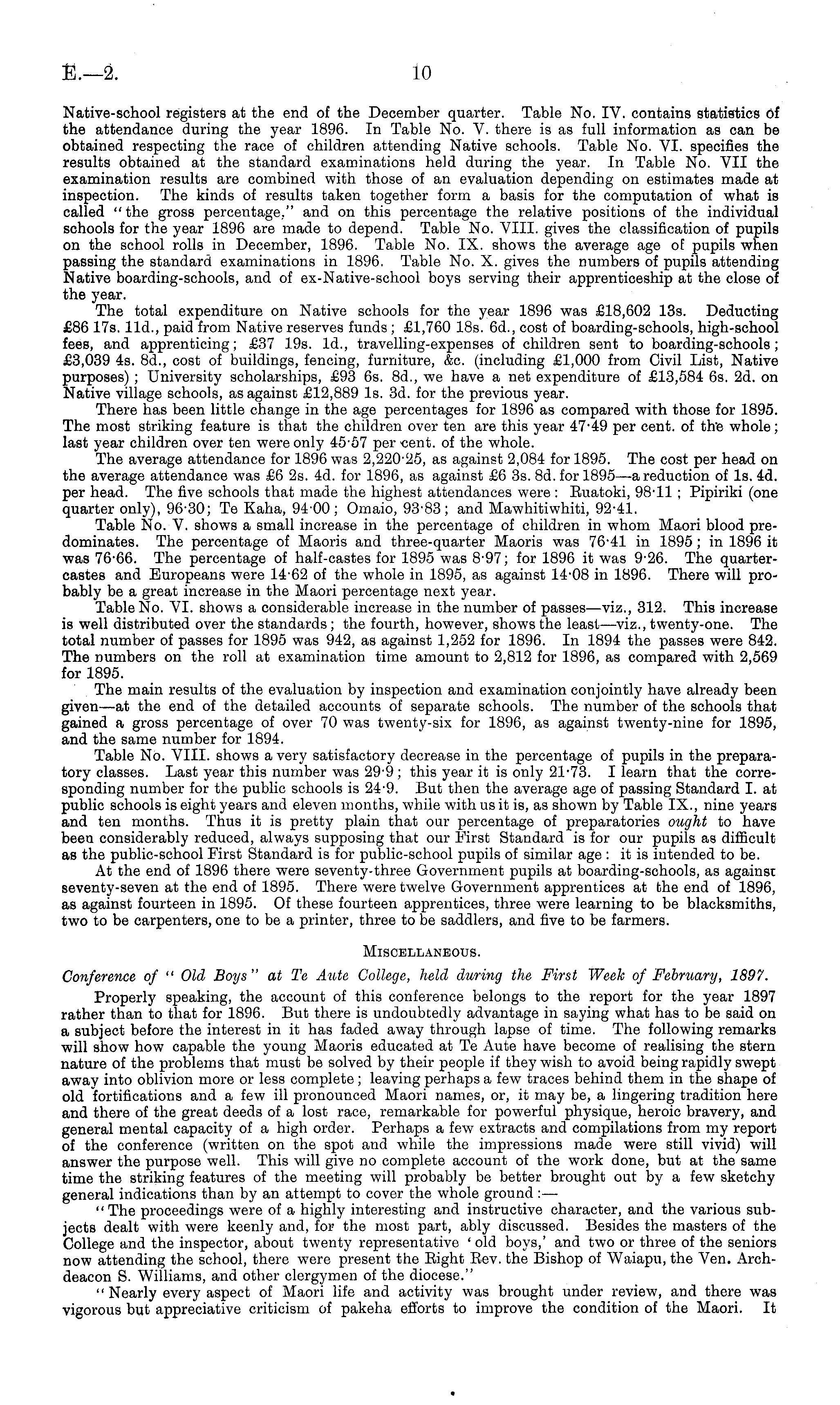 Native-school registers at the end of the December quarter. Table No. IV. contains statistics of the attendance during the year 1896. In Table No. V. there is as full information as can be obtained respecting the race of children attending Native schools. Table No. VI. specifies the results obtained at the standard examinations held during the year. In Table No. VII the examination results are combined with those of an evaluation depending on estimates made at inspection. The kinds of results taken together form a basis for the computation of what is called "the gross percentage," and on this percentage the relative positions of the individual schools for the year 1896 are made to depend. Table No. VIII. gives the classification of pupils on the school rolls in December, 1896. Table No. IX. shows the average age of pupils when passing the standard examinations in 1896. Table No. X. gives the numbers of pupils attending Native boarding-schools, and of ex-Native-school boys serving their apprenticeship at the close of the year. The total expenditure on Native schools for the year 1896 was £18,602 13s. Deducting £86 17s. lid., paid from Native reserves funds ; £1,760 18s. 6d., cost of boarding-schools, high-school fees, and apprenticing; £37 19s. Id., travelling-expenses of children sent to boarding-schools; £3,039 4s. Bd., cost of buildings, fencing, furniture, &c. (including £1,000 from Civil List, Native purposes) ; University scholarships, £93 6s. Bd., we have a net expenditure of £13,584 6s. 2d. on Native village schools, as against £12,889 Is. 3d. for the previous year. There has been little change in the age percentages for 1896 as compared with those for 1895. The most striking feature is that the children over ten are this year 47-49 per cent, of the whole; last year children over ten were only 45-57 per cent, of the whole. The average attendance for 1896 was 2,220-25, as against 2,084 for 1895. The cost per head on the average attendance was £6 2s. 4d. for 1896, as against £6 3s. Bd. for 1895 —a reduction of Is. 4d. per head. The five schools that made the highest attendances were : Ruatoki, 98T1 ; Pipiriki (one quarter only), 96-30; Te Kaha, 94-00; Omaio, 93-83; and Mawhitiwhiti, 92-41. Table No. V. shows a small increase in the percentage of children in whom Maori blood predominates. The percentage of Maoris and three-quarter Maoris was 76-41 in 1895 ; in 1896 it was 76-66. The percentage of half-castes for 1895 was 8-97; for 1896 it was 9-26. The quartercastes and Europeans were 14-62 of the whole in 1895, as against 14-08 in 1896. There will probably be a great increase in the Maori percentage next year. Table No. VI. shows a considerable increase in the number of passes—viz., 312. This increase is well distributed over the standards ; the fourth, however, shows the least—viz., twenty-one. The total number of passes for 1895 was 942, as against 1,252 for 1896. In 1894 the passes were 842. The numbers on the roll at examination time amount to 2,812 for 1896, as compared with 2,569 for 1895. The main results of the evaluation by inspection and examination conjointly have already been given—at the end of the detailed accounts of separate schools. The number of the schools that gained a gross percentage of over 70 was twenty-six for 1896, as against twenty-nine for 1895, and the same number for 1894. Table No. VIII. shows a very satisfactory decrease in the percentage of pupils in the preparatory classes. Last year this number was 29-9; this year it is only 21-73. I learn that the corresponding number for the public schools is 24-9. But then the average age of passing Standard I. at public schools is eight years and eleven months, while with us it is, as shown by Table IX., nine years and ten months. Thus it is pretty plain that our percentage of preparatories ought to have been considerably reduced, always supposing that our First Standard is for our pupils as difficult as the public-school First Standard is for public-school pupils of similar age : it is intended to be. At the end of 1896 there were seventy-three Government pupils at boarding-schools, as against seventy-seven at the end of 1895. There were twelve Government apprentices at the end of 1896, as against fourteen in 1895. Of these fourteen apprentices, three were learning to be blacksmiths, two to be carpenters, one to be a printer, three to be saddlers, and five to be farmers. Miscellaneous. Conference of " Old Boys" at Te Aute College, held during the First Week of February, 1897. Properly speaking, the account of this conference belongs to the report for the year 1897 rather than to that for 1896. But there is undoubtedly advantage in saying what has to be said on a subject before the interest in it has faded away through lapse of time. The following remarks will show how capable the young Maoris educated at Te Aute have become of realising the stern nature of the problems that must be solved by their people if they wish to avoid being rapidly swept away into oblivion more or less complete ; leaving perhaps a few traces behind them in the shape of old fortifications and a few ill pronounced Maori names, or, it may be, a lingering tradition here and there of the great deeds of a lost race, remarkable for powerful physique, heroic bravery, and general mental capacity of a high order. Perhaps a few extracts and compilations from my report of the conference (written on the spot and while the impressions made were still vivid) will answer the purpose well. This will give no complete account of the work done, but at the same time the striking features of the meeting will probably be better brought out by a few sketchy general indications than by an attempt to cover the whole ground : — "The proceedings were of a highly interesting and instructive character, and the various subjects dealt with were keenly and, for the most part, ably discussed. Besides the masters of the College and the inspector, ab