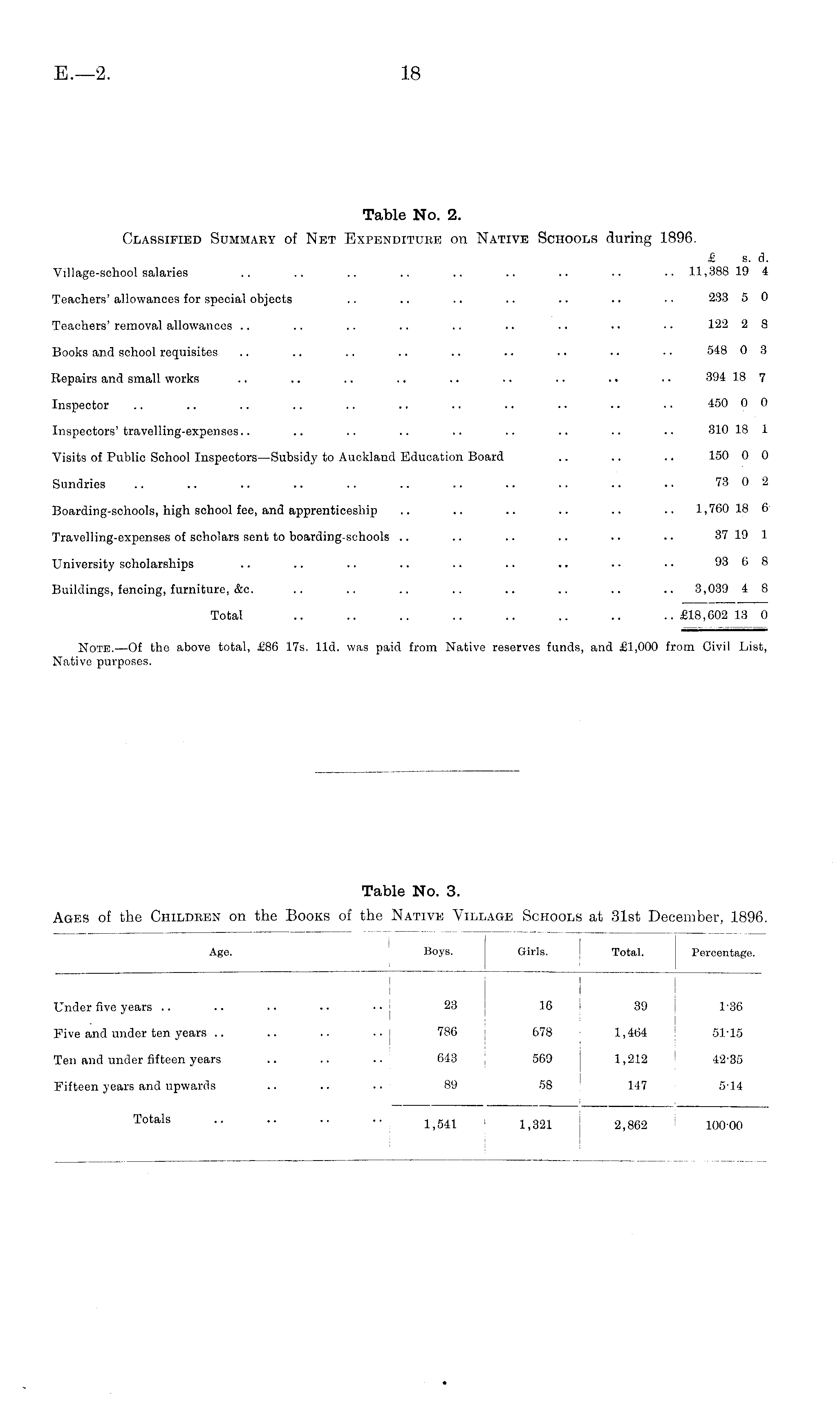 Table No. 2. Classified Summary of Net Expenditube on Native Schools during 1896. £ s. d. Village-school salaries .. .. .. .. .. .. .. .. .. 11,388 19 4 Teachers' allowances for special objects .. .. .. .. .. .. •. 233 5 0 Teachers' removal allowances .. .. .. .. .. .. .. .. • • 122 2 8 Books and school requisites .. .. .. .. .. .. .. .. ■ • 548 0 3 Repairs and small works .. .. .. .. .. .. .. .. .. 394 18 7 Inspector .. .. .. .. .. .. .. .. .. .. ■ • 450 0 0 Inspectors'travelling-expenses.. .. .. .. .. .. .. .. .. 310 18 1 Visits of Public School Inspectors—Subsidy to Auckland Education Board .. .. .. 150 0 0 Sundries .. .. .. .. .. .. .. .. .. .. .. 73 0 2 Boarding-schools, high school fee, and apprenticeship .. .. .. .. .. -. 1,760 18 6 Travelling-expenses of scholars sent to boarding-schools .. .. .. .. .. .. 37 19 1 University scholarships .. .. .. .. .. .. .. . • • ■ 93 6 8 Buildings, fencing, furniture, &c. .. .. .. .. .. .. .. .. 3,039 4 8 Total .. .. .. .. .. .. .. .. £18,602 13 0 Note.—Of the above total, £86 17s. lid. was paid from Native reserves funds, and £1,000 from Civil List, Native purposes.